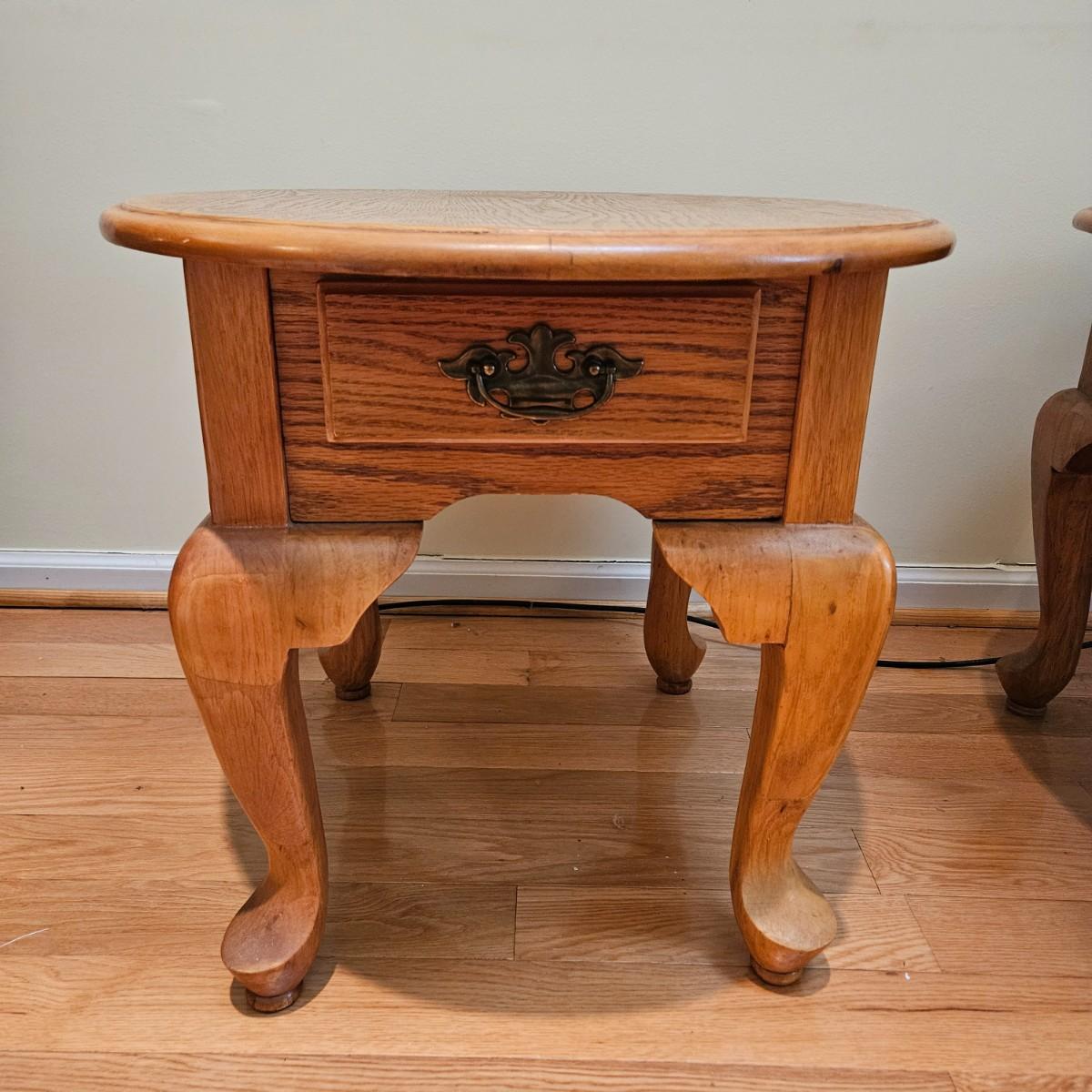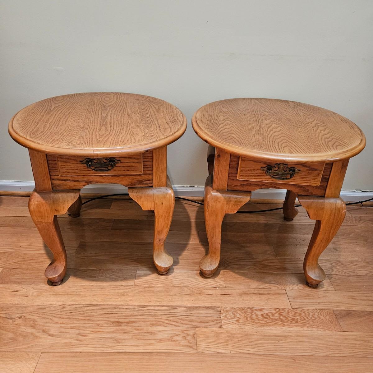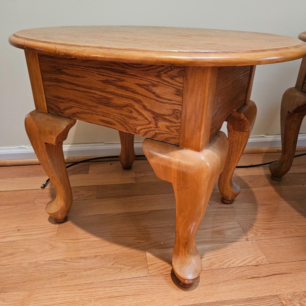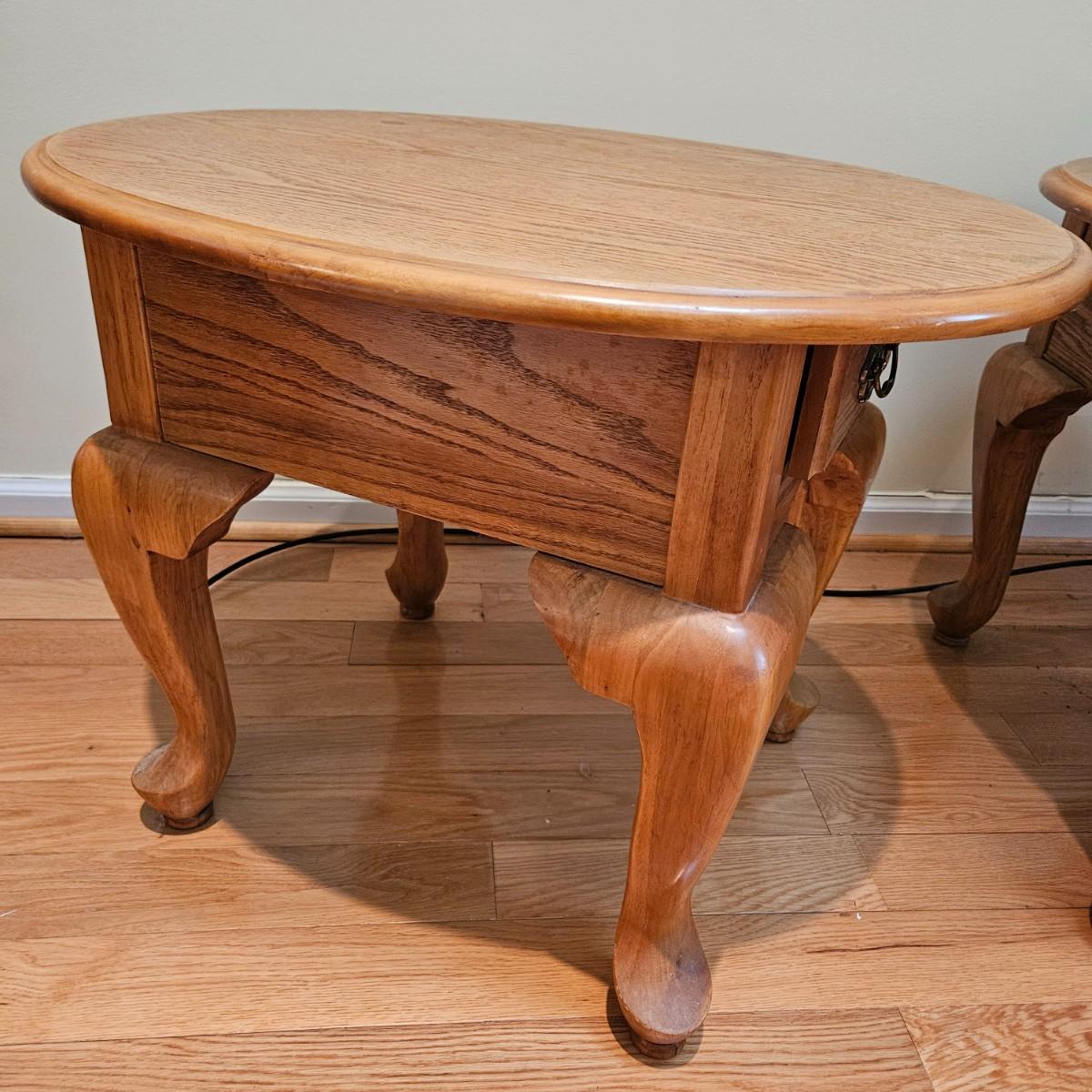 A pair of oval oak side tables with a single drawer and brass hardware. They both measure approximately 22" x 27" x 21"H. Local pickup only