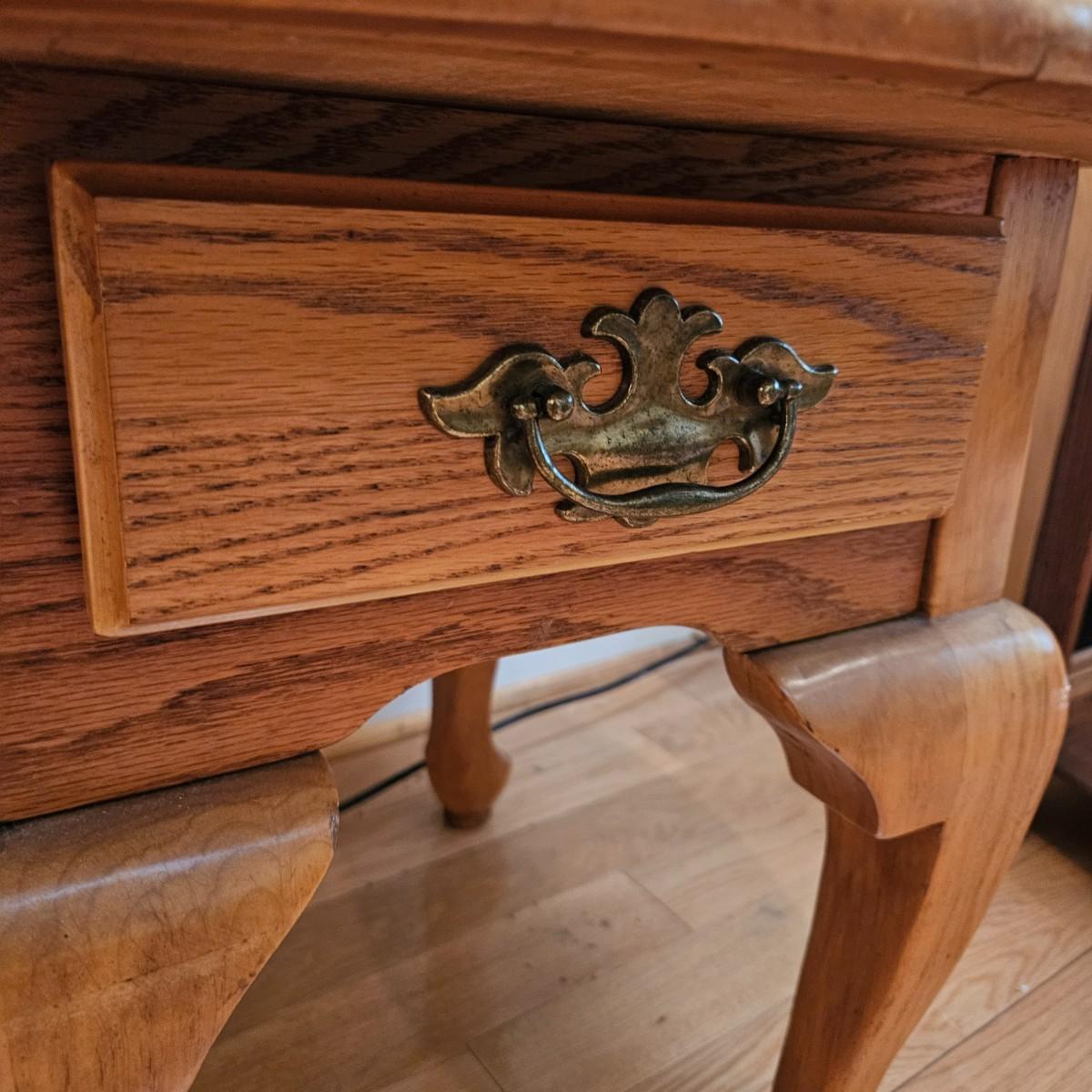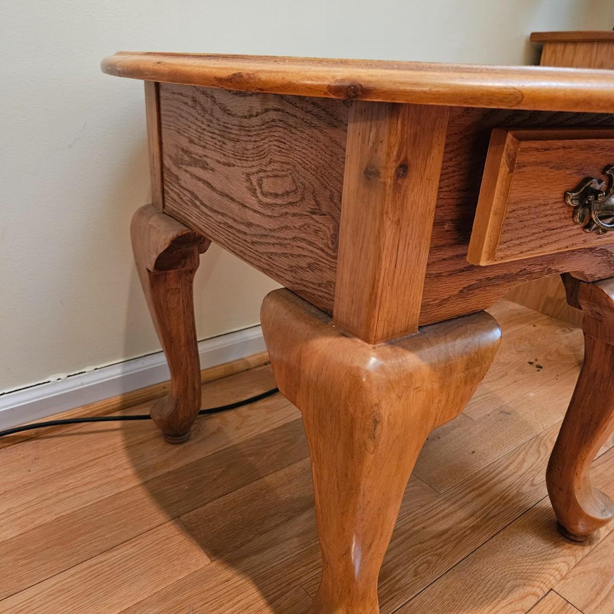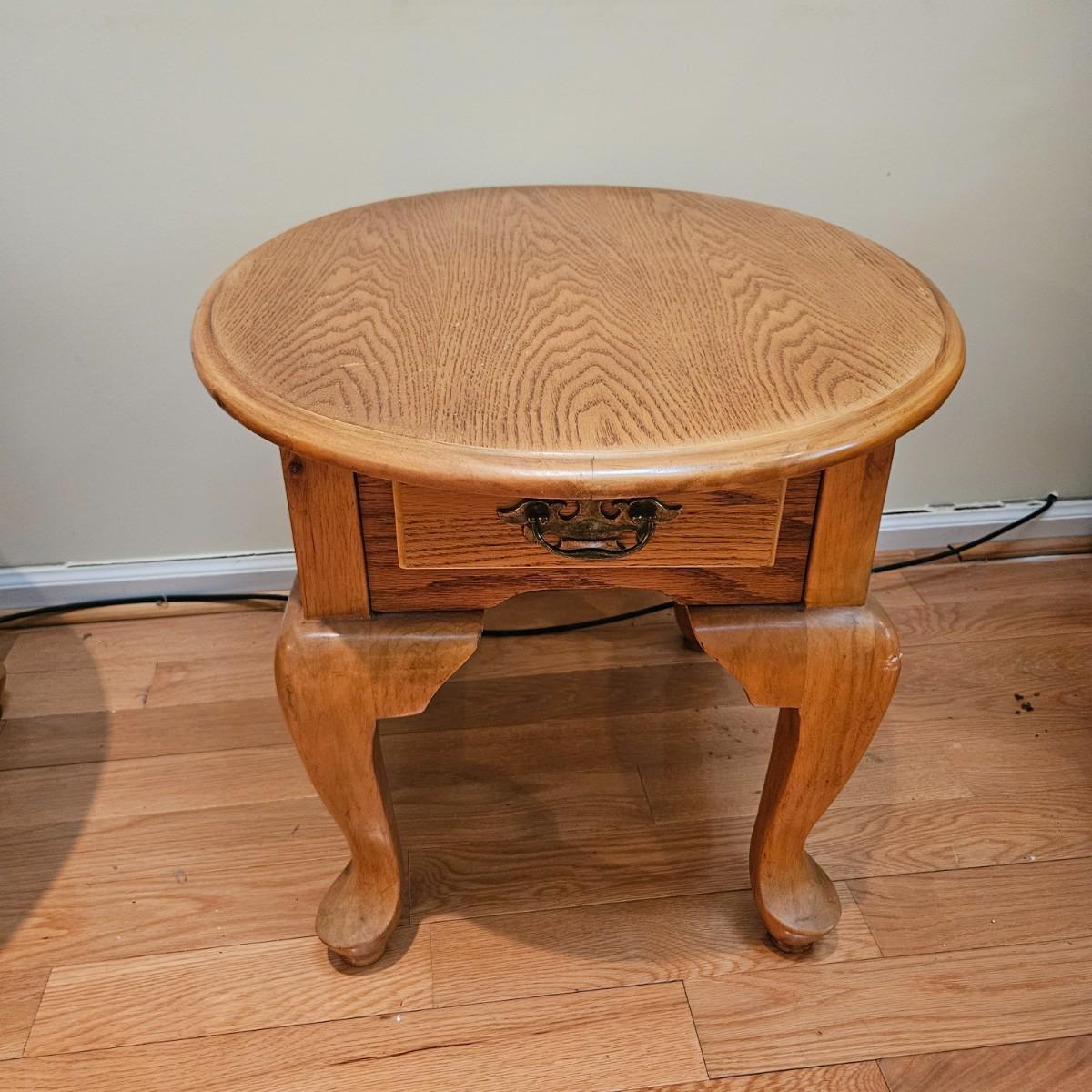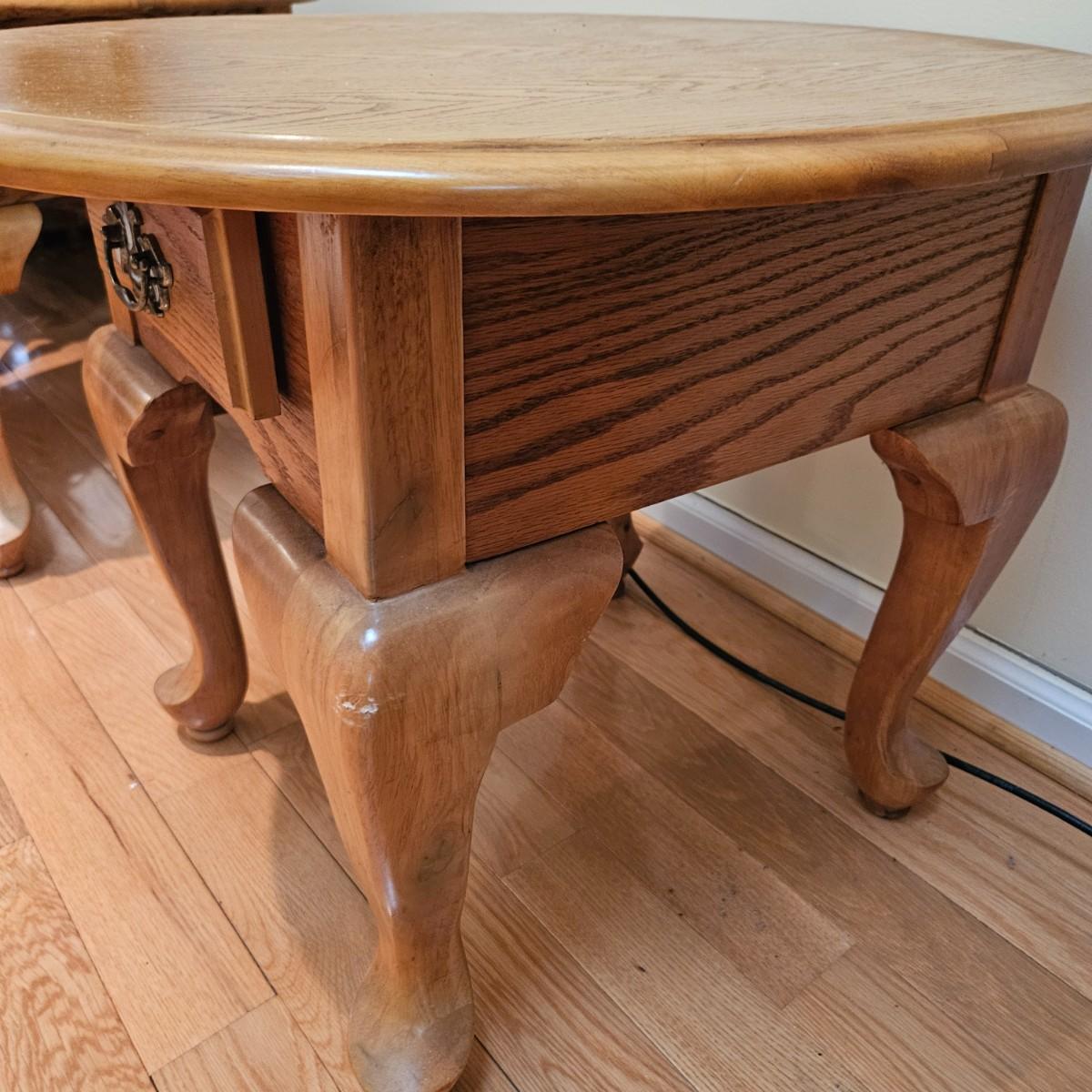 A pair of oval oak side tables with a single drawer and brass hardware. They both measure approximately 22" x 27" x 21"H. Local pickup only