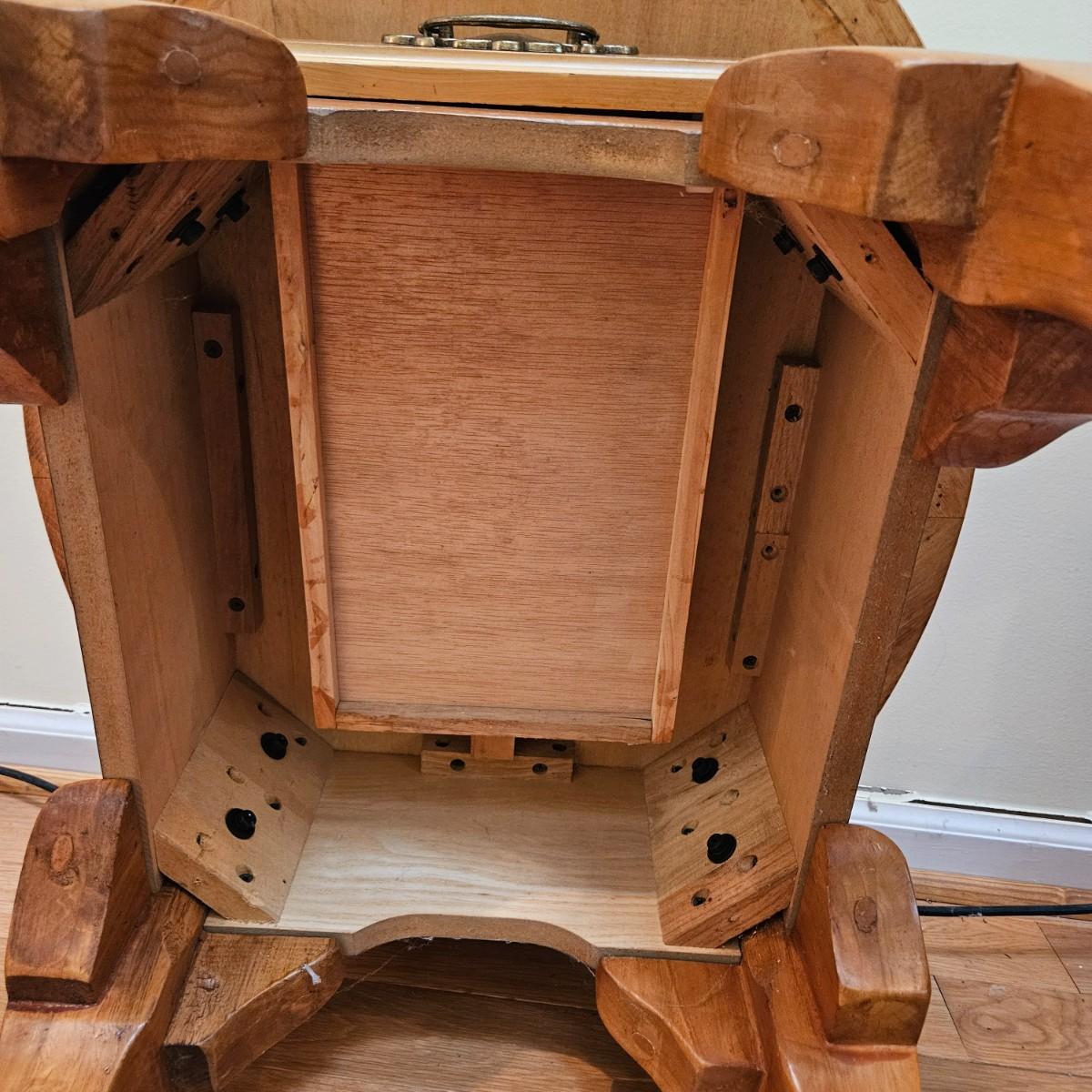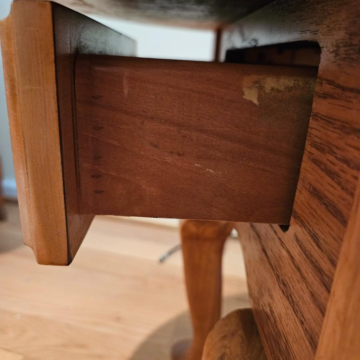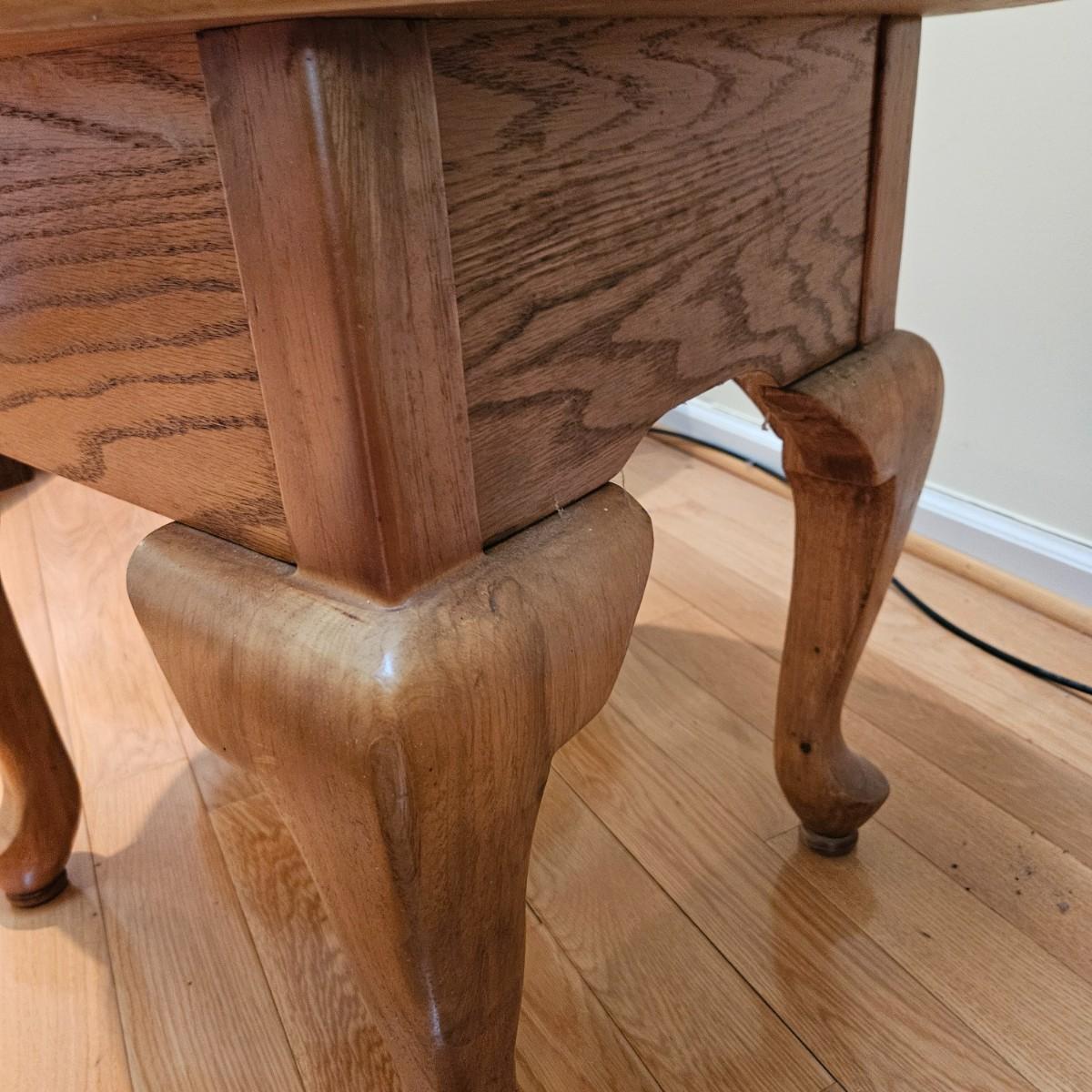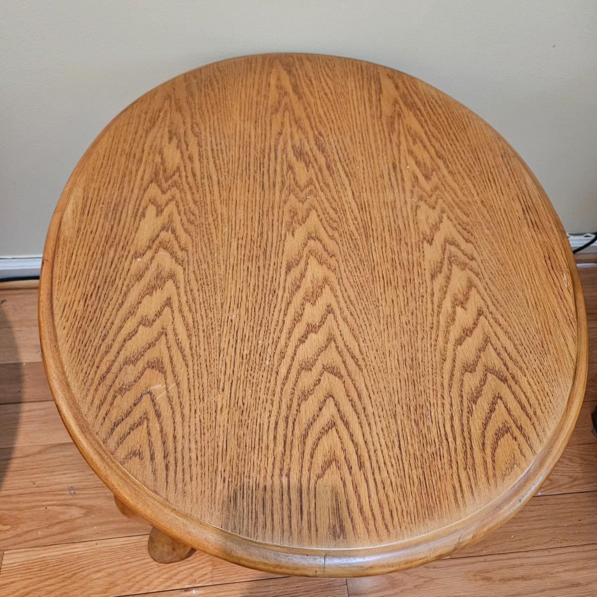 A pair of oval oak side tables with a single drawer and brass hardware. They both measure approximately 22" x 27" x 21"H. Local pickup only