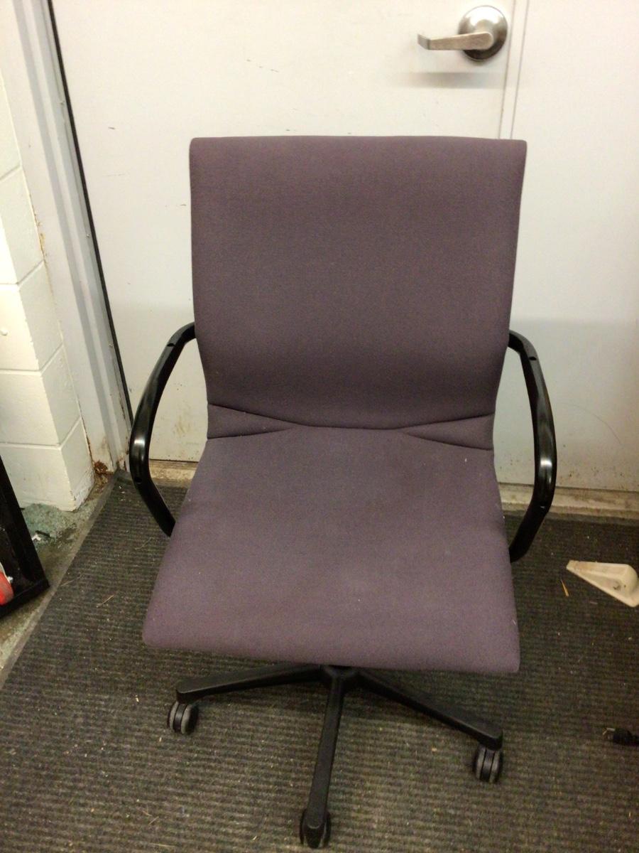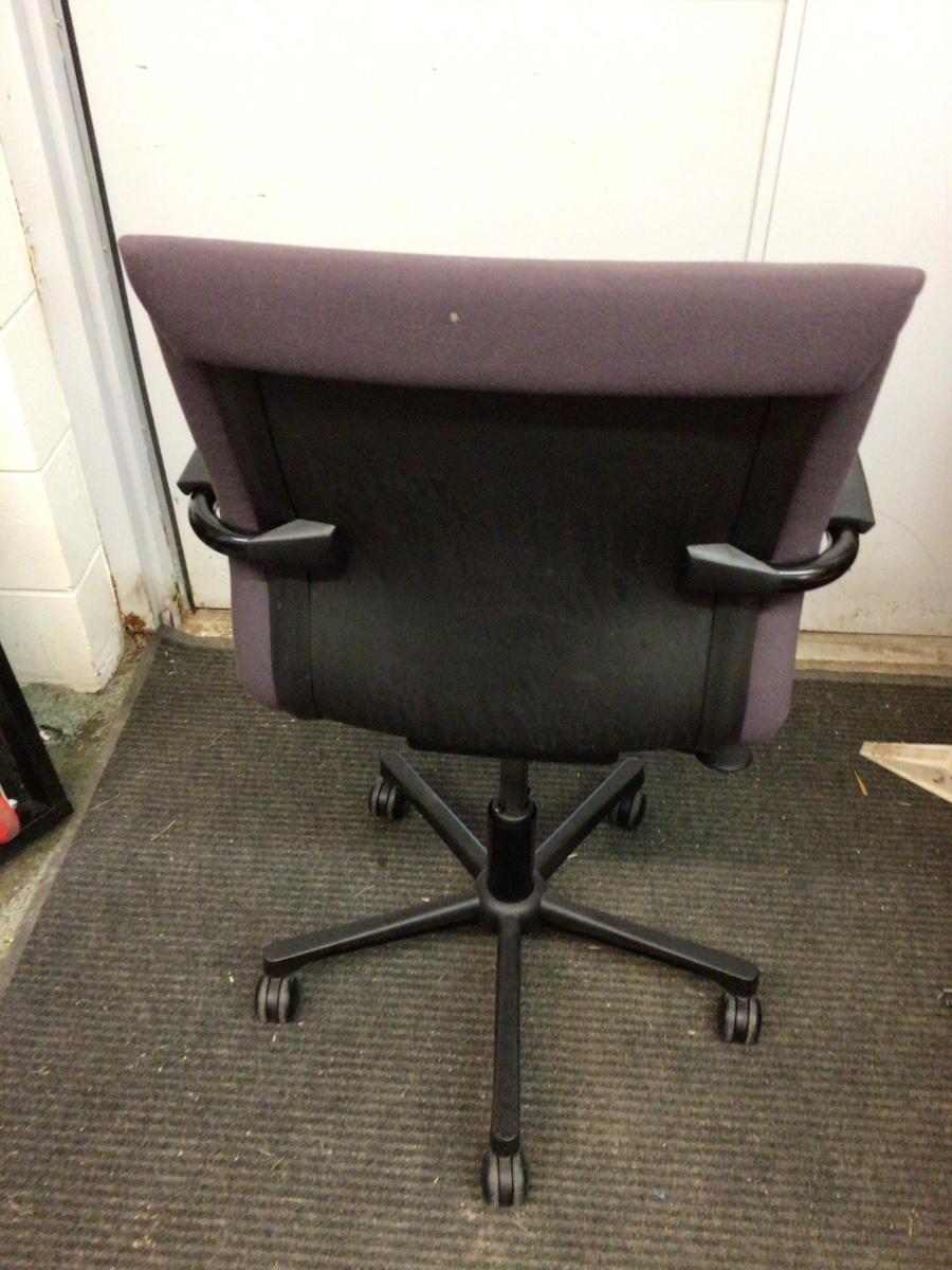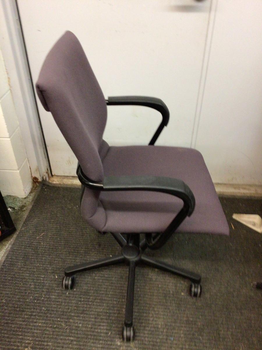 This is a great set of office chairs, it has purple fabrics with steal frame and one has plastic arm res the other the arm rests are missing. They both swivel, adjust up and down, and is on rollers for easy movement.