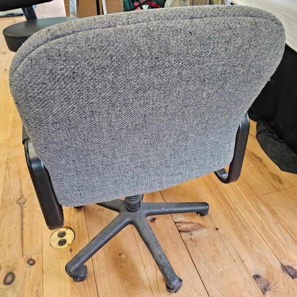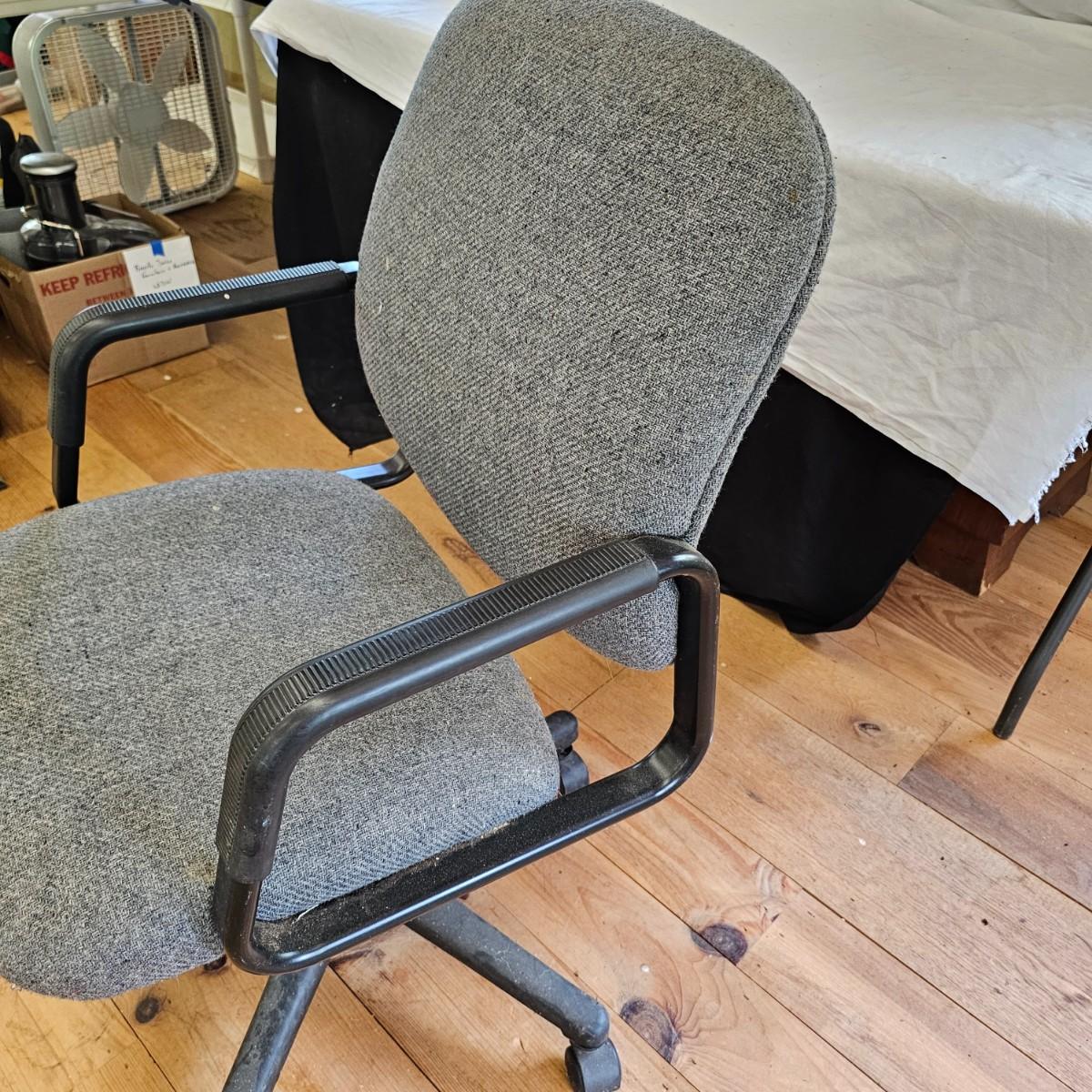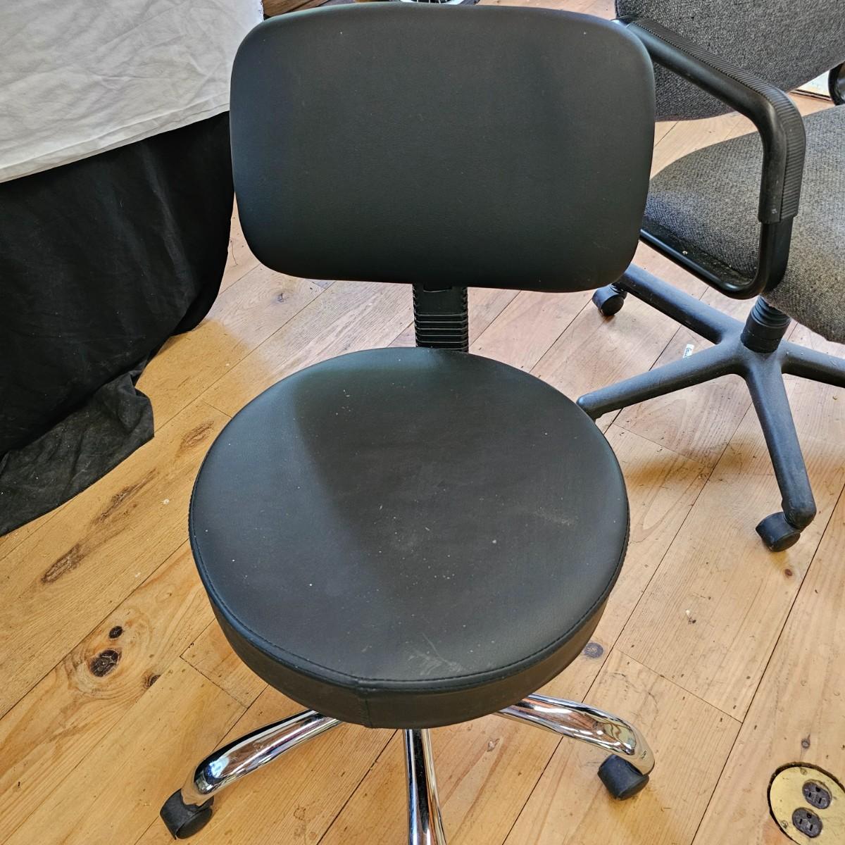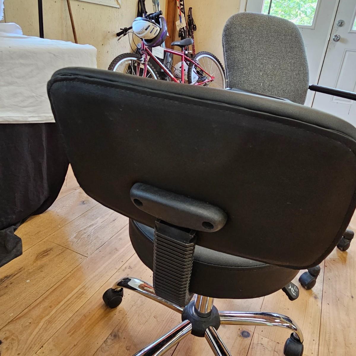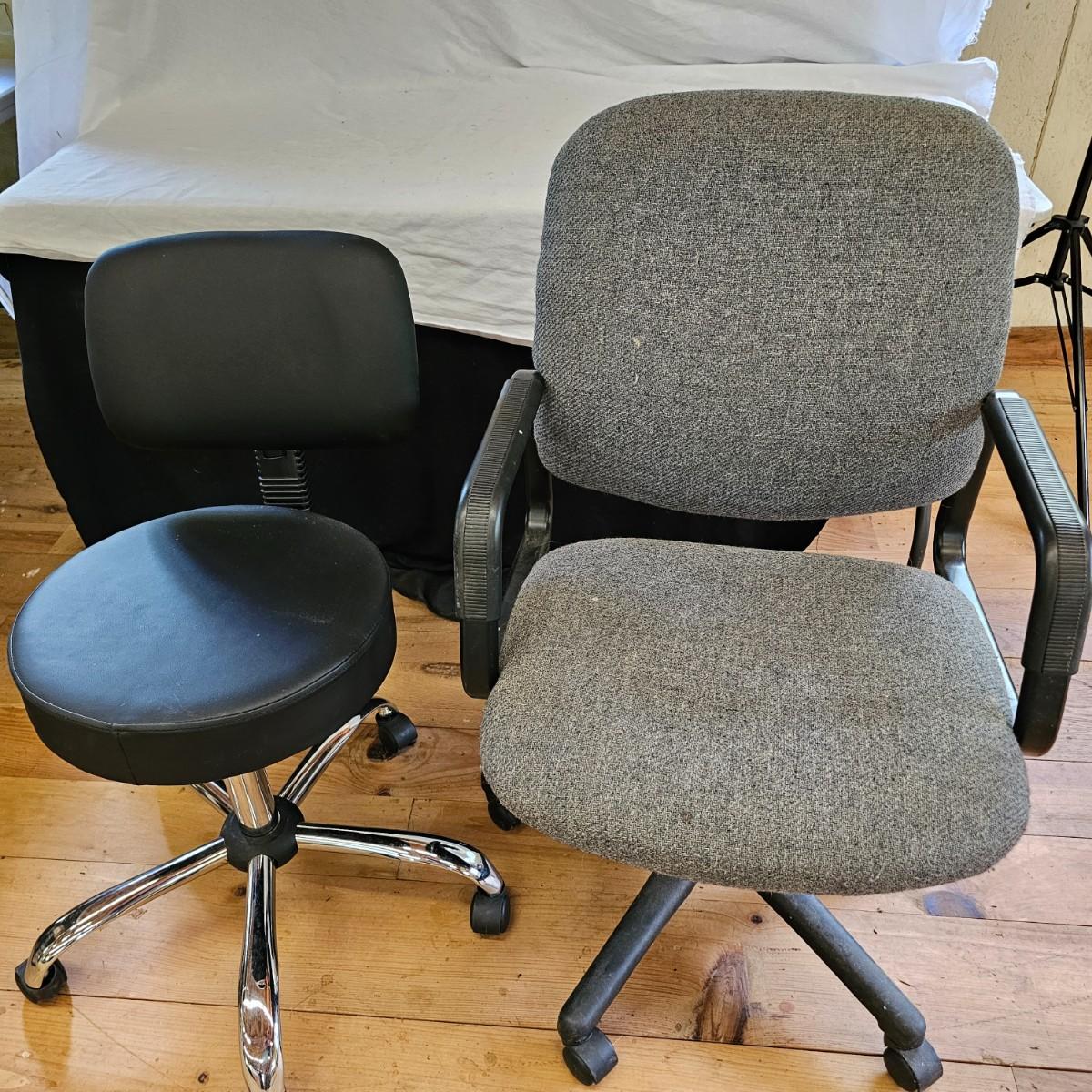 Two office chairs, one black, one grey. Black chair has round padded seat and padded back, chrome base and roller wheels. 22" x 21" x 31"H, the seat is adjustable from 20" to 26" height. Grey chair has upholstered seat and back, plastic arms. Base has five legs with rolling casters. Chair measures 23" x 26" x 37"H, has seat height of 19". Some minor blemishes on upholstery. See photos for details. Local pickup only.
