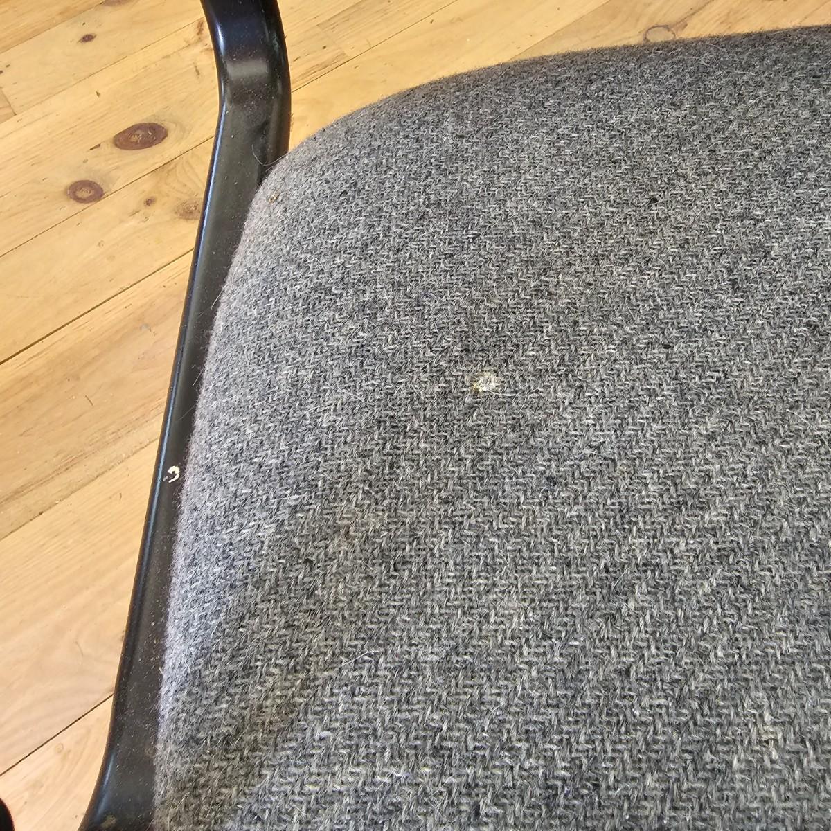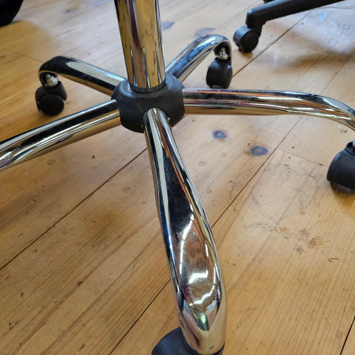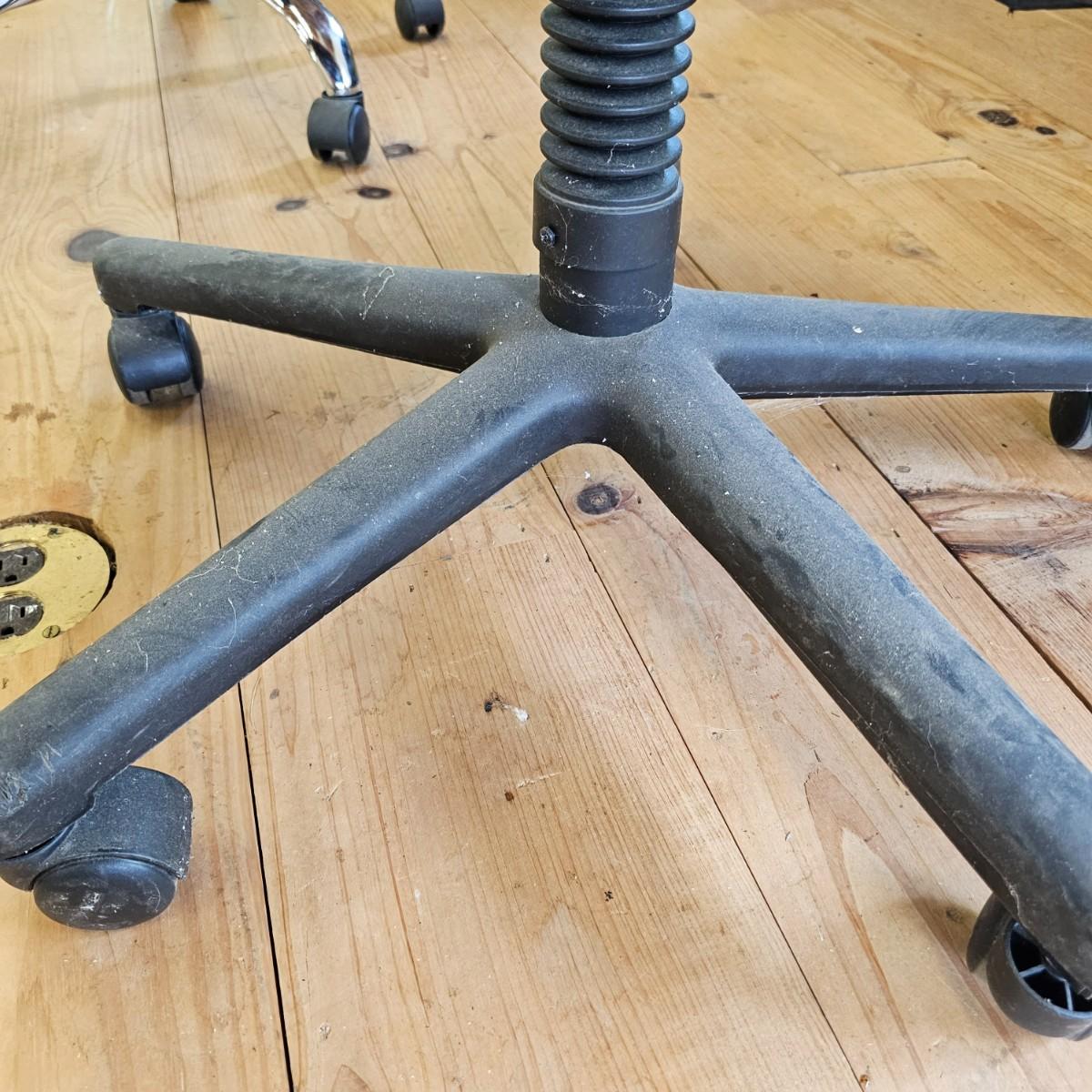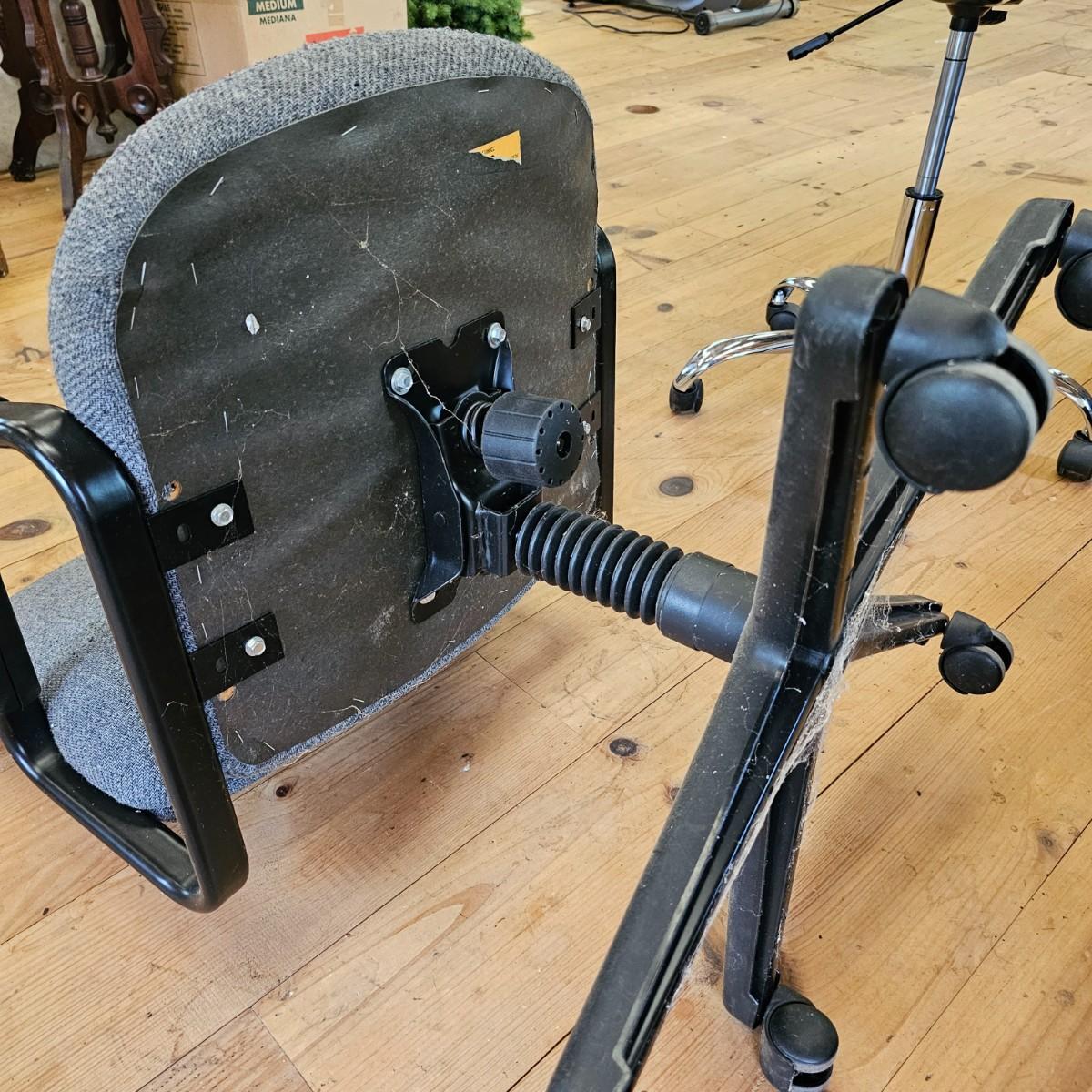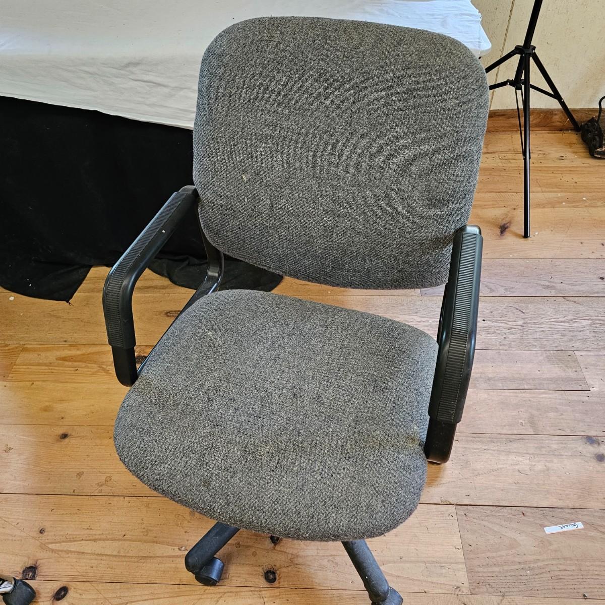 Two office chairs, one black, one grey. Black chair has round padded seat and padded back, chrome base and roller wheels. 22" x 21" x 31"H, the seat is adjustable from 20" to 26" height. Grey chair has upholstered seat and back, plastic arms. Base has five legs with rolling casters. Chair measures 23" x 26" x 37"H, has seat height of 19". Some minor blemishes on upholstery. See photos for details. Local pickup only.