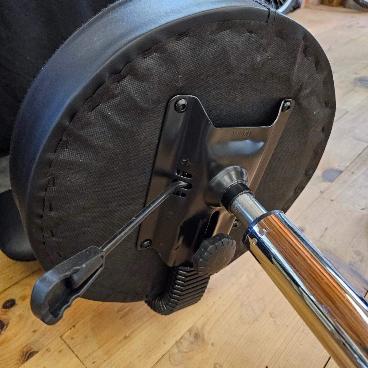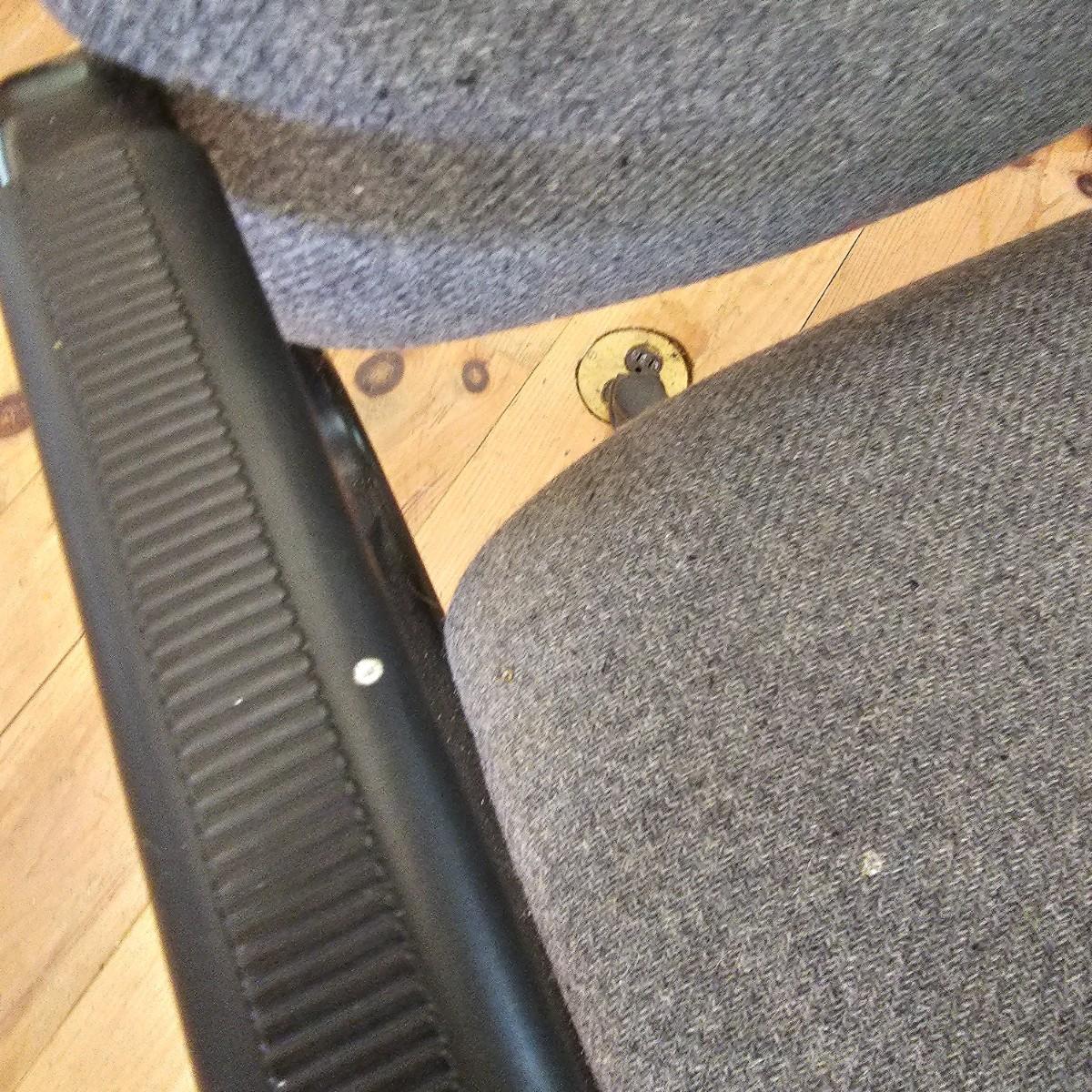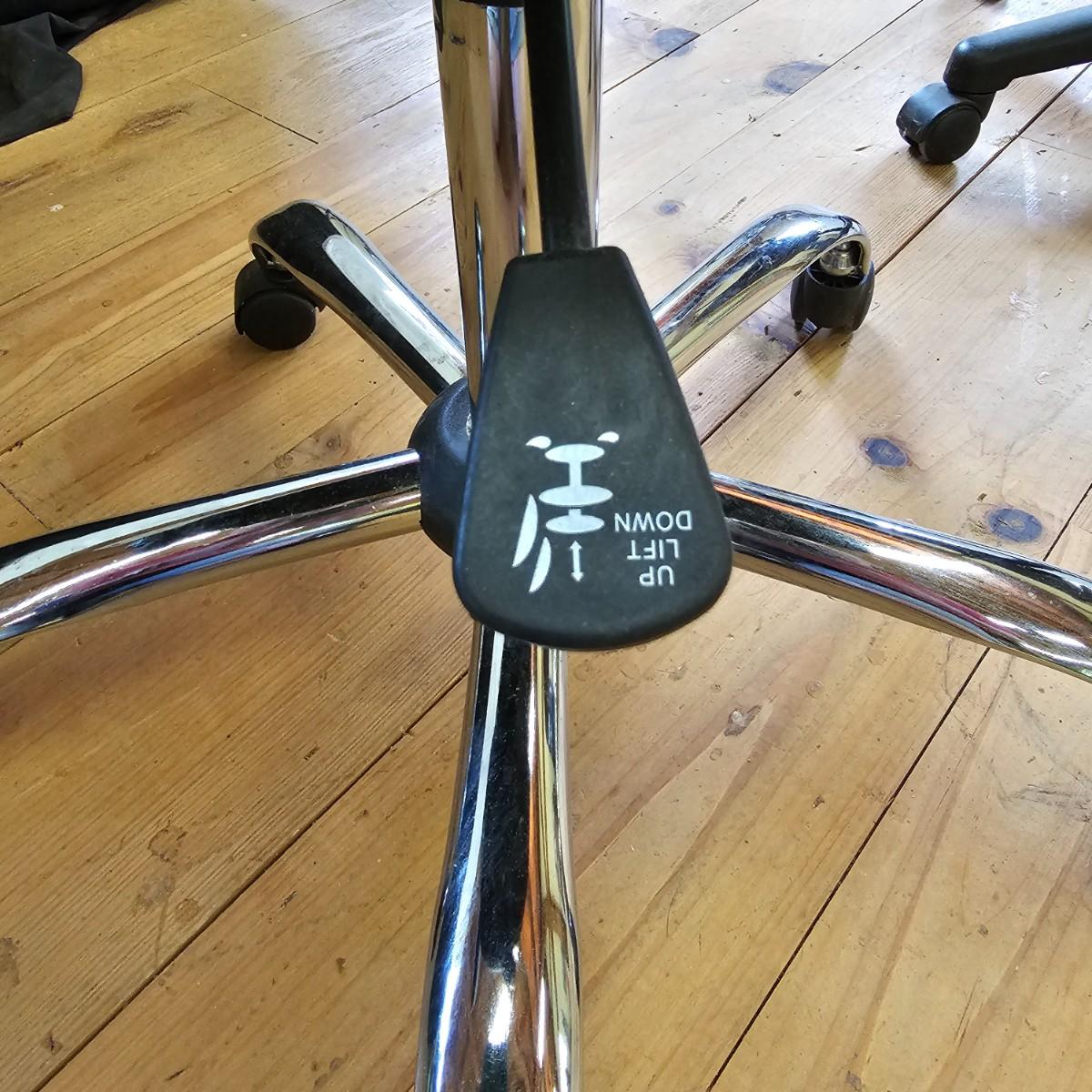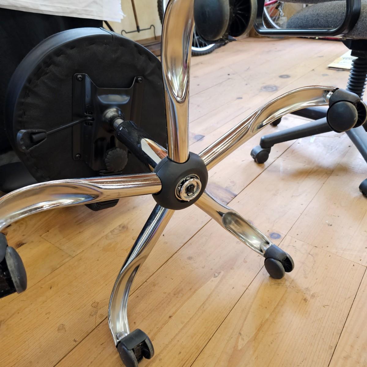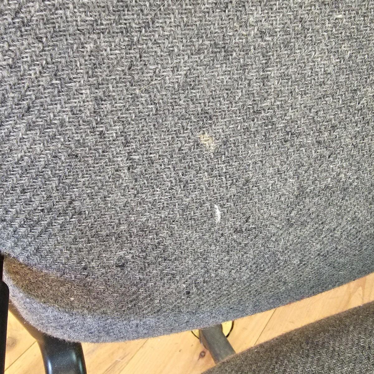 Two office chairs, one black, one grey. Black chair has round padded seat and padded back, chrome base and roller wheels. 22" x 21" x 31"H, the seat is adjustable from 20" to 26" height. Grey chair has upholstered seat and back, plastic arms. Base has five legs with rolling casters. Chair measures 23" x 26" x 37"H, has seat height of 19". Some minor blemishes on upholstery. See photos for details. Local pickup only.