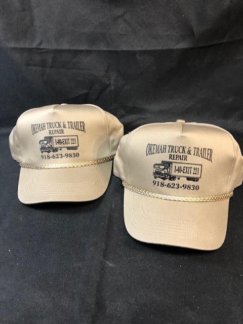 Pair of snap back trucker hats. From Okemah Truck & Trailer. Tan with black writing. Adjustable size.