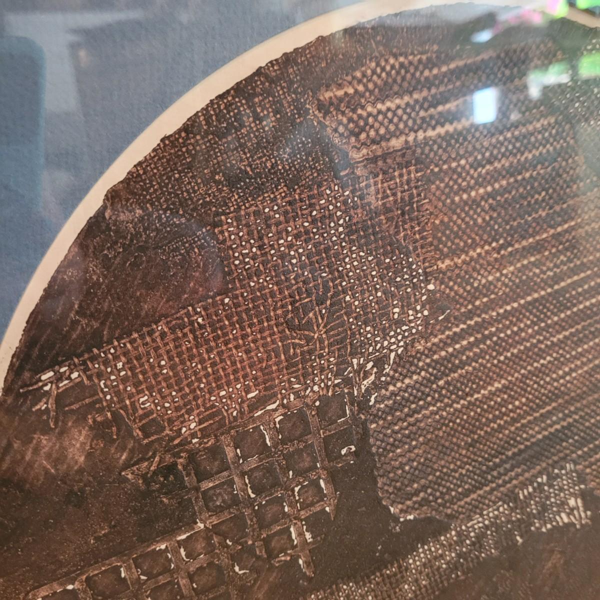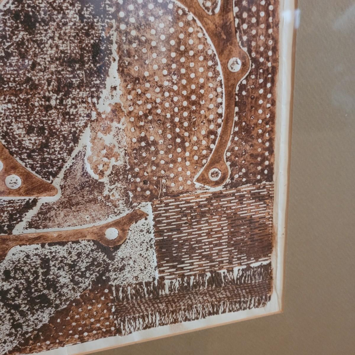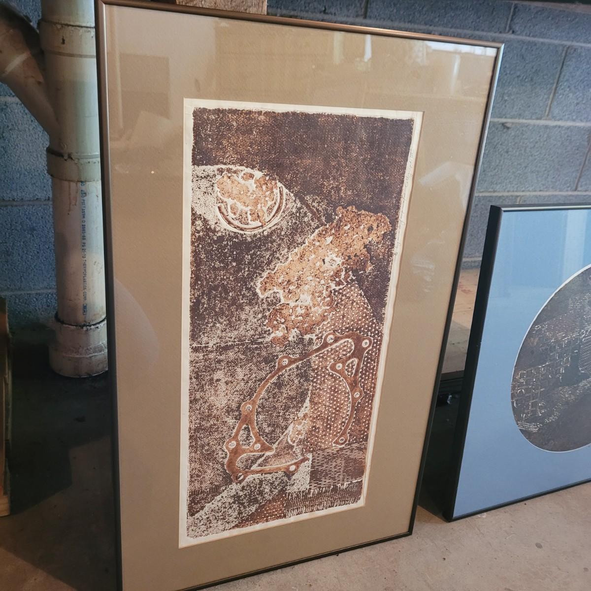 Two unique collograph prints in earth tones of deep to rusty browns with contrast of light creams. Narrow print measures approximately 17.5" x 28"H, square print 20.5" SQ. Shipping available. Shipping can be costly. We suggest contacting our preferred local shipping provider, Postage Express, with dimensions and getting an estimate before bidding: (828) 670-5501or postageexpress@yahoo.com.