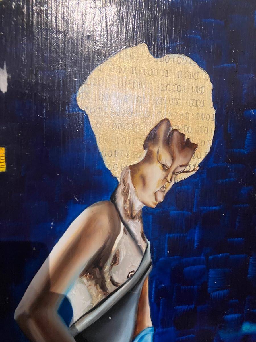 Epic pair of original mixed media paintings on canvas by artist Maria Medina (signed on back with © symbol + front monogram). Both from 2001: left dated August 2001, right dated January 2001.