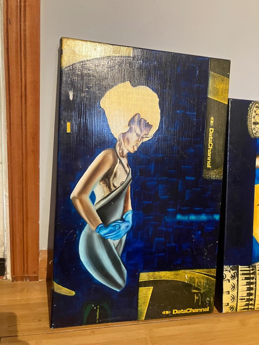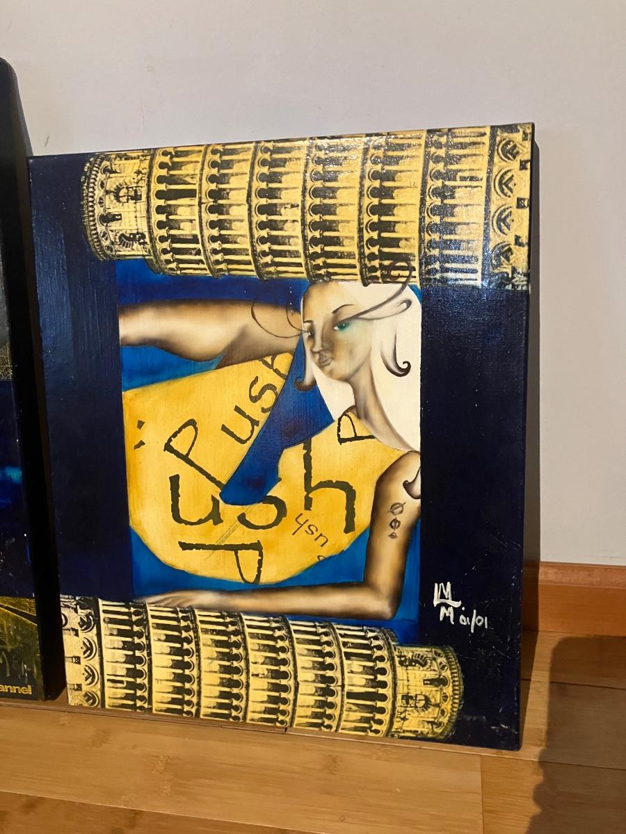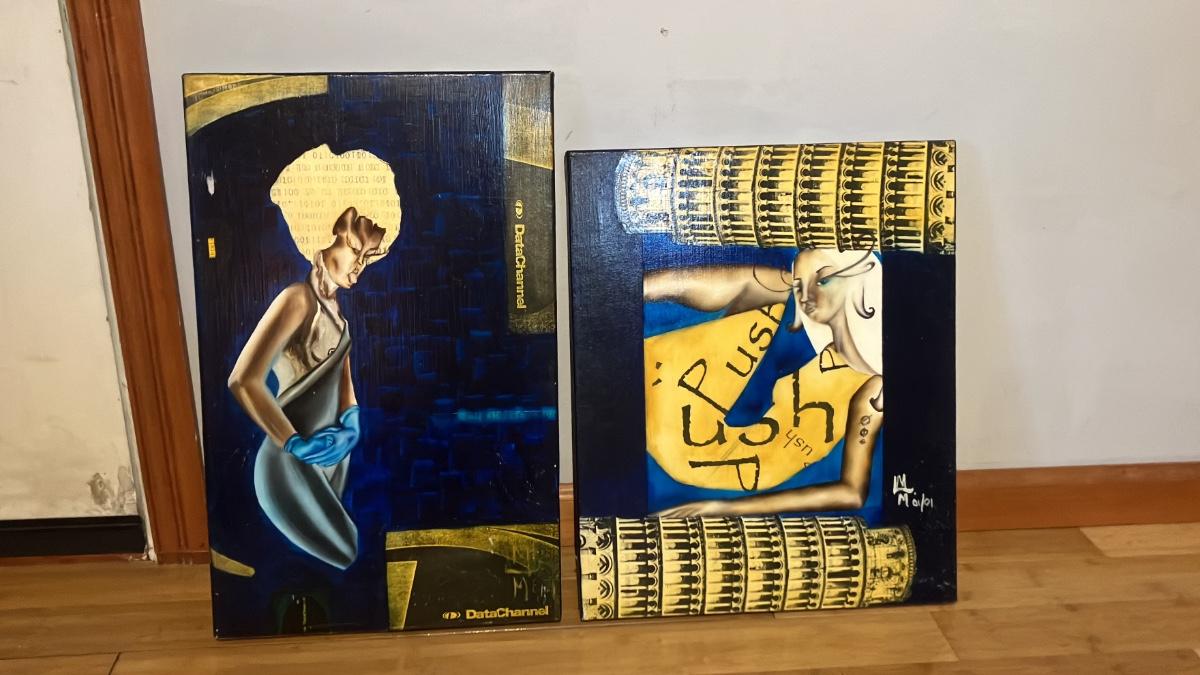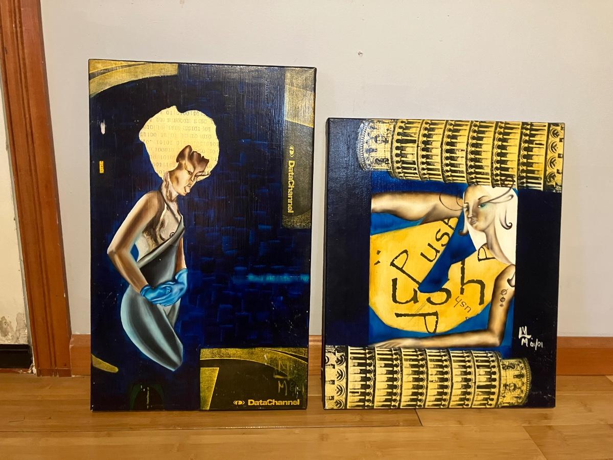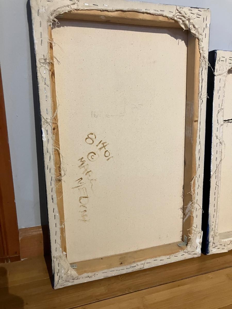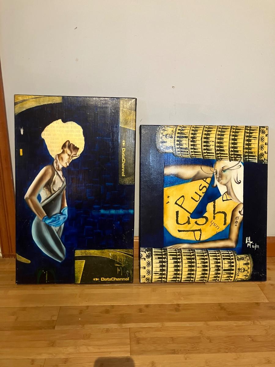 Epic pair of original mixed media paintings on canvas by artist Maria Medina (signed on back with © symbol + front monogram). Both from 2001: left dated August 2001, right dated January 2001.