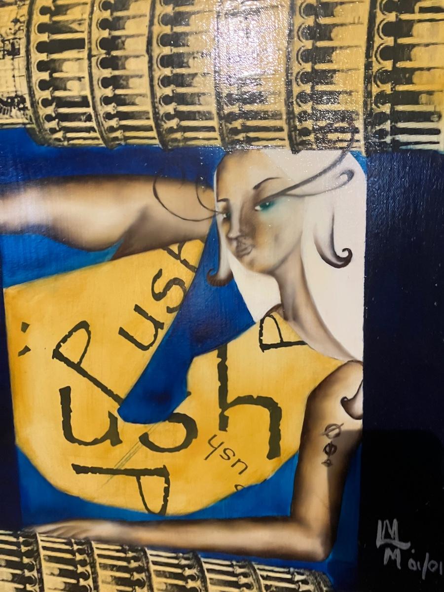 - Right (18" x 22.5"): Bold blue/yellow/gold – fierce woman with "Push"/"i'Push" in her dress, leaning Tower of Pisa motifs + crowd below (surreal, fun "push" twist!).