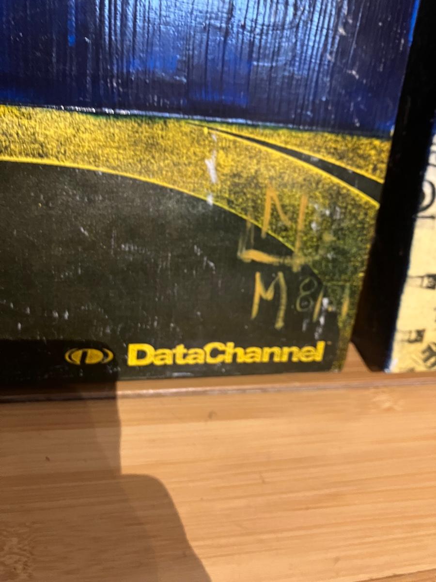 - Left (16" x 26"): Deep blue-black with gold accents – sassy semi-nude woman with tongue out, "DataChannel" text repeated (total early-internet/tech pop vibe!).