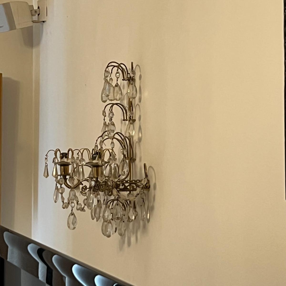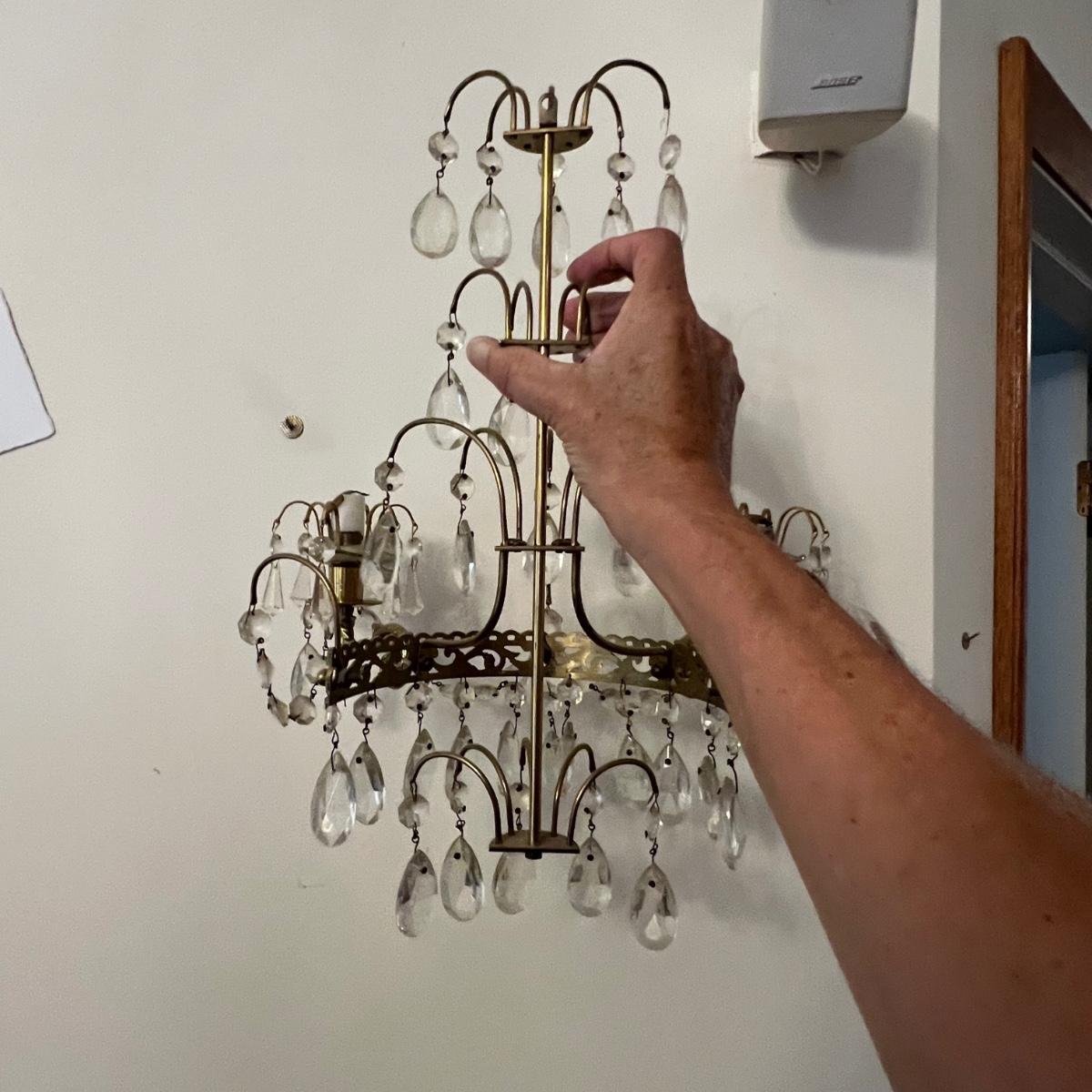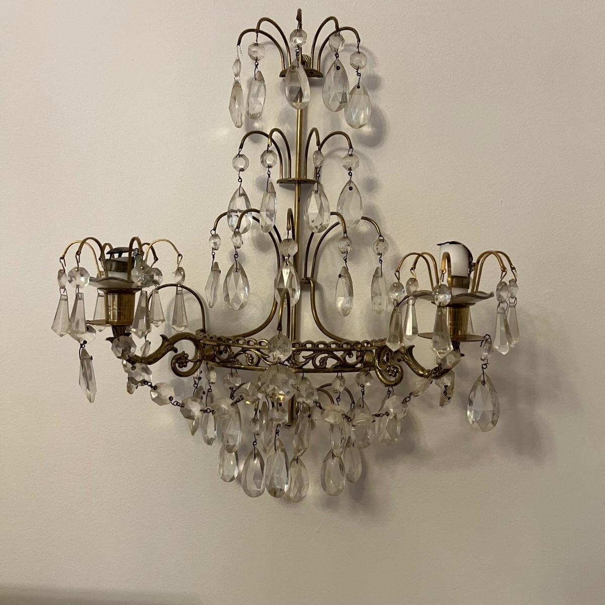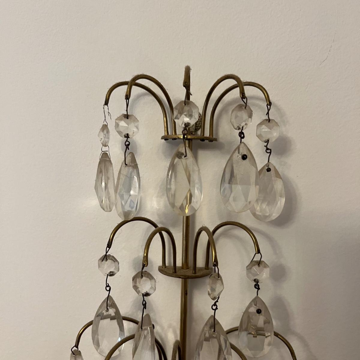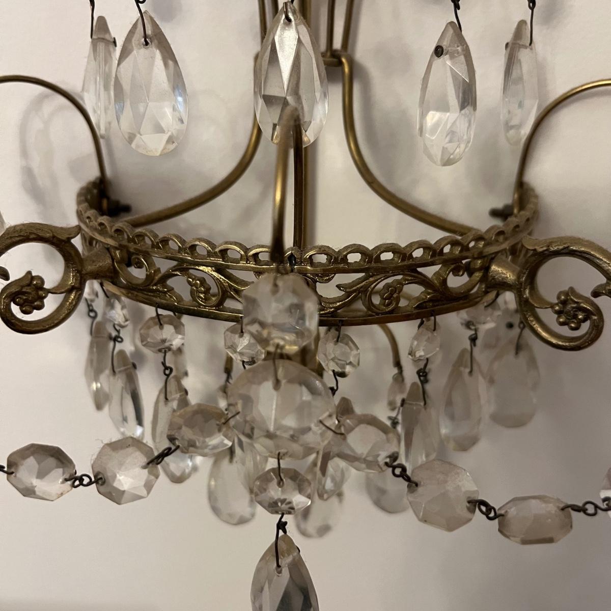 This matching pair of wall sconces appear to be brass with Swarovski like prisms. These wall sconces appear to match the ornate chandelier that is in another lot in this auction. These are not set up with electrical lighting though.