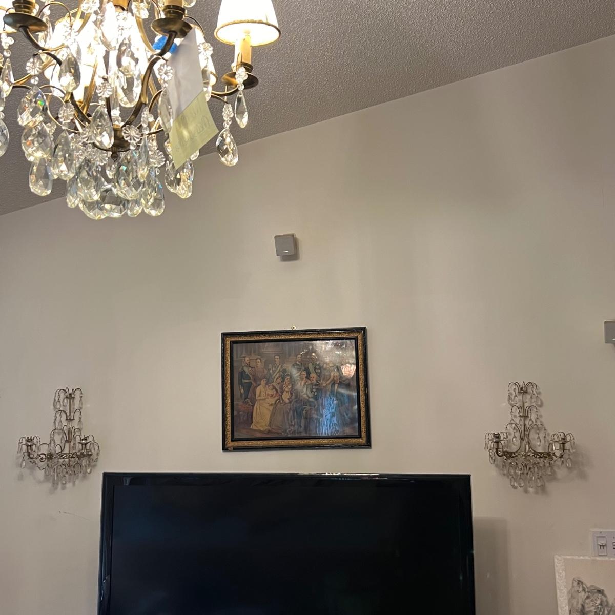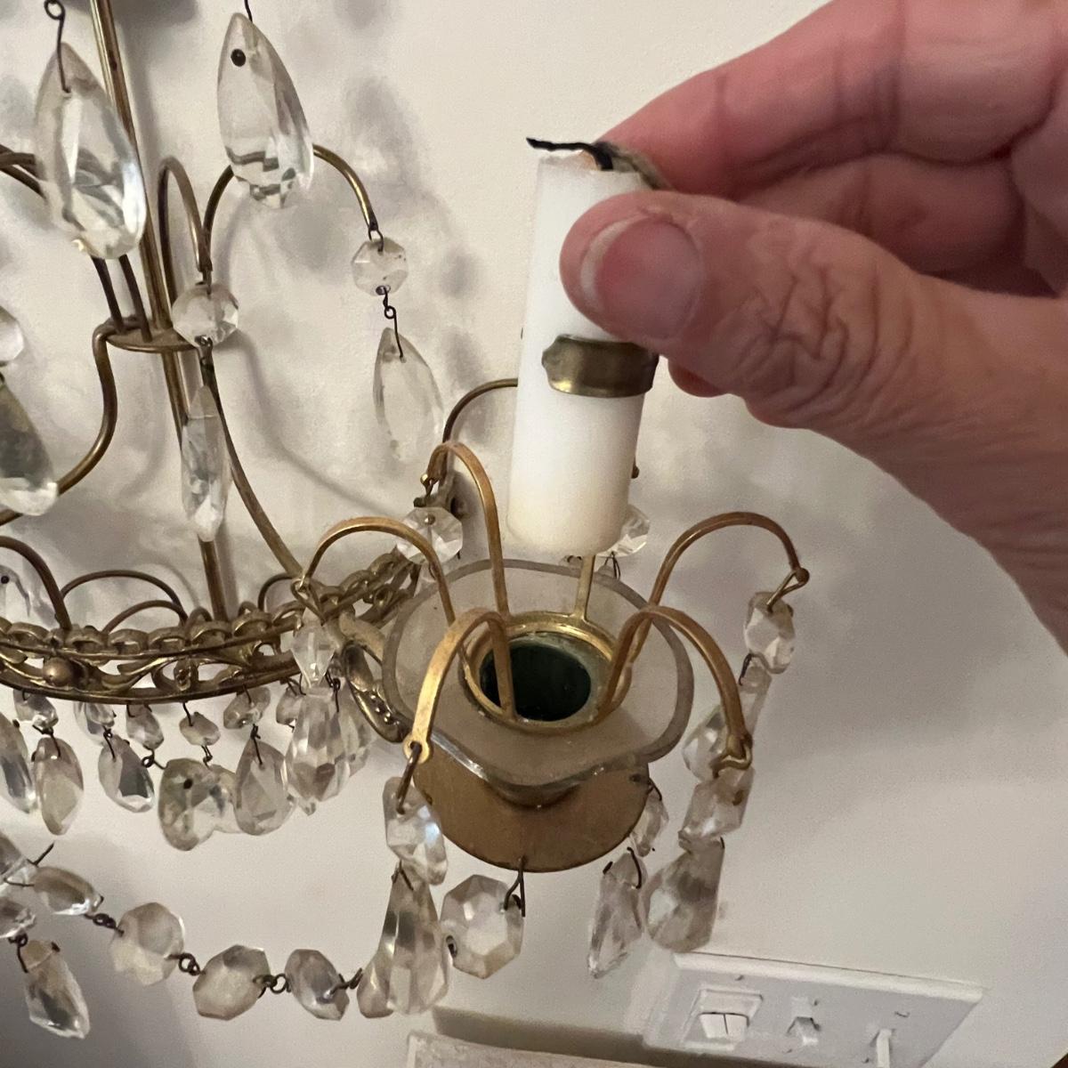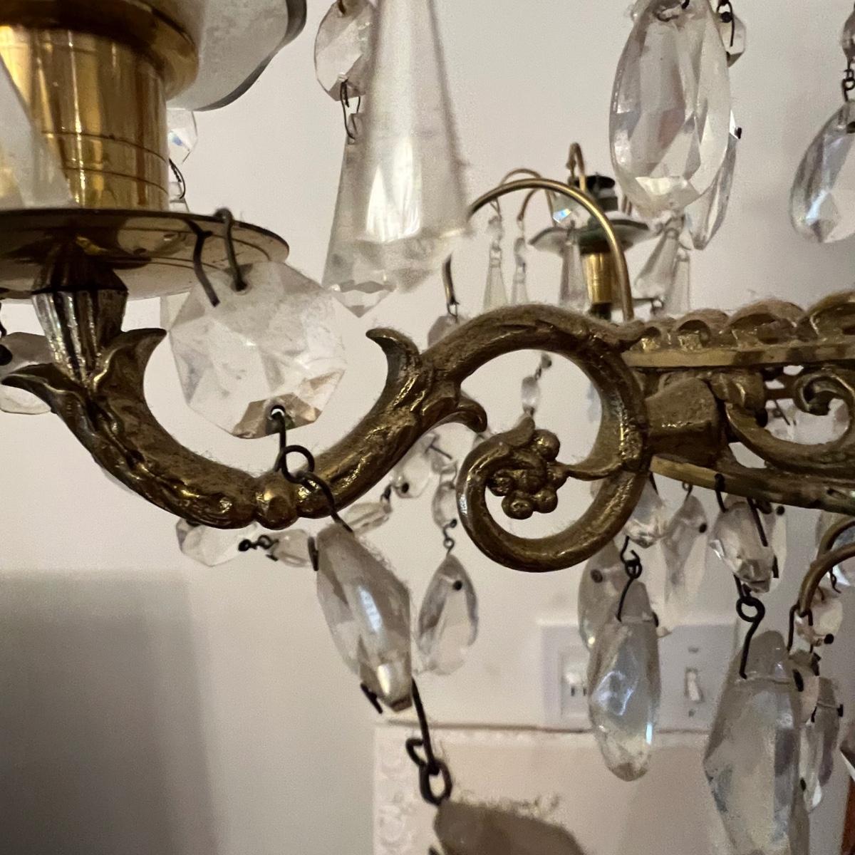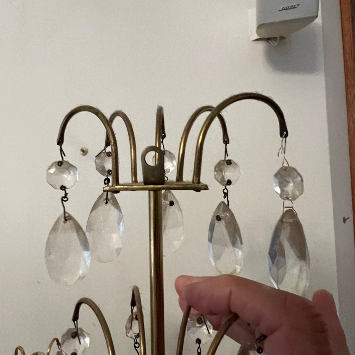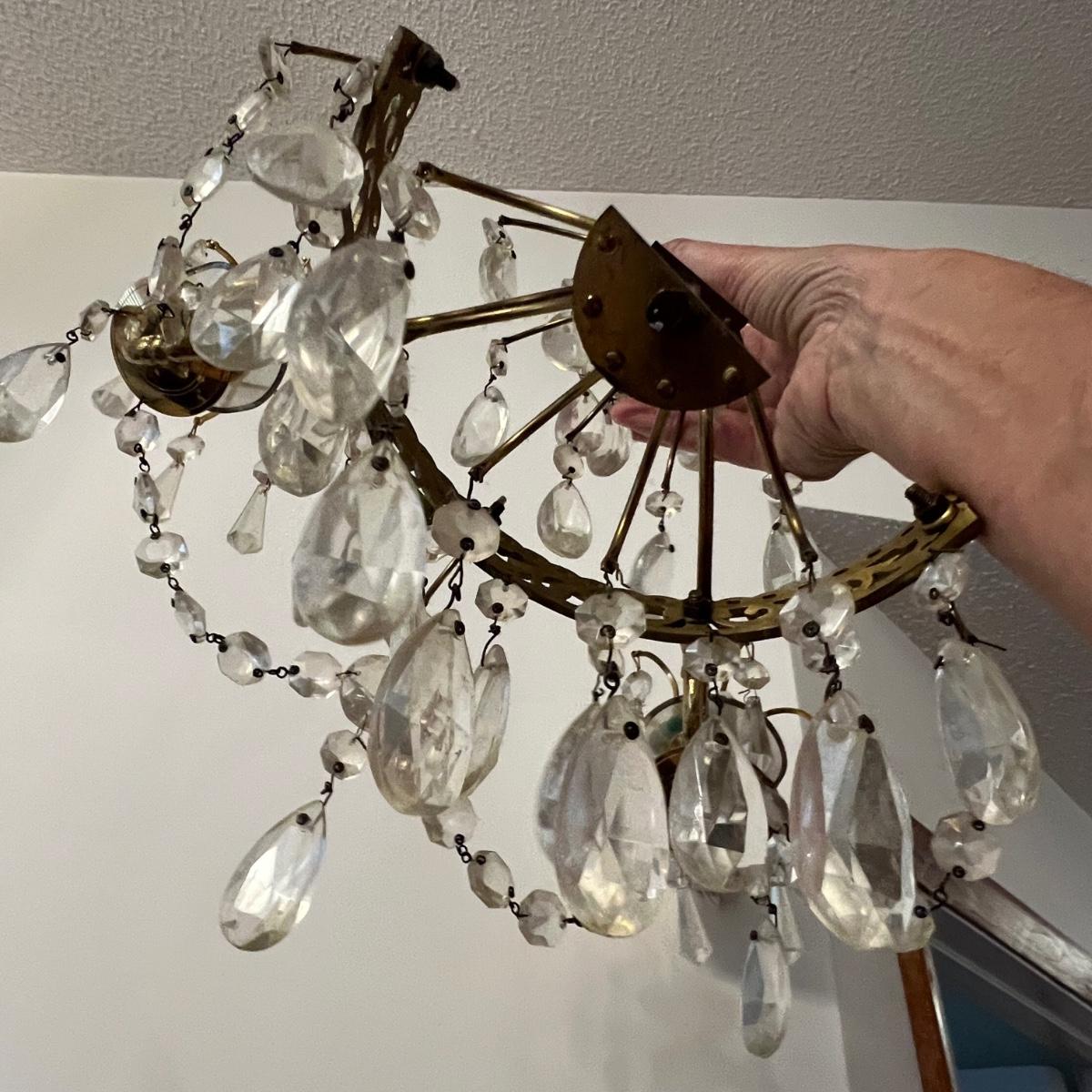 This matching pair of wall sconces appear to be brass with Swarovski like prisms. These wall sconces appear to match the ornate chandelier that is in another lot in this auction. These are not set up with electrical lighting though.