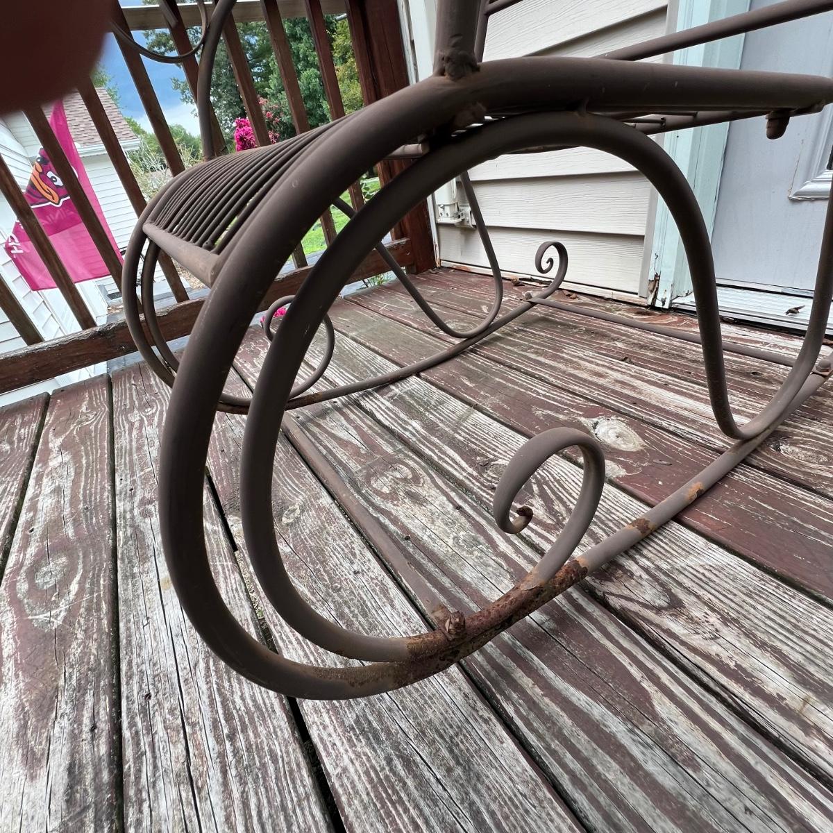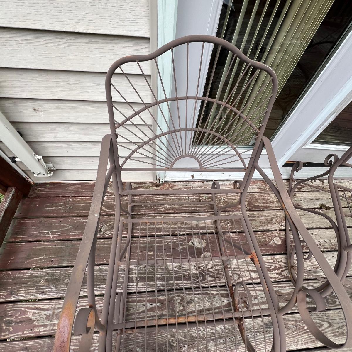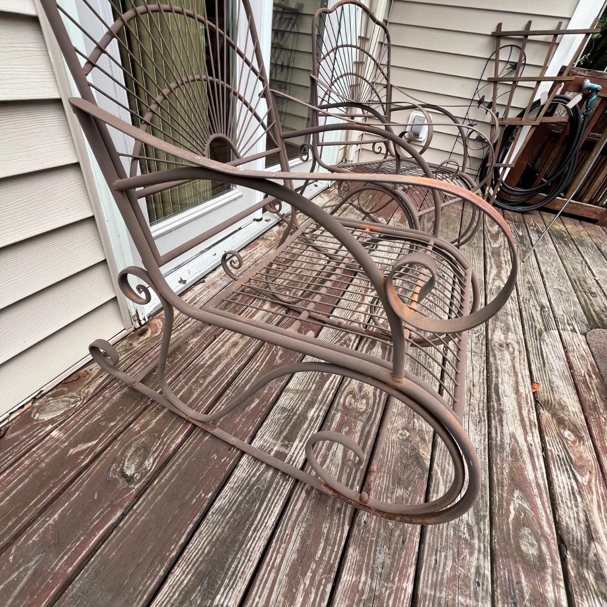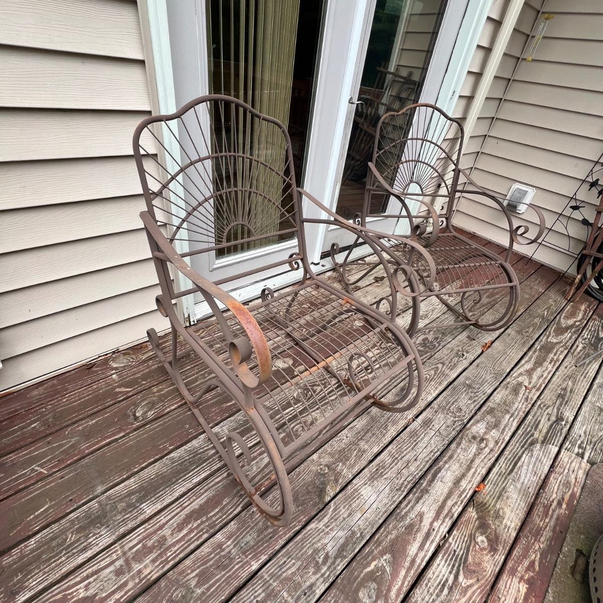 This pair of rocking chairs are a brown metal. No seat cushions are included. One chair has more rust than the other, see images.