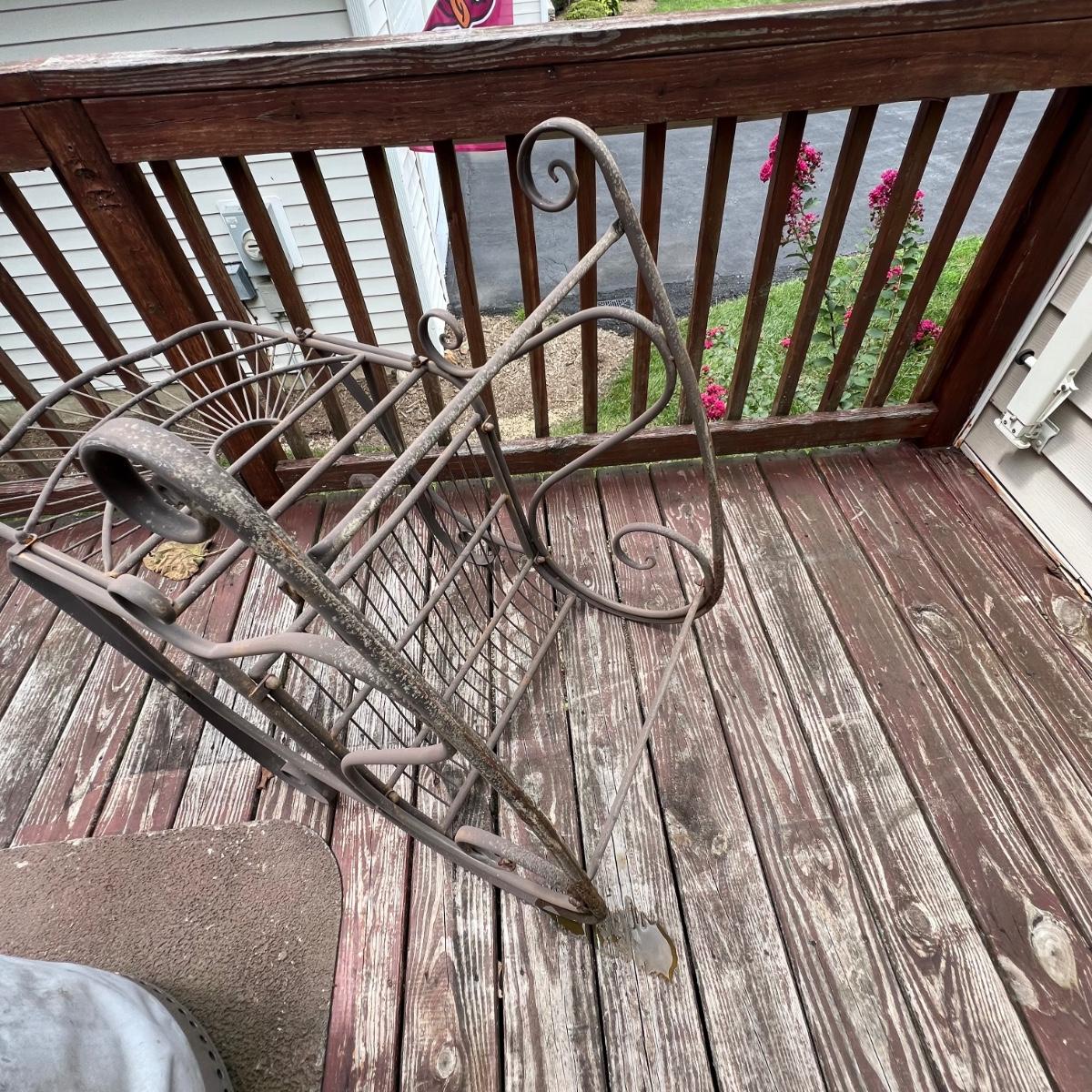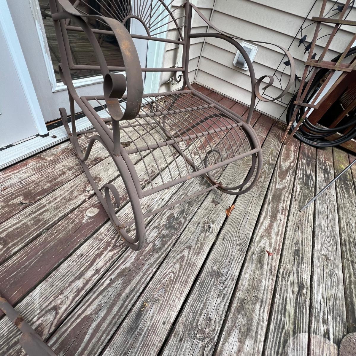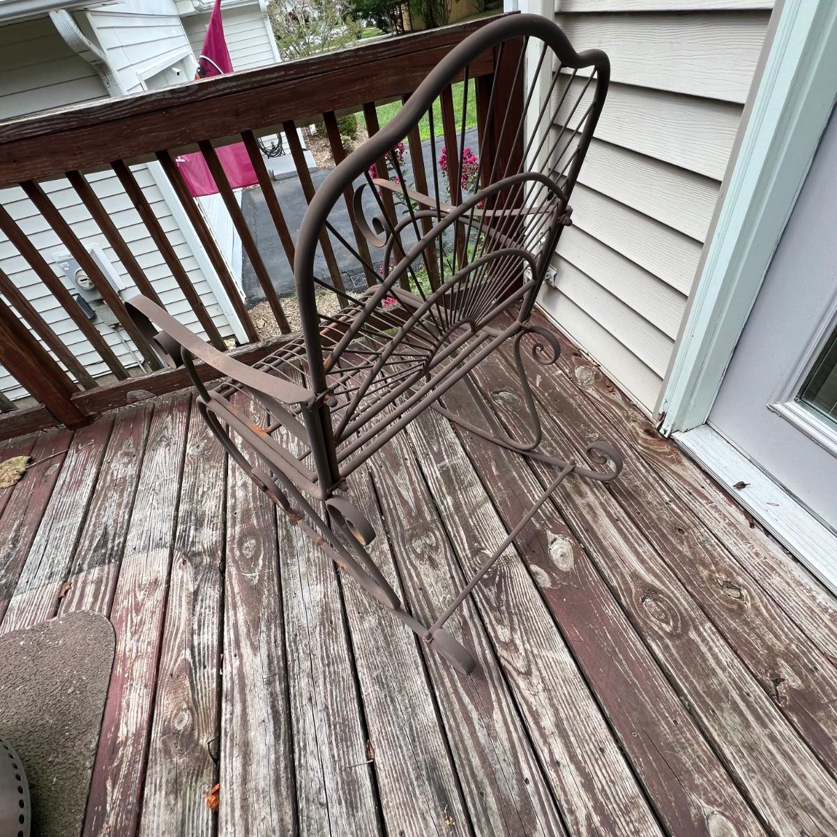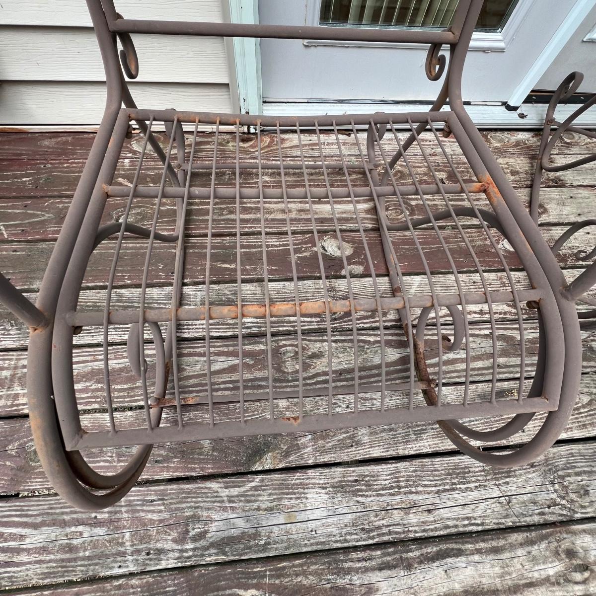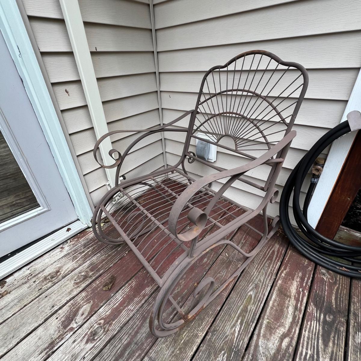 This pair of rocking chairs are a brown metal. No seat cushions are included. One chair has more rust than the other, see images.