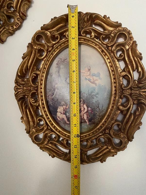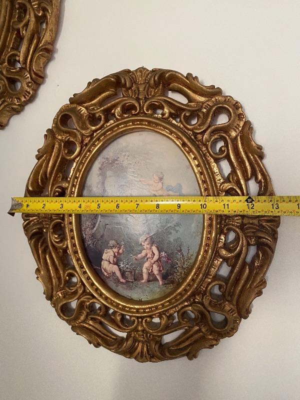 Ornate gold painted plaster framed prints. Prints seem to be on cardboard, could easily be changed. Plaster framed are heavy, in good condition. Great in gold but easy to repaint. 13"x15", hang either direction.