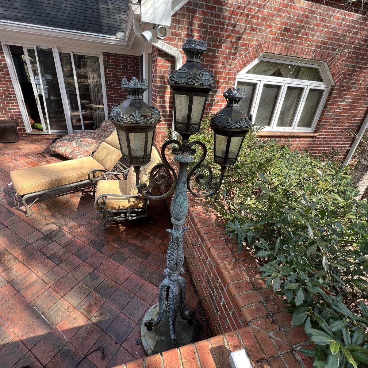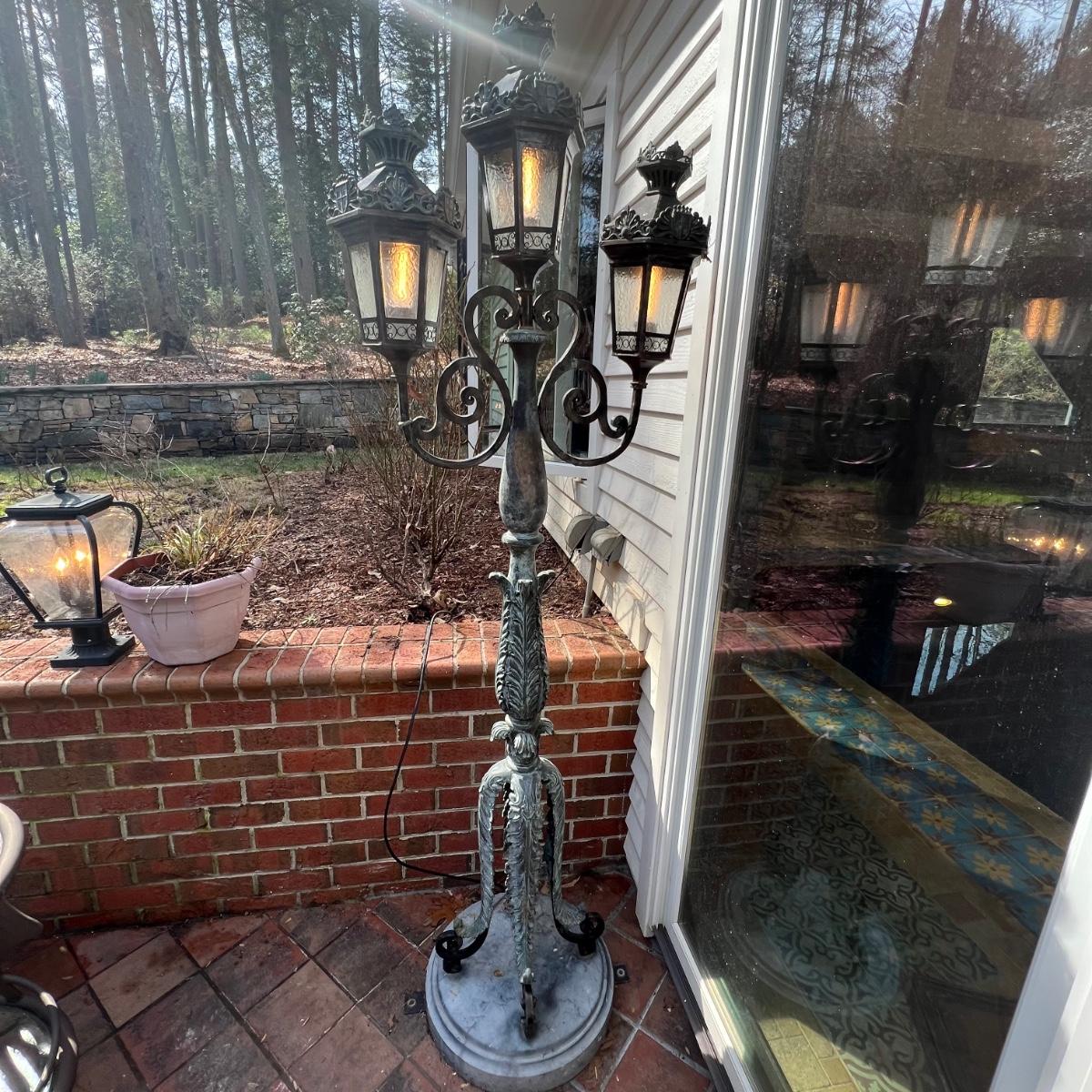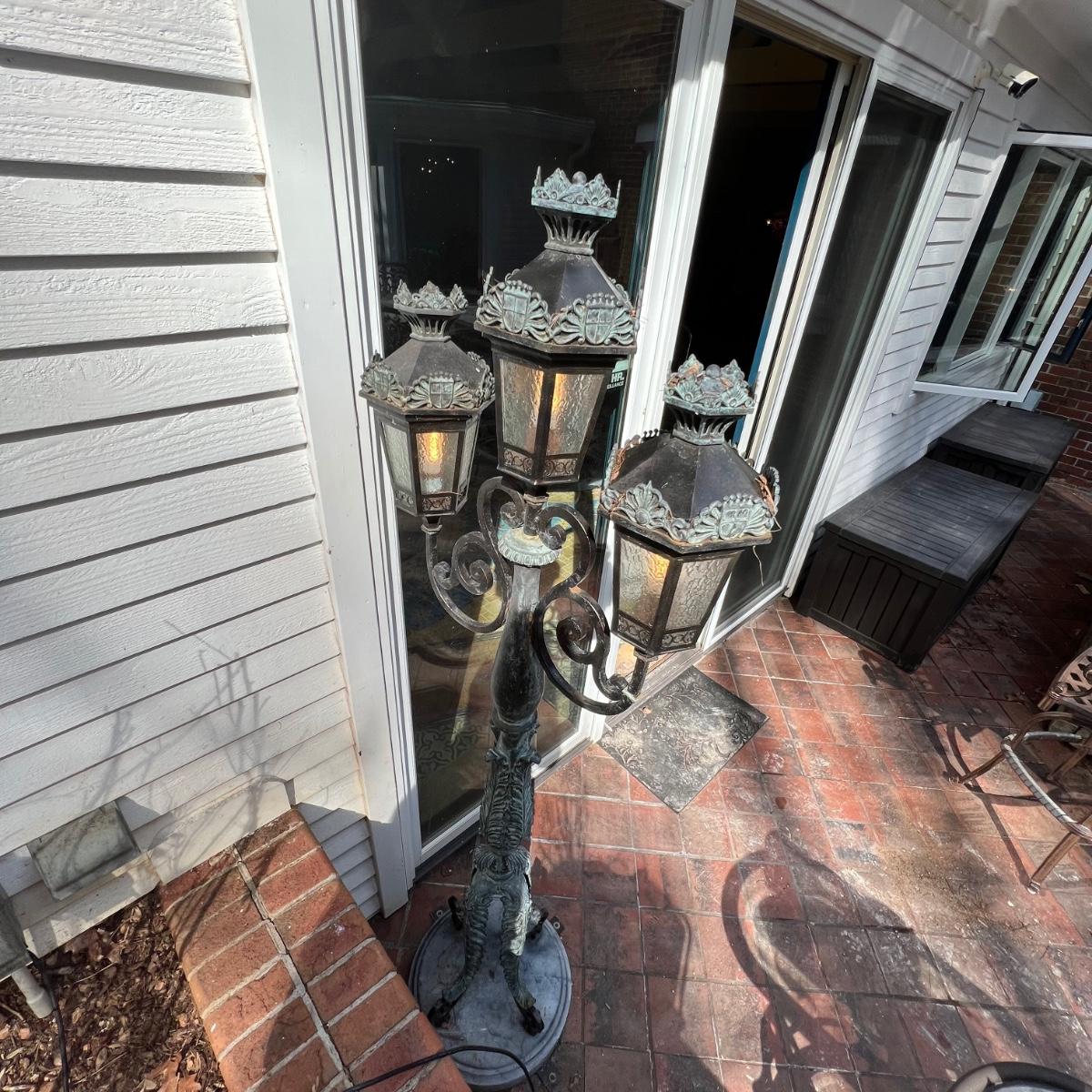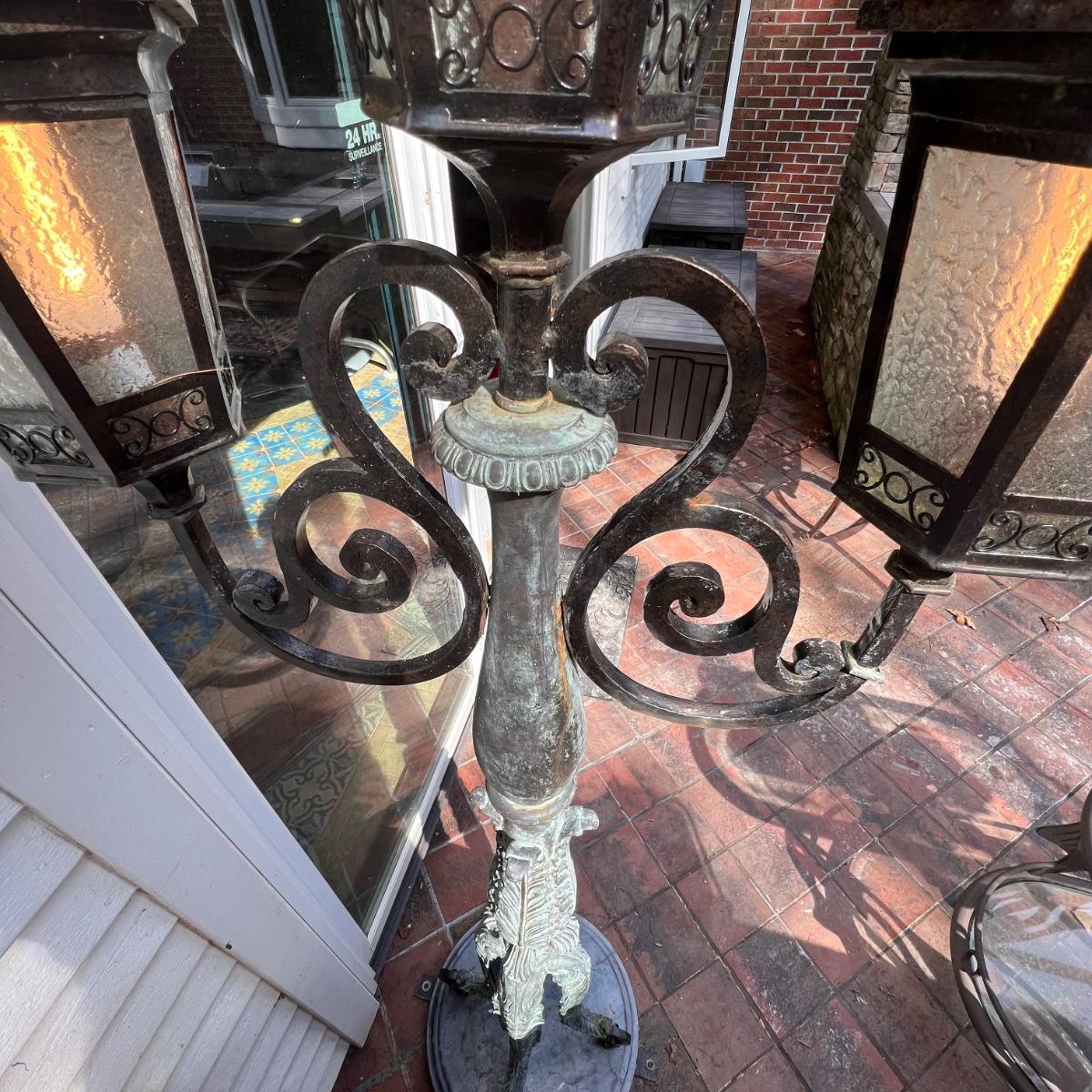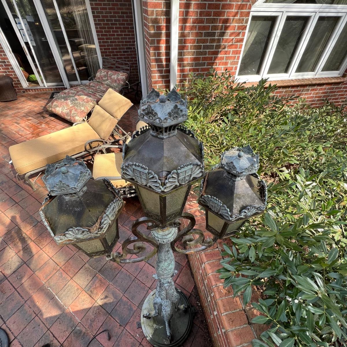 This matching pair of street lamps are metal with a patina like finish and are mounted onto thick stone bases, which are currently screwed into the brick patio (flathead screwdriver will be needed). Lights require electrical outlet for power. Winning bidder will be responsible for dismantling them. Note that one stone base is much dirtier than the other, this one should come clean with a good scrub.
