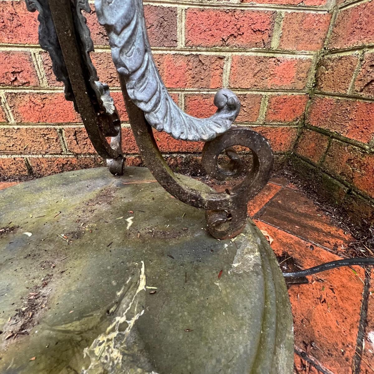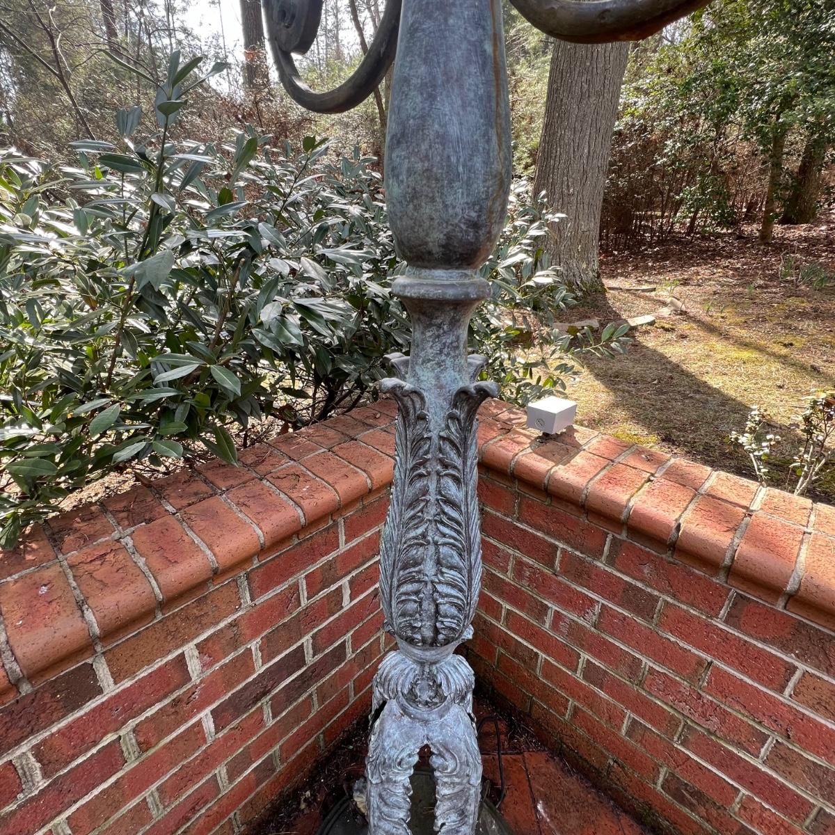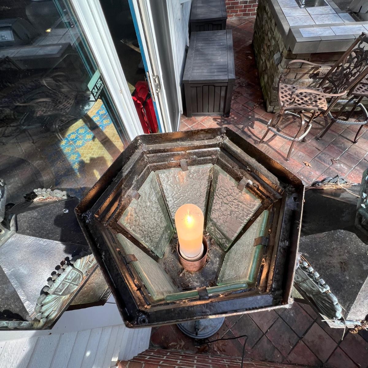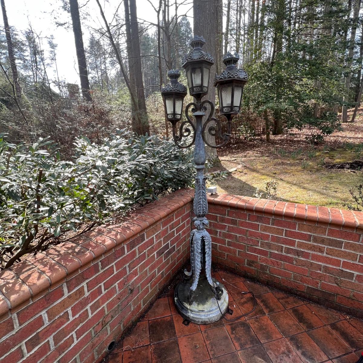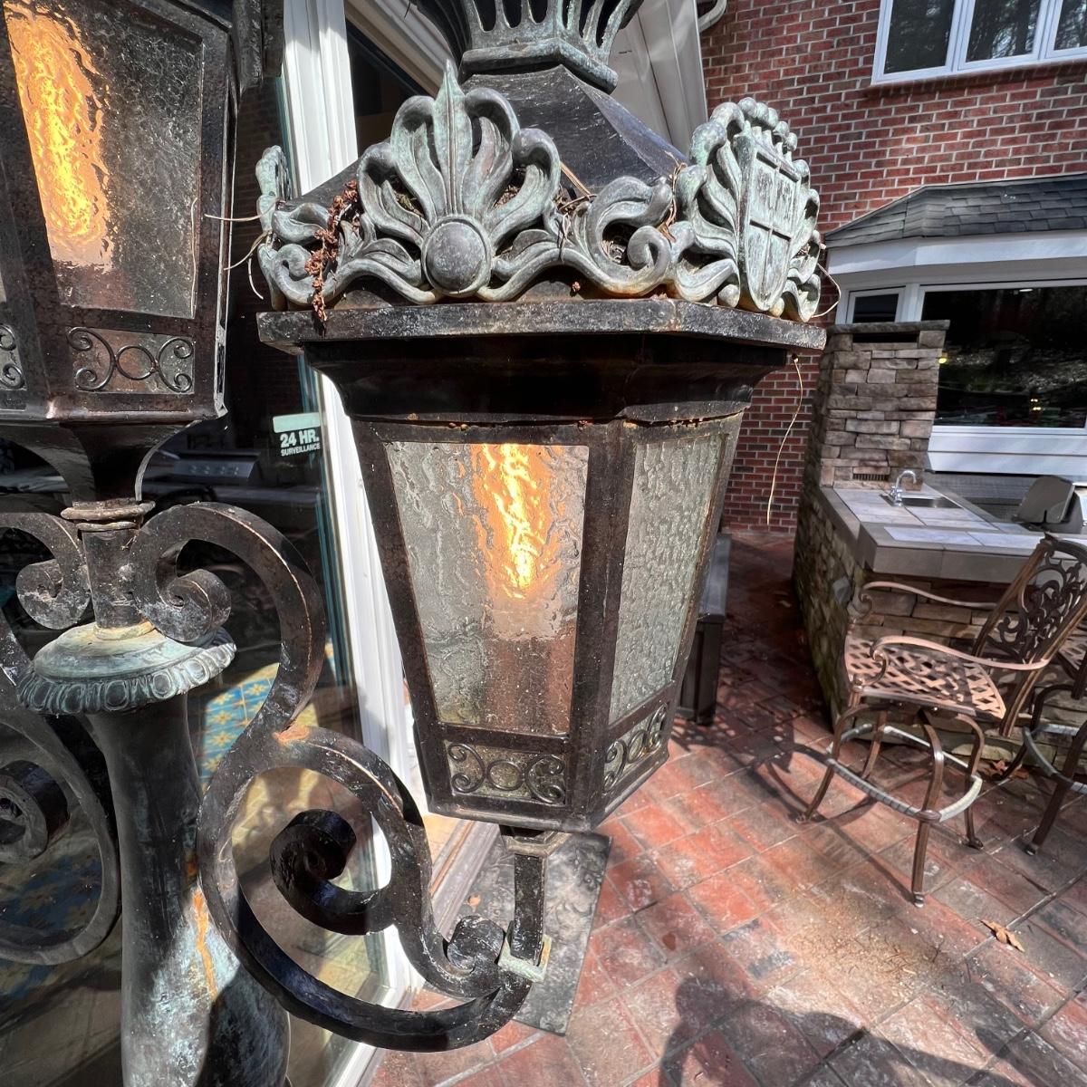 This matching pair of street lamps are metal with a patina like finish and are mounted onto thick stone bases, which are currently screwed into the brick patio (flathead screwdriver will be needed). Lights require electrical outlet for power. Winning bidder will be responsible for dismantling them. Note that one stone base is much dirtier than the other, this one should come clean with a good scrub.
