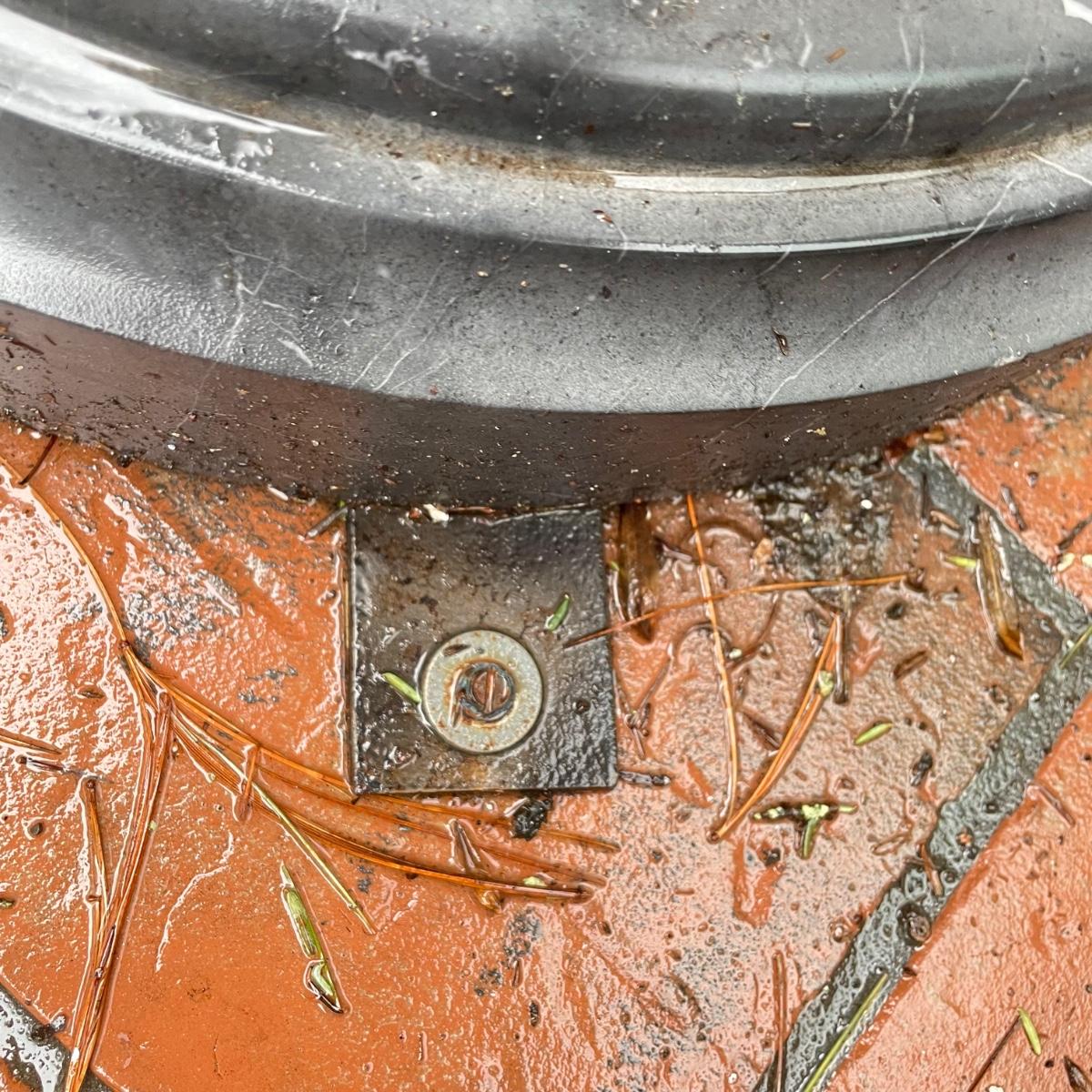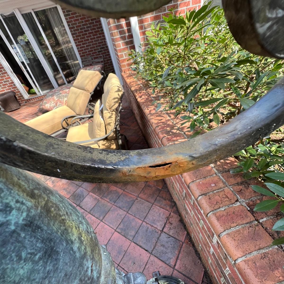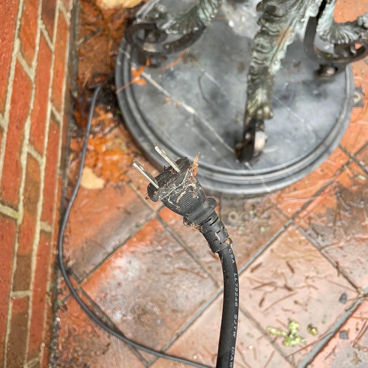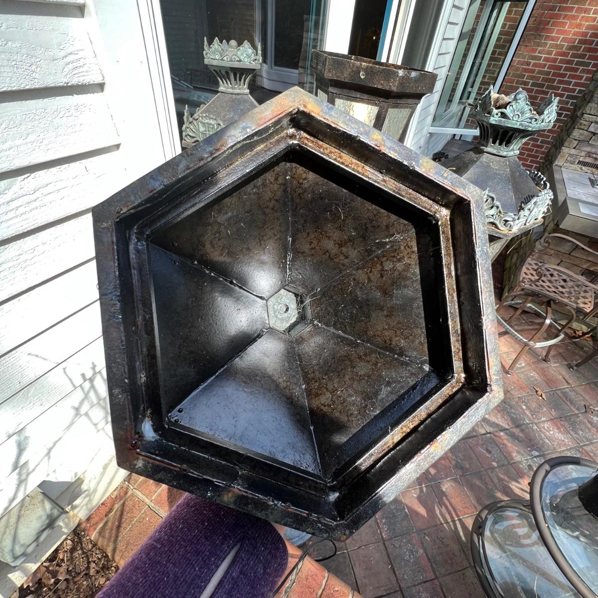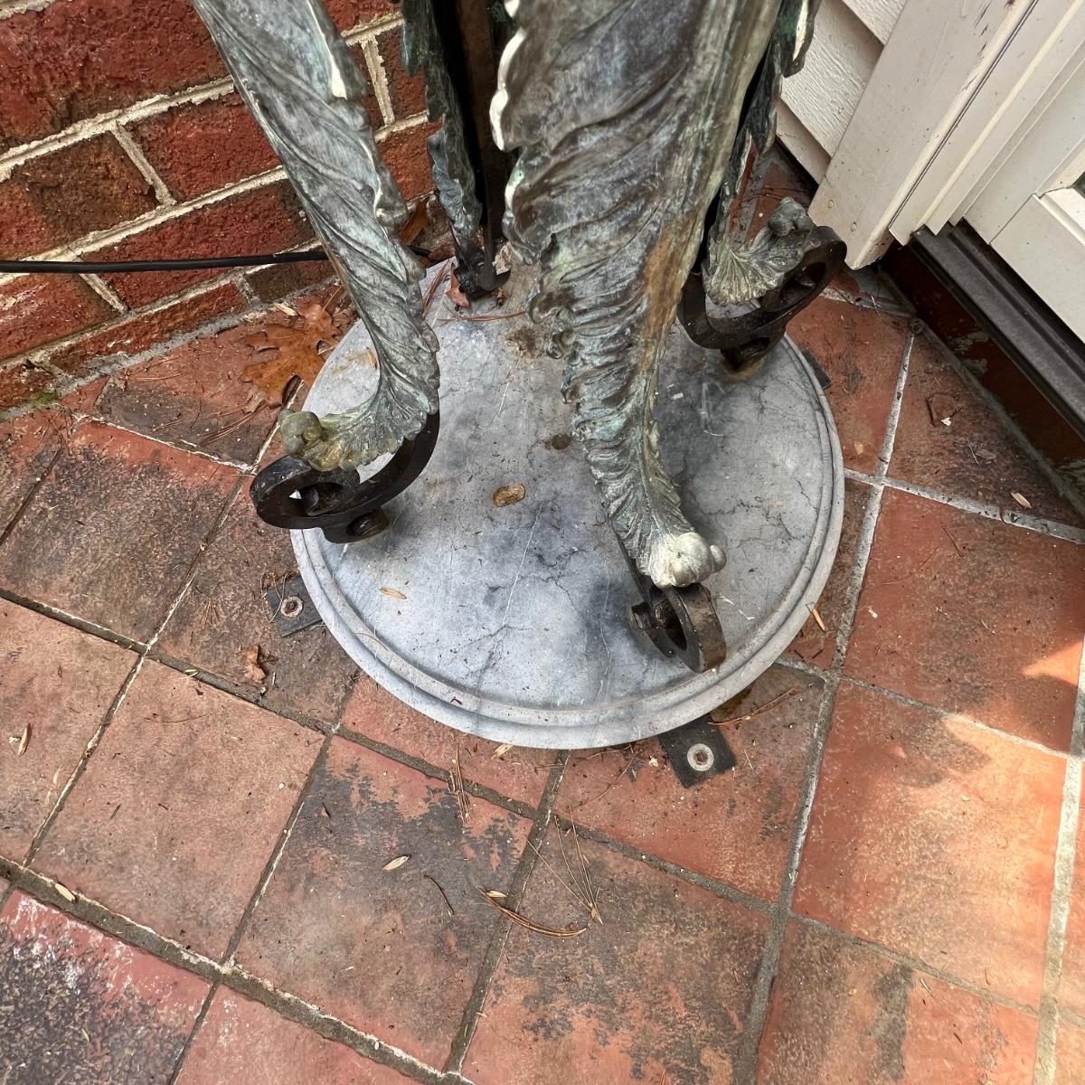 This matching pair of street lamps are metal with a patina like finish and are mounted onto thick stone bases, which are currently screwed into the brick patio (flathead screwdriver will be needed). Lights require electrical outlet for power. Winning bidder will be responsible for dismantling them. Note that one stone base is much dirtier than the other, this one should come clean with a good scrub.