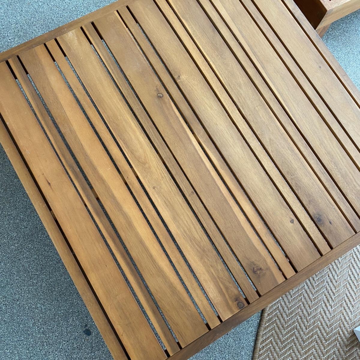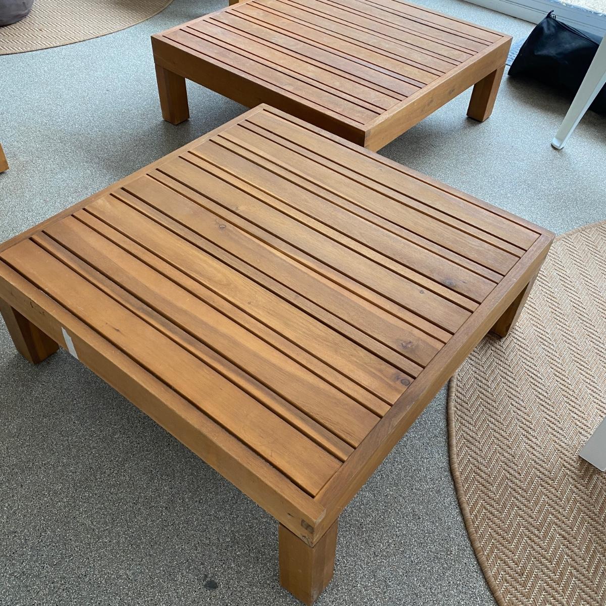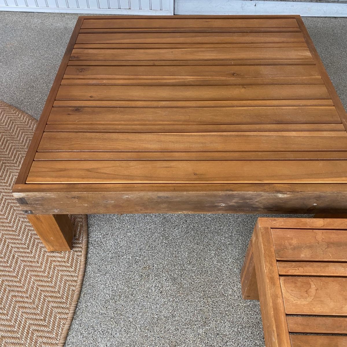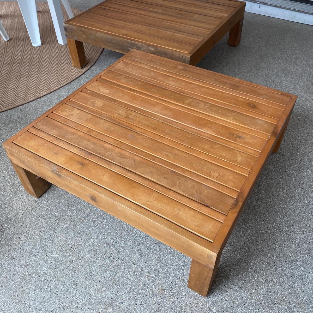 Two low profile square outdoor coffee tables likely made of Acacia wood. They have a teak wood appearance. Legs are not currently attached but easy to reassemble with hardware. One table has water stains on top and the other has some discoloration on one side. Both could likely be fixed with paint or new stain or just use as is. Measure 29.5” square by 10” tall. Local pick up.