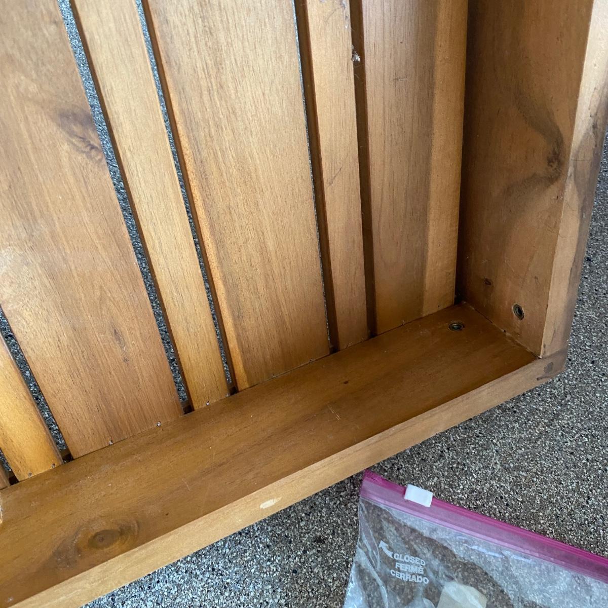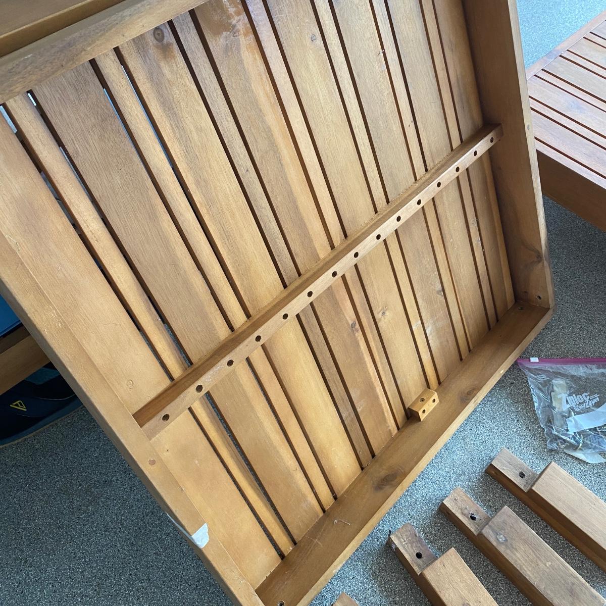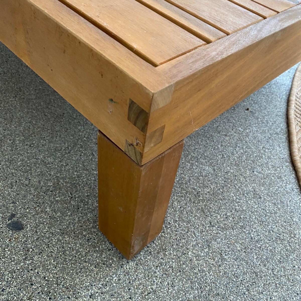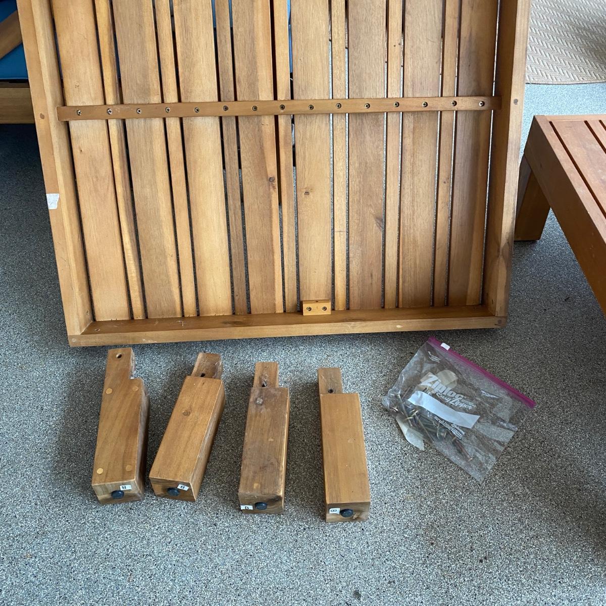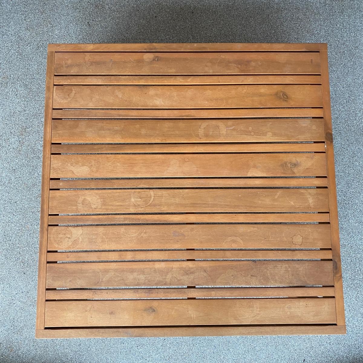 Two low profile square outdoor coffee tables likely made of Acacia wood. They have a teak wood appearance. Legs are not currently attached but easy to reassemble with hardware. One table has water stains on top and the other has some discoloration on one side. Both could likely be fixed with paint or new stain or just use as is. Measure 29.5” square by 10” tall. Local pick up.