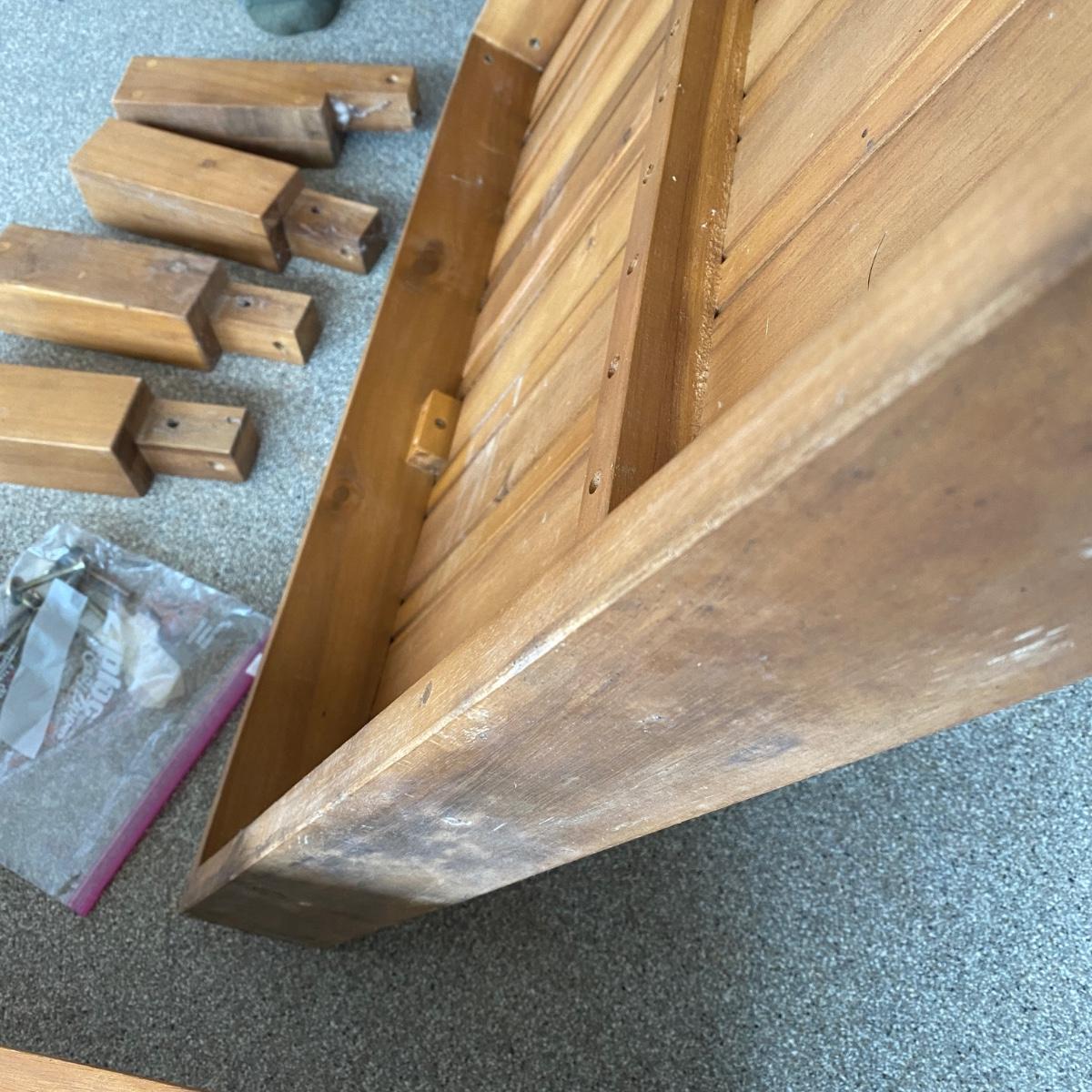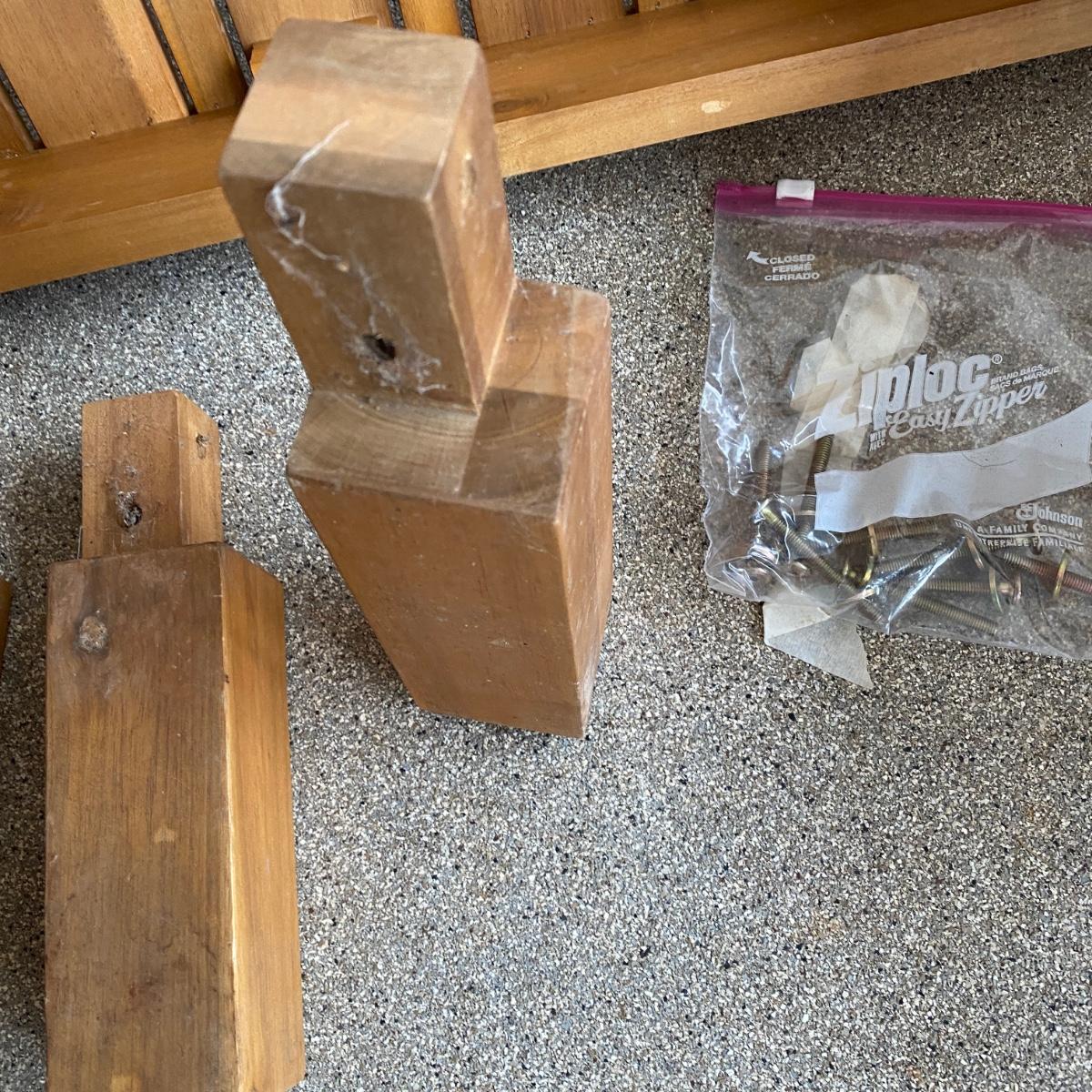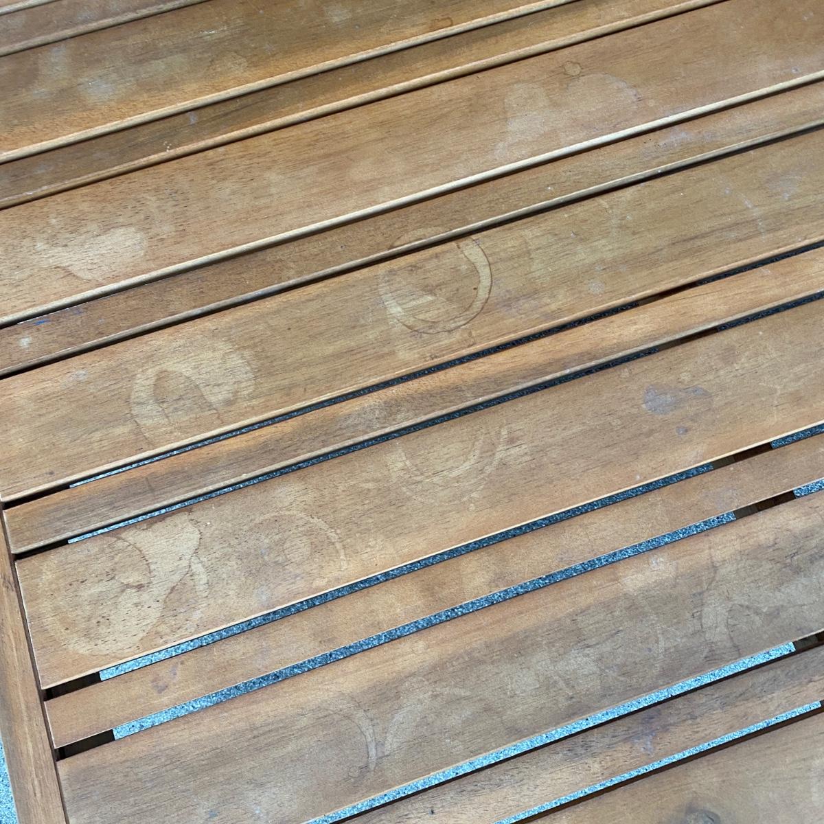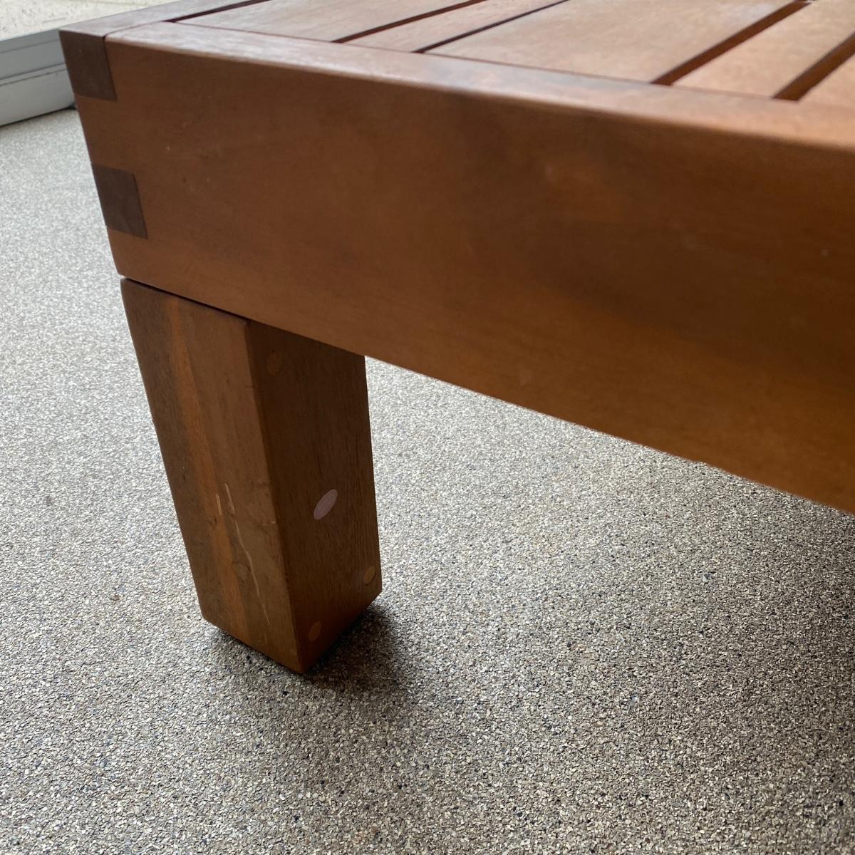 Two low profile square outdoor coffee tables likely made of Acacia wood. They have a teak wood appearance. Legs are not currently attached but easy to reassemble with hardware. One table has water stains on top and the other has some discoloration on one side. Both could likely be fixed with paint or new stain or just use as is. Measure 29.5” square by 10” tall. Local pick up.
