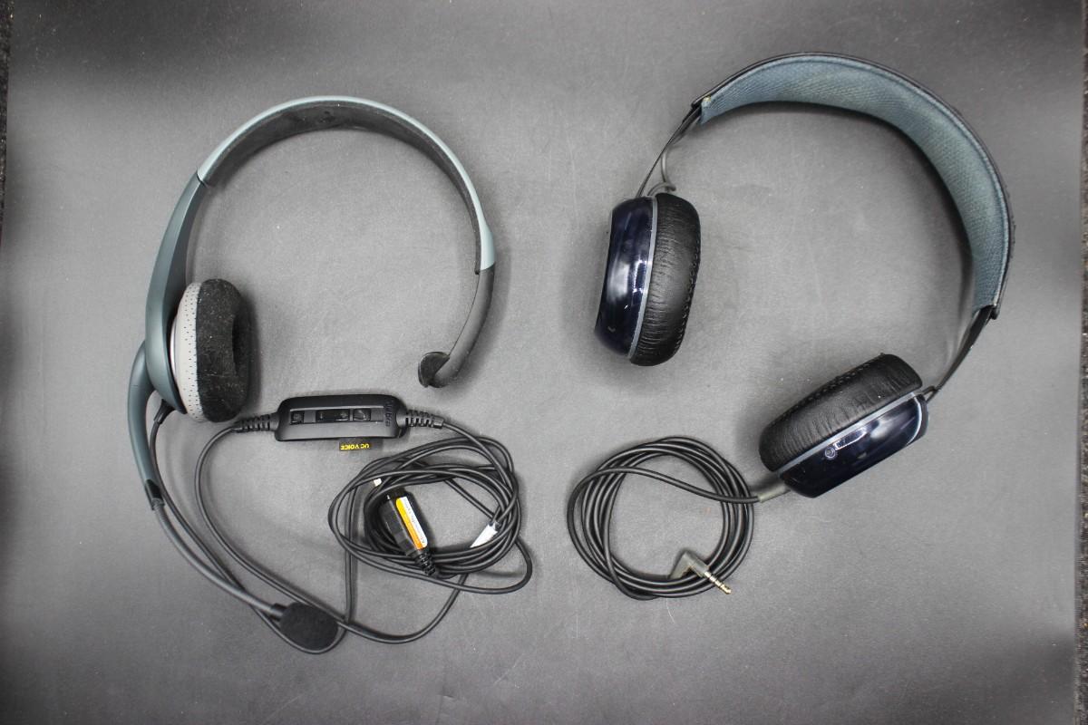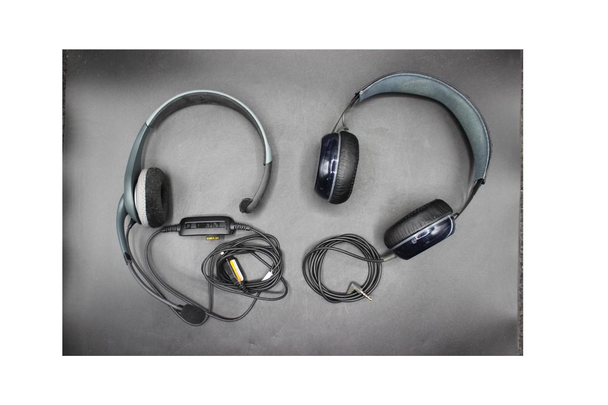 Pair of over the ear headphones. Wired. One is a one ear with mic headset from Jabra, the other are over the ear from Skullcandy. Good used condition.