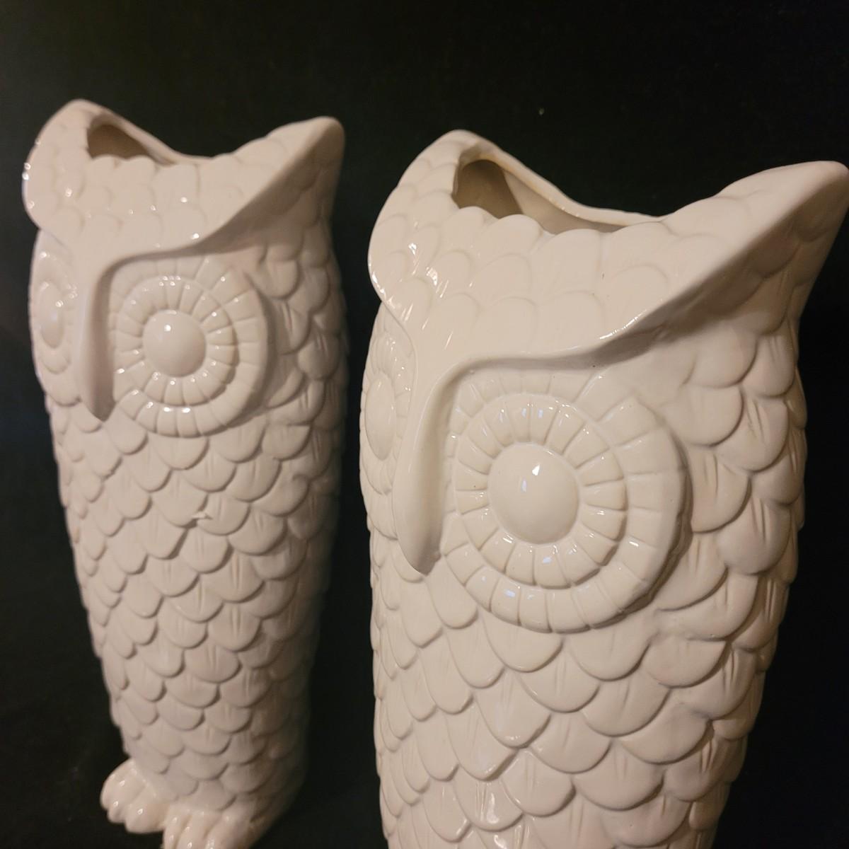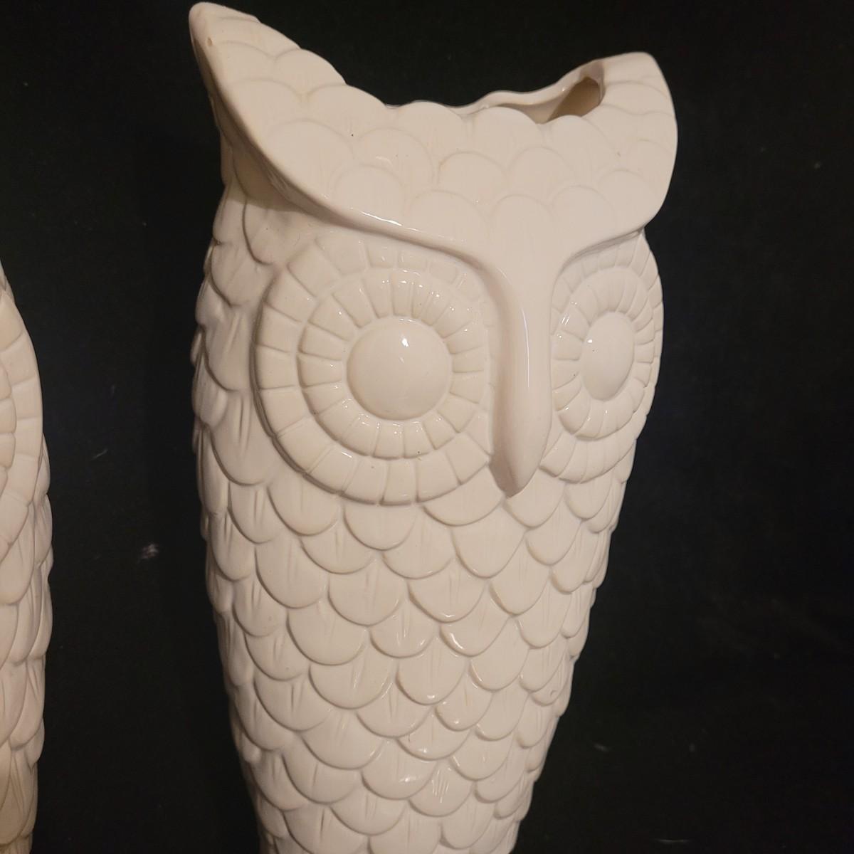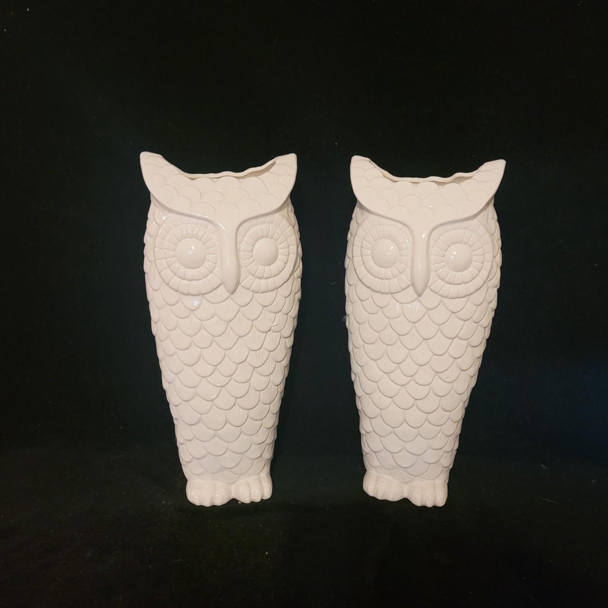 This pair of white ceramic owl vases has a textured scalloped feather design and a stylish opening at the top. Measure approximately 7” x 4” x 15.5”H. Shipping available.