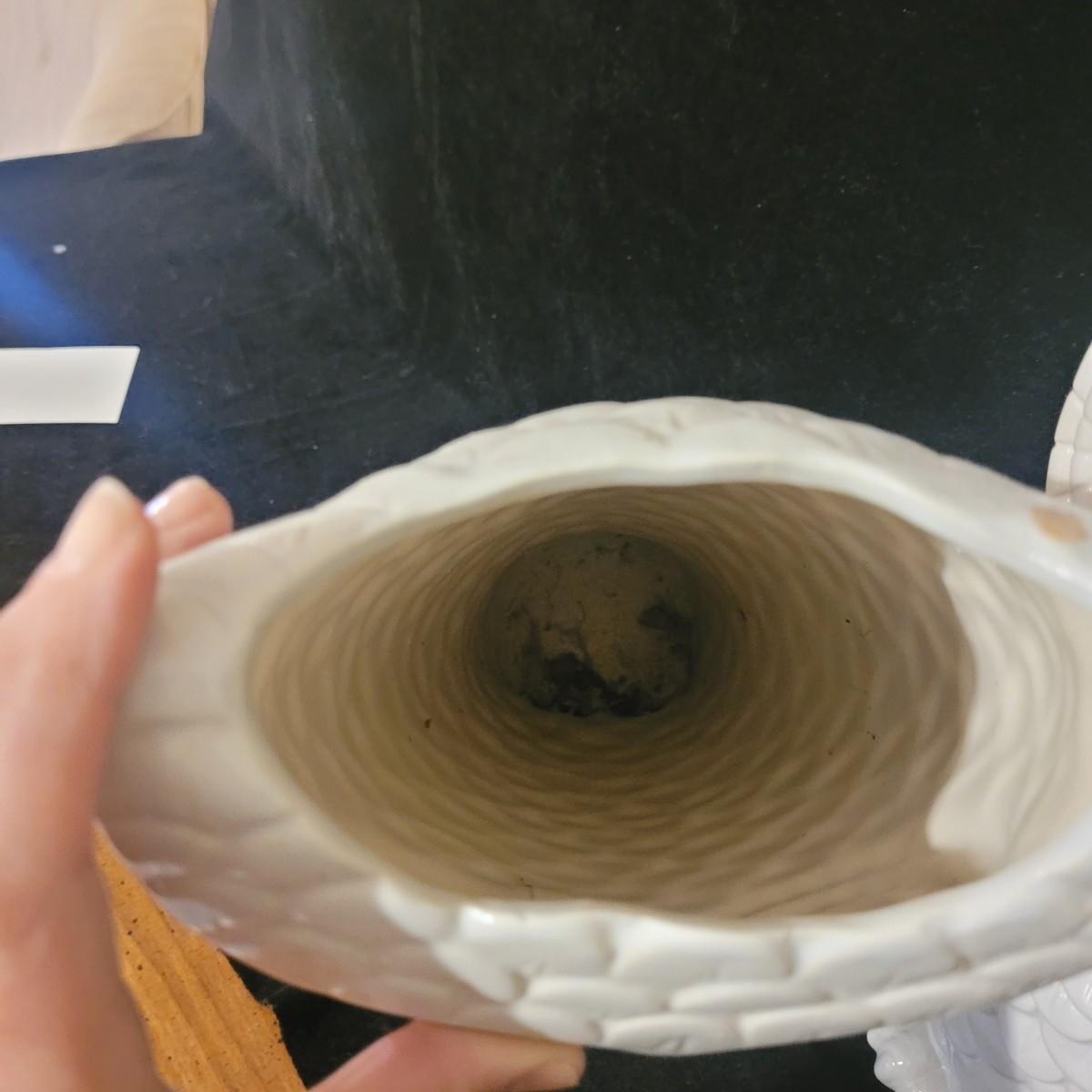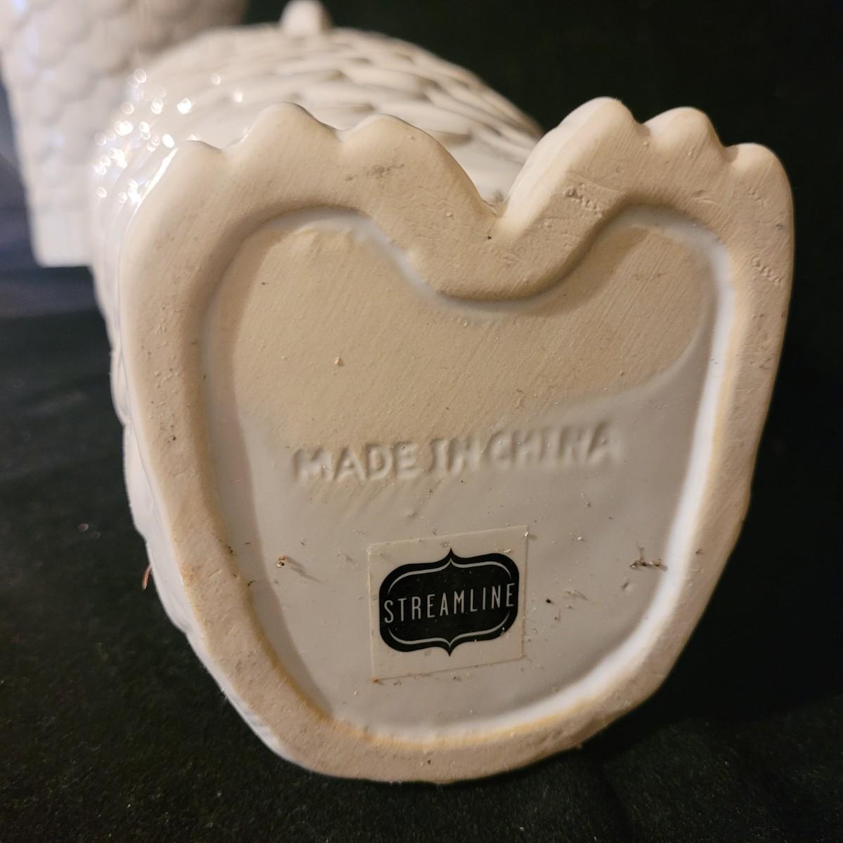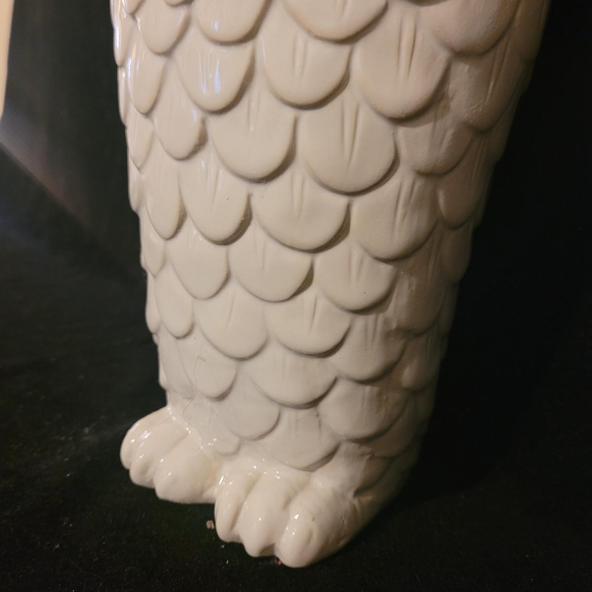 This pair of white ceramic owl vases has a textured scalloped feather design and a stylish opening at the top. Measure approximately 7” x 4” x 15.5”H. Shipping available.
