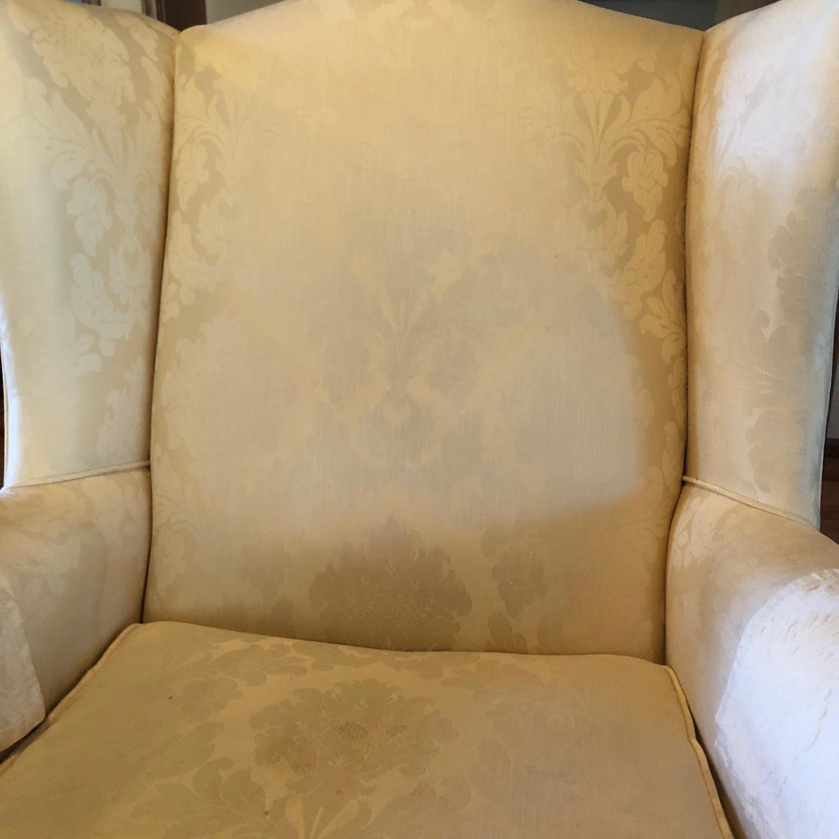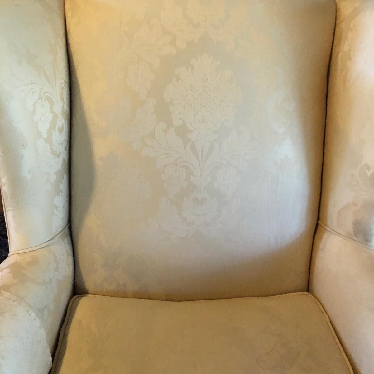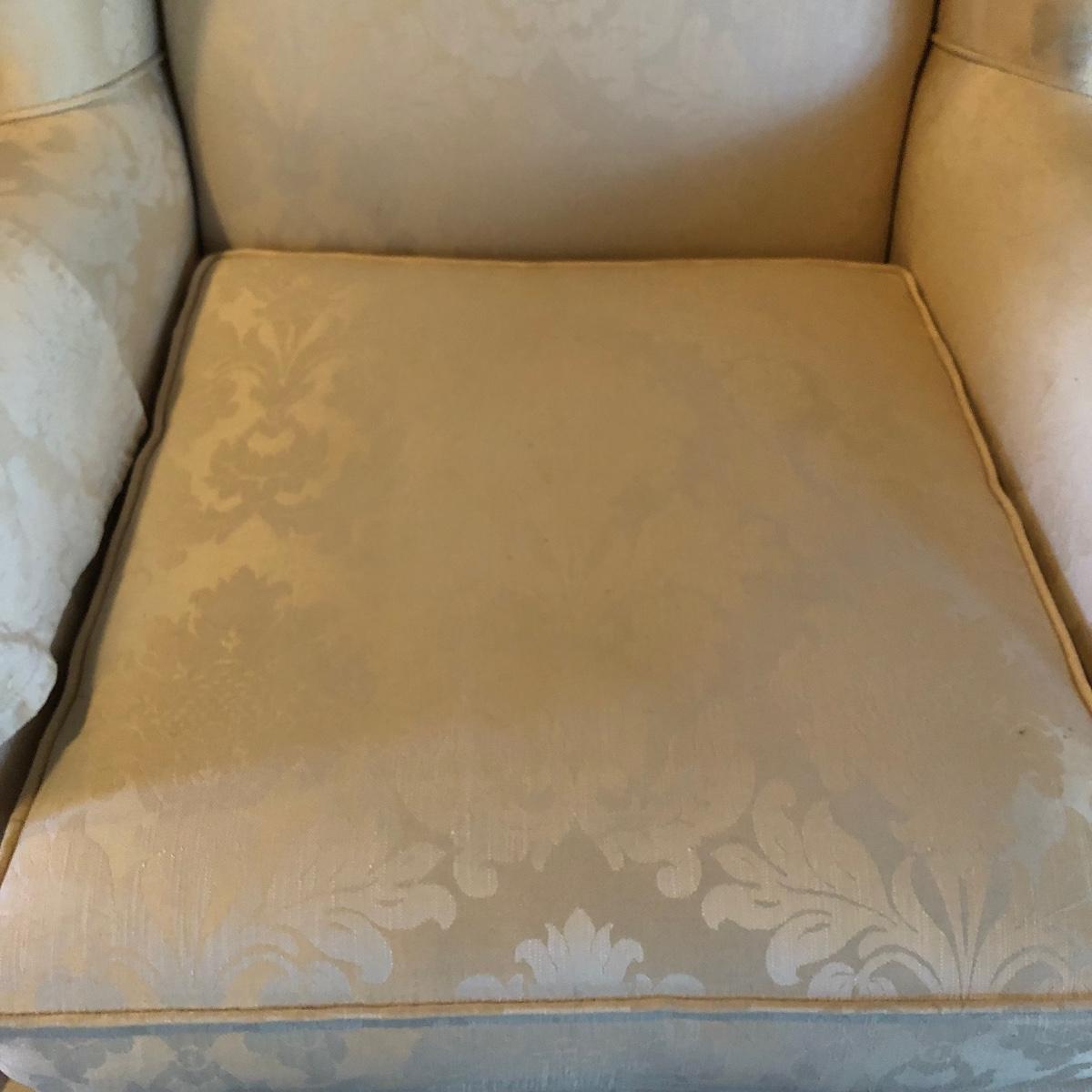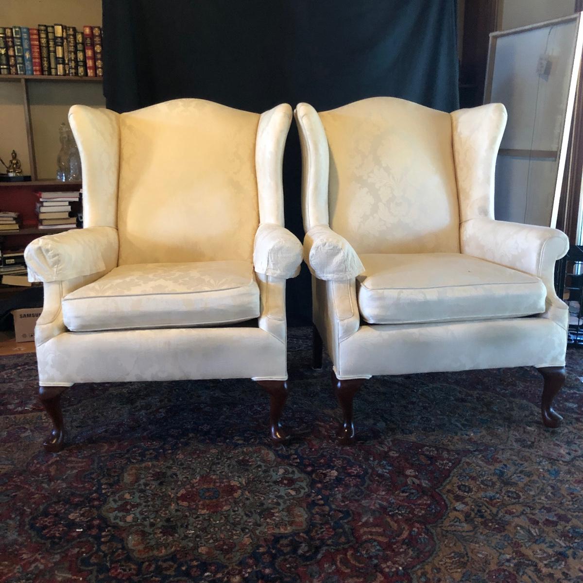 Lot includes two matching fabric padded arm chairs by Pennsylvania House. Chairs have wooden feet. Chairs have a few small stains on seat and back, see pictures. Chairs measure 32” x 35” x 41” with a 20” seat height.