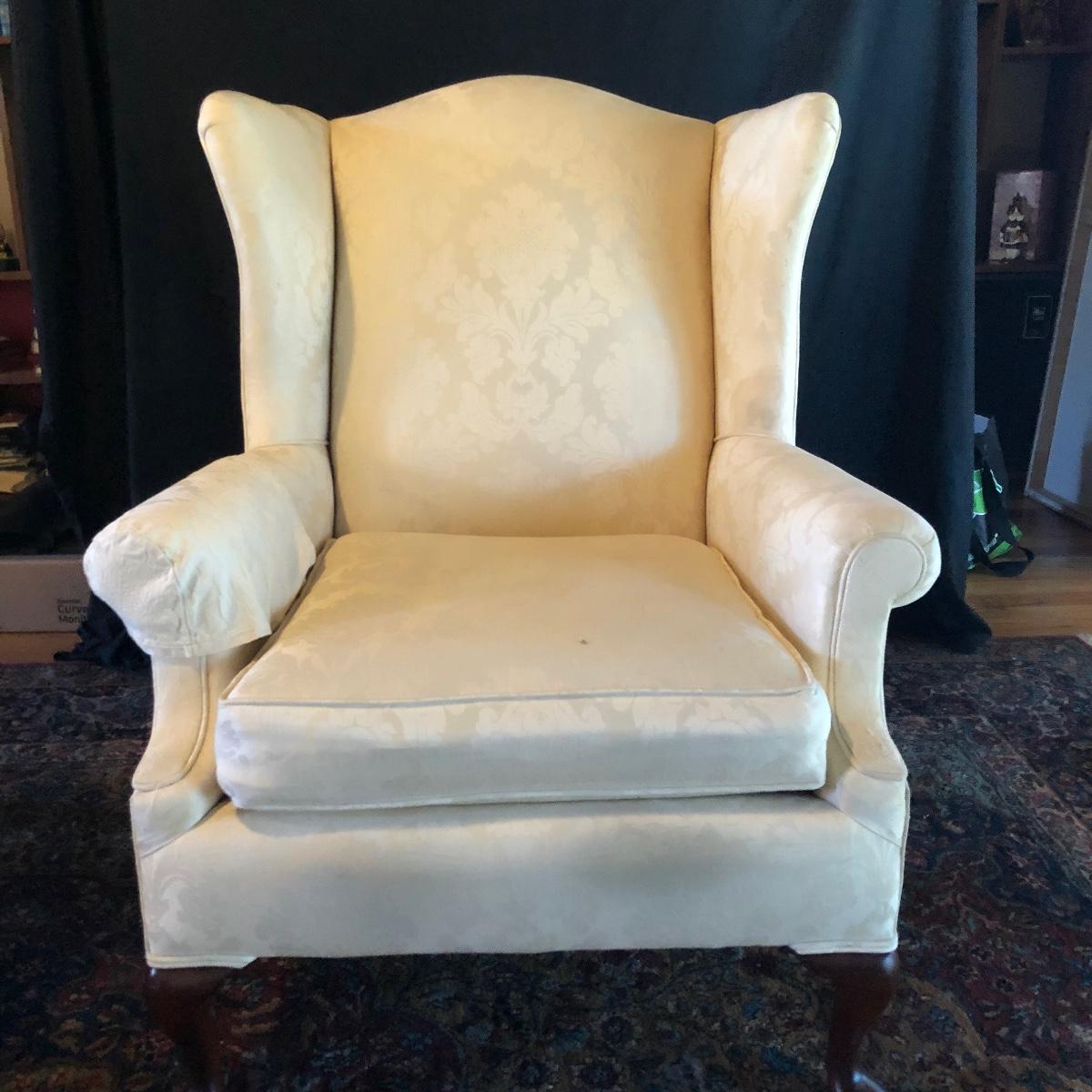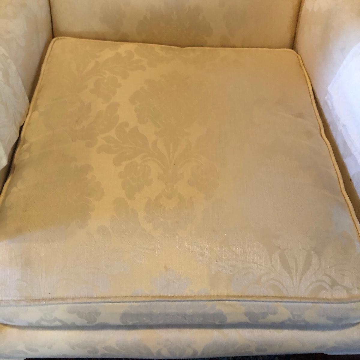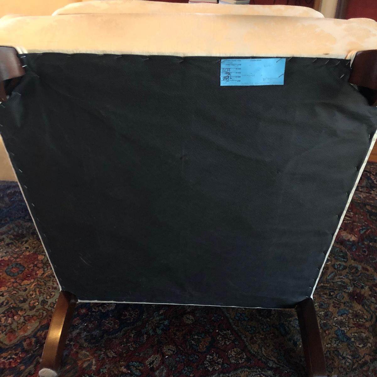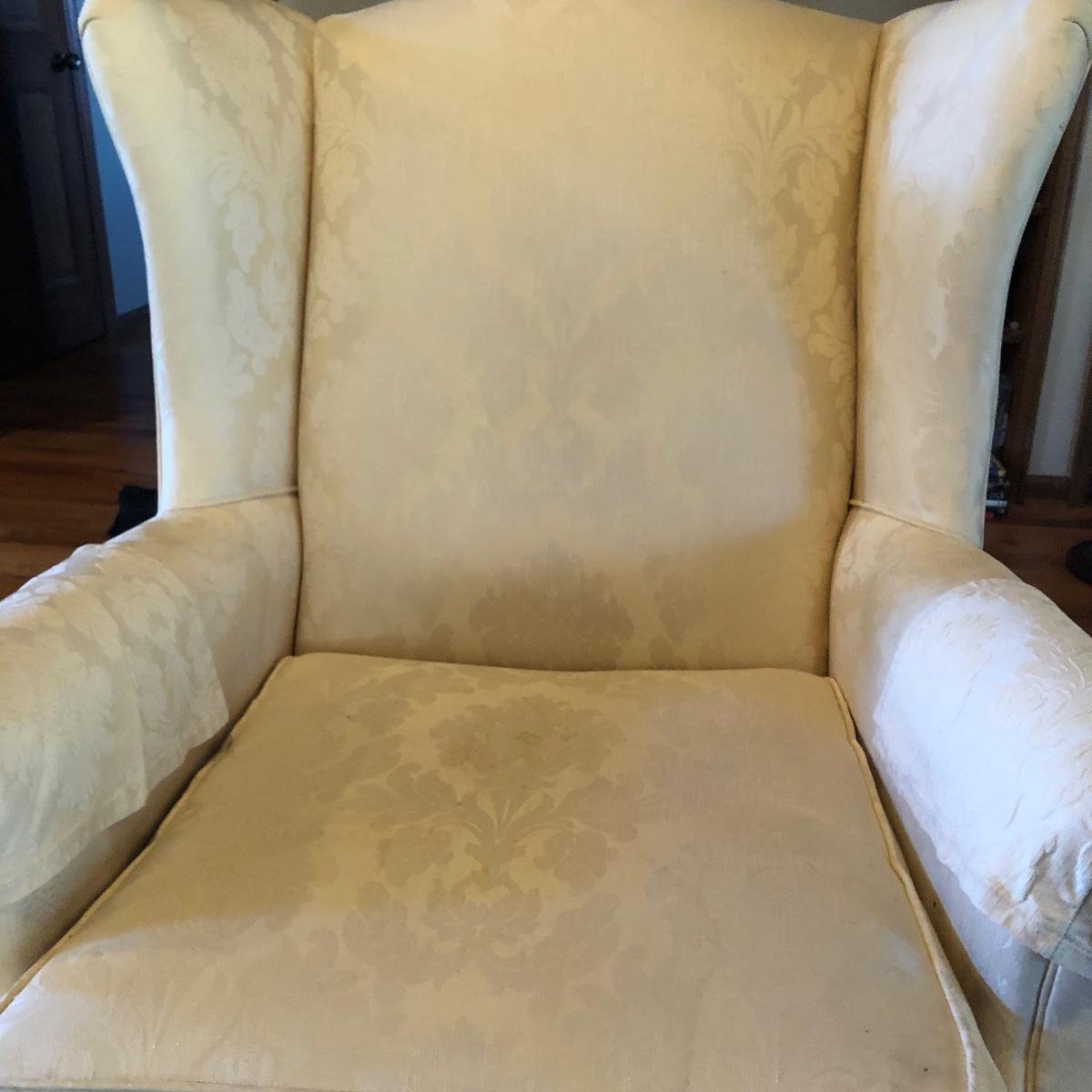 Lot includes two matching fabric padded arm chairs by Pennsylvania House. Chairs have wooden feet. Chairs have a few small stains on seat and back, see pictures. Chairs measure 32” x 35” x 41” with a 20” seat height.