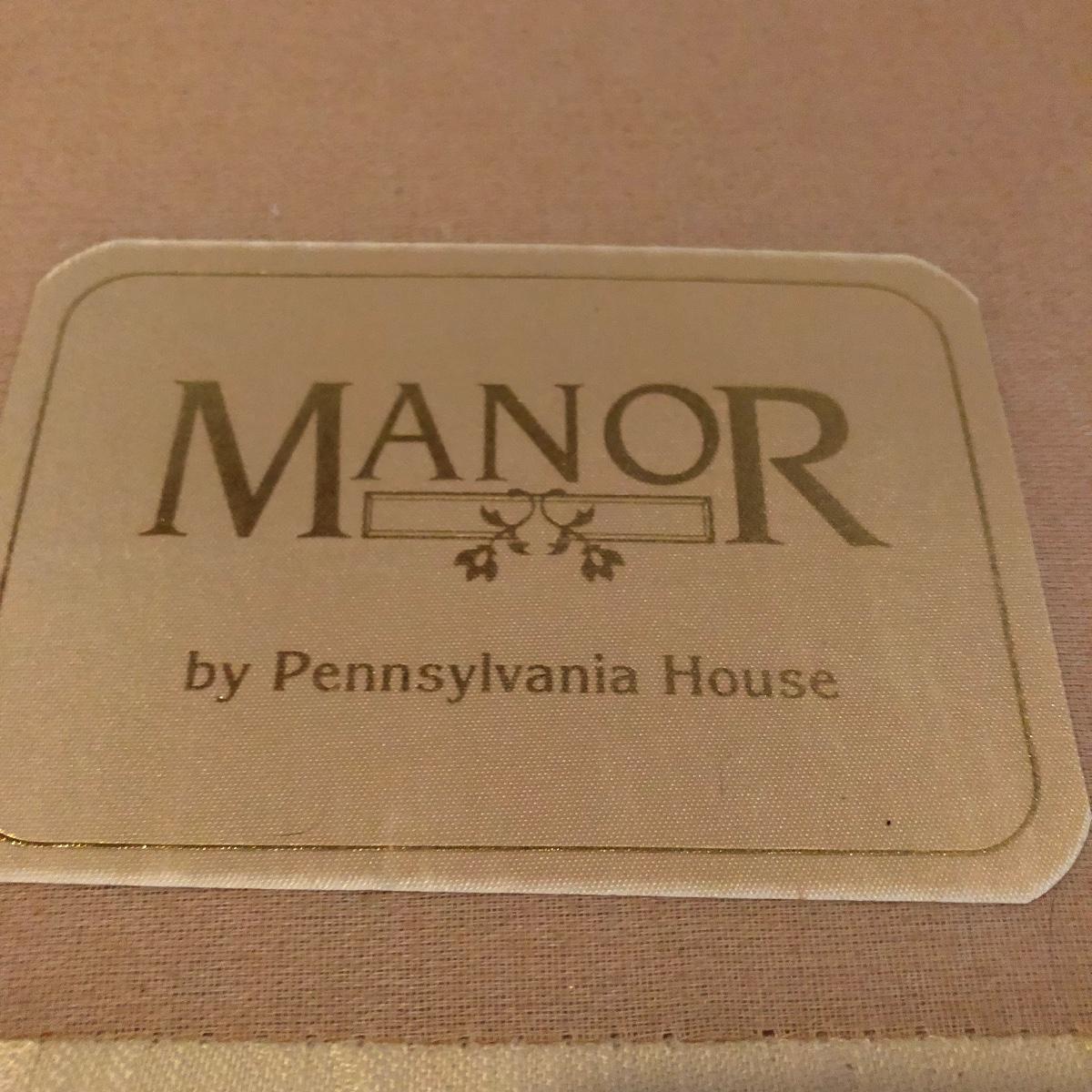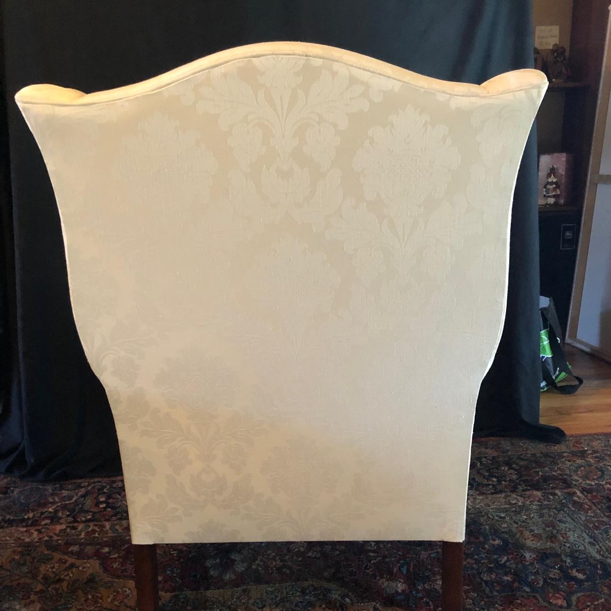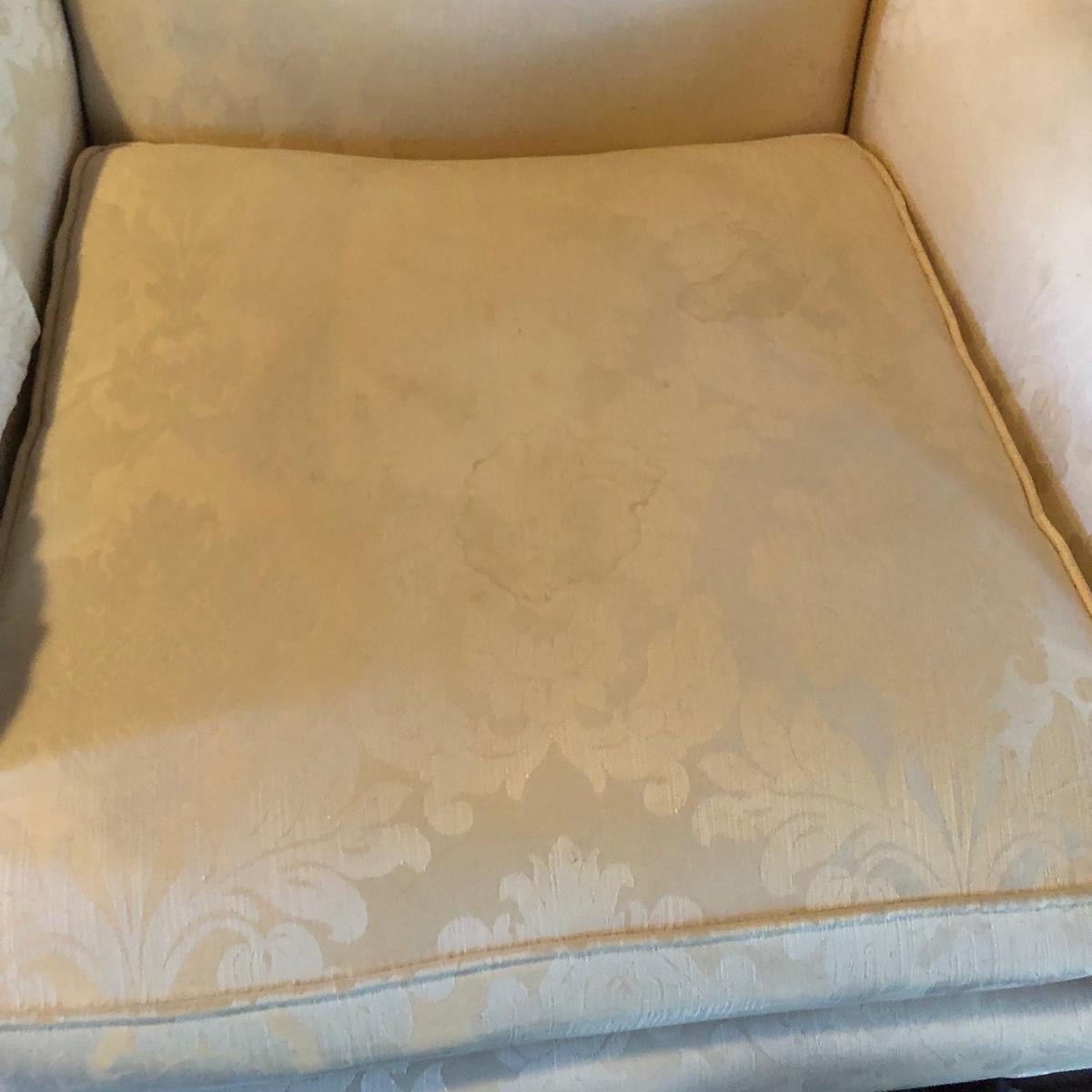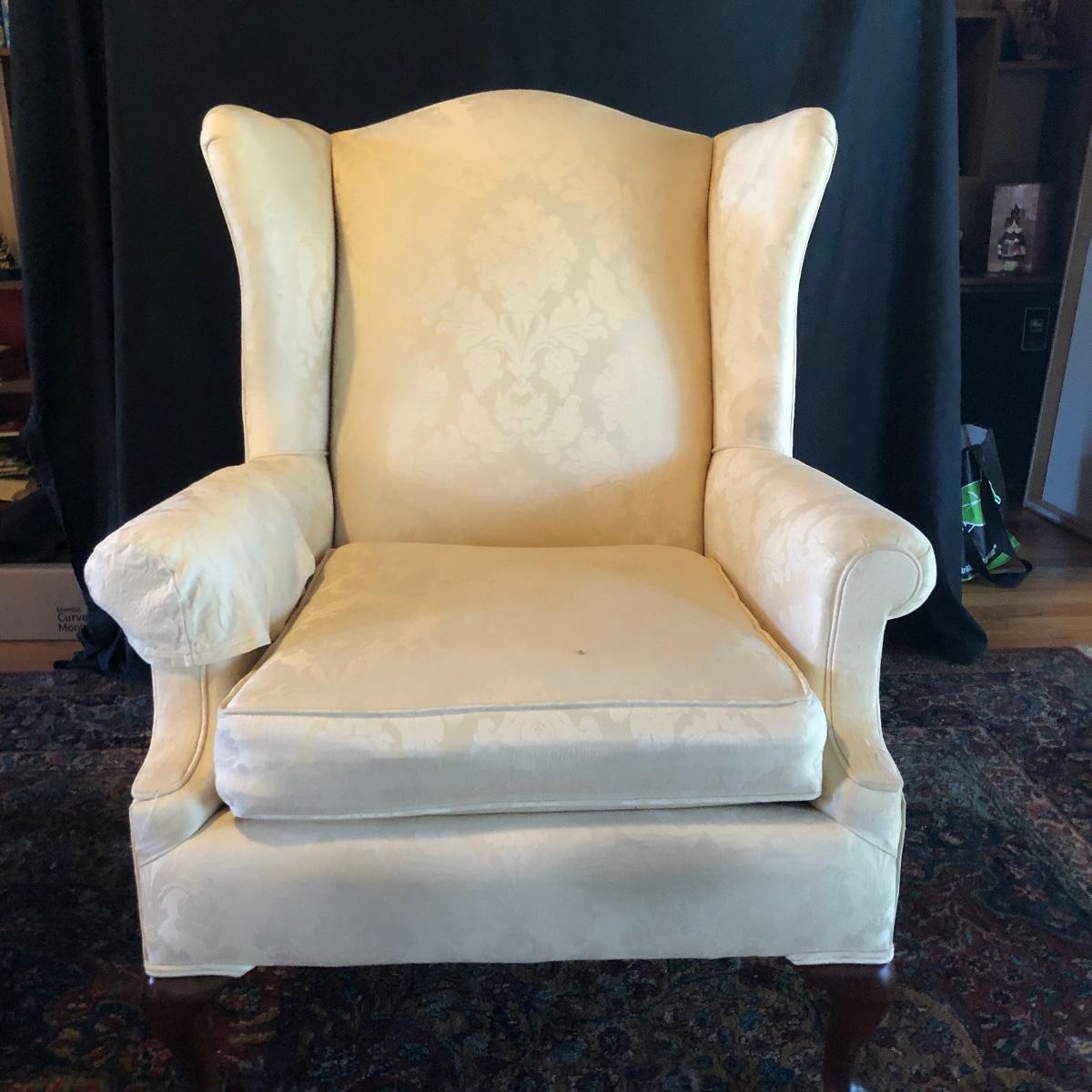 Lot includes two matching fabric padded arm chairs by Pennsylvania House. Chairs have wooden feet. Chairs have a few small stains on seat and back, see pictures. Chairs measure 32” x 35” x 41” with a 20” seat height.