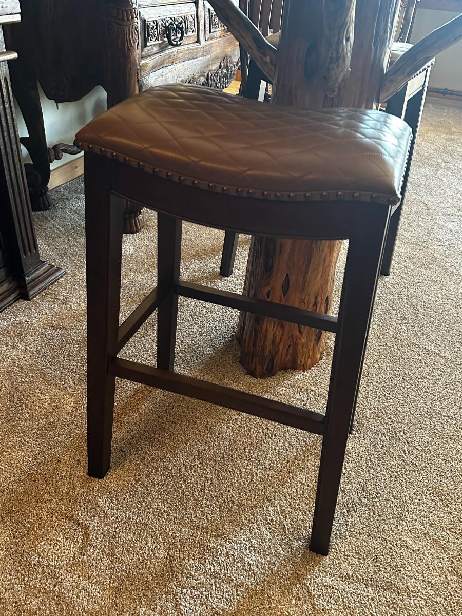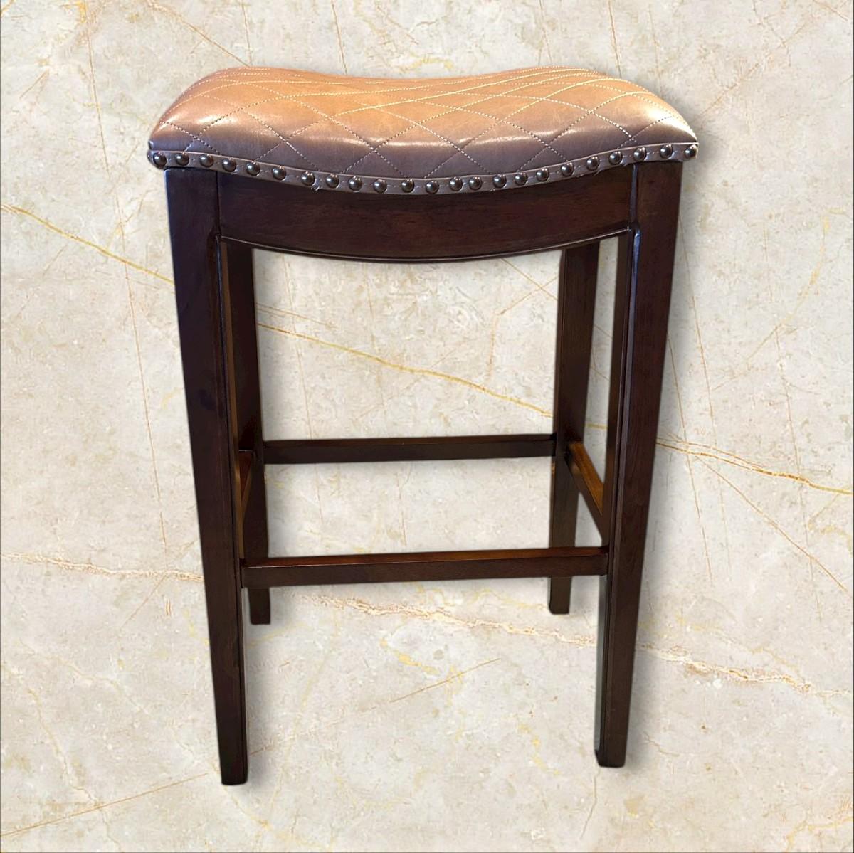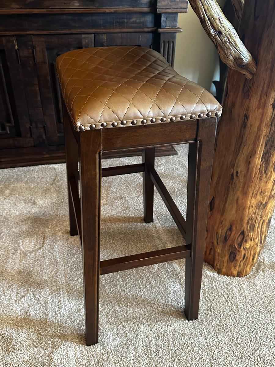 Pair of Solid Wood, Brown Quilted Saddle Bar Stools with Nail Head Trim