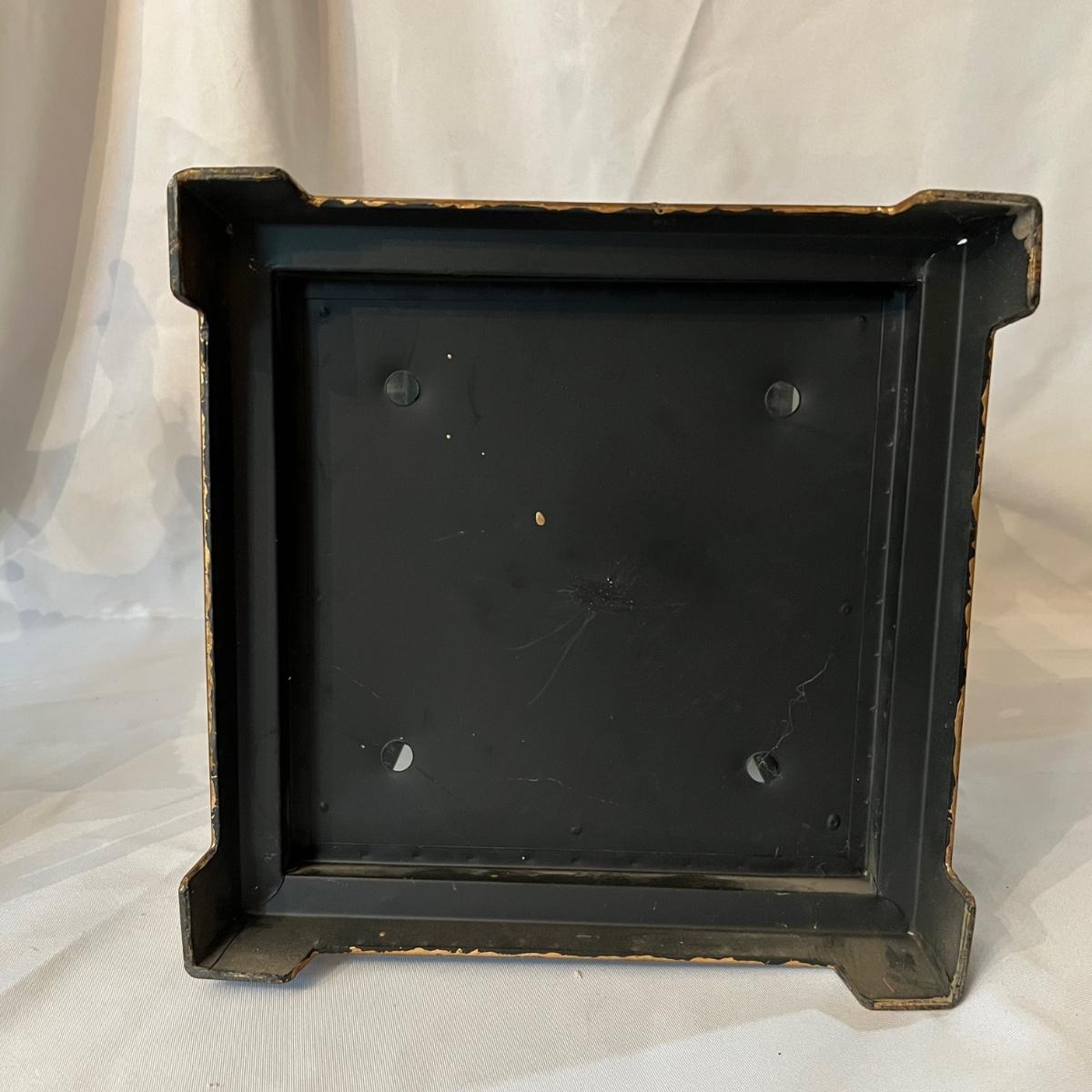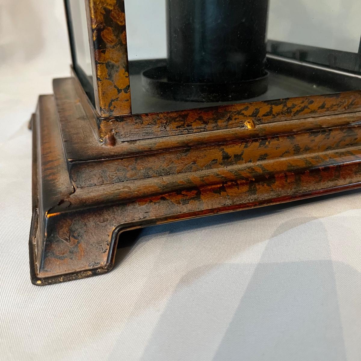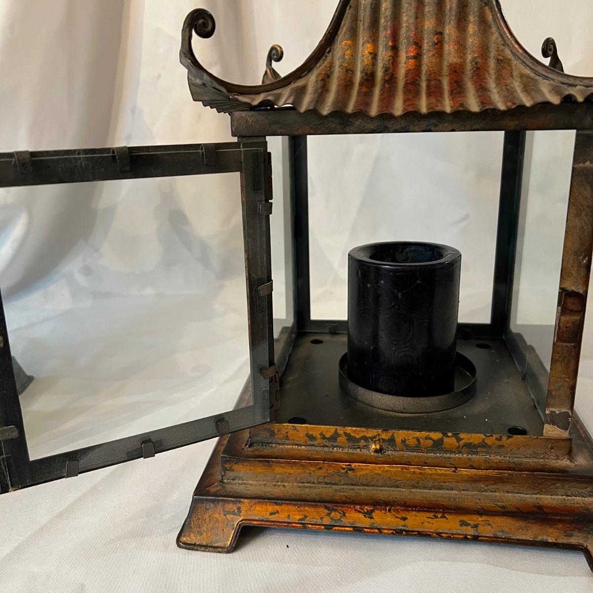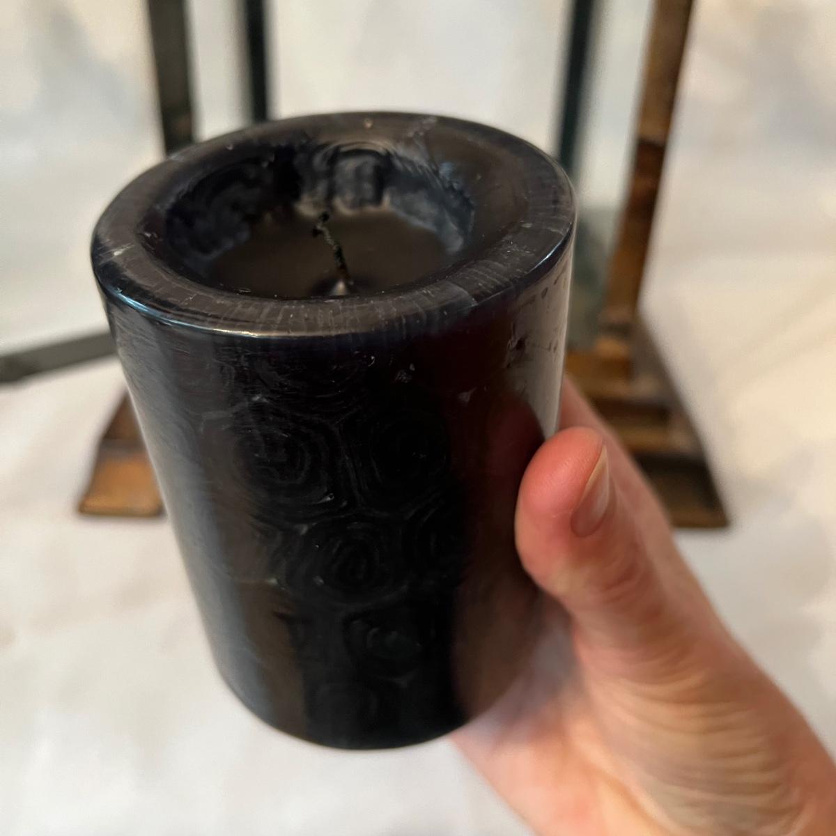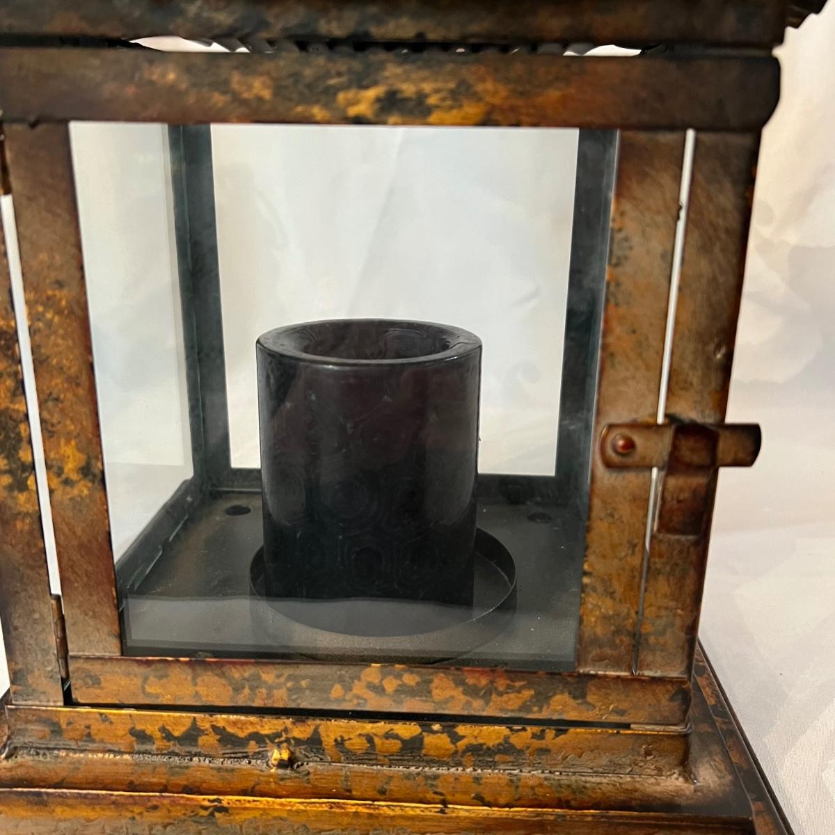 This pair of metal lanterns have a copper like finish and have hooks for hanging. They each house scented black candles that have seen possibly one use, if that.