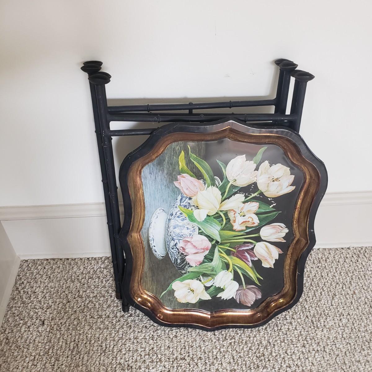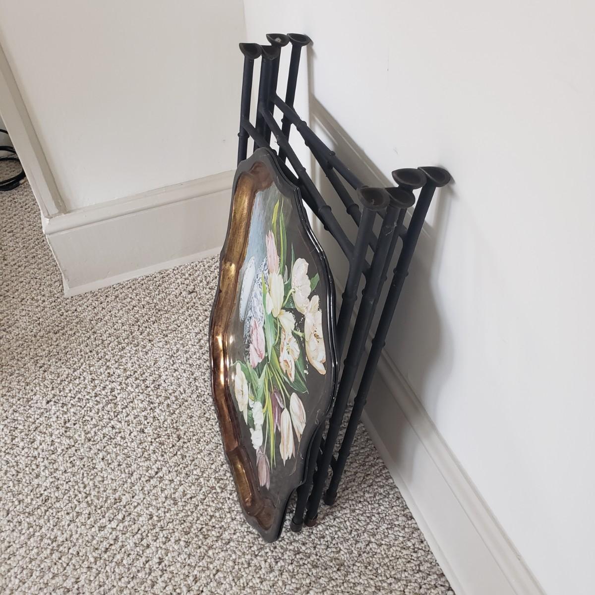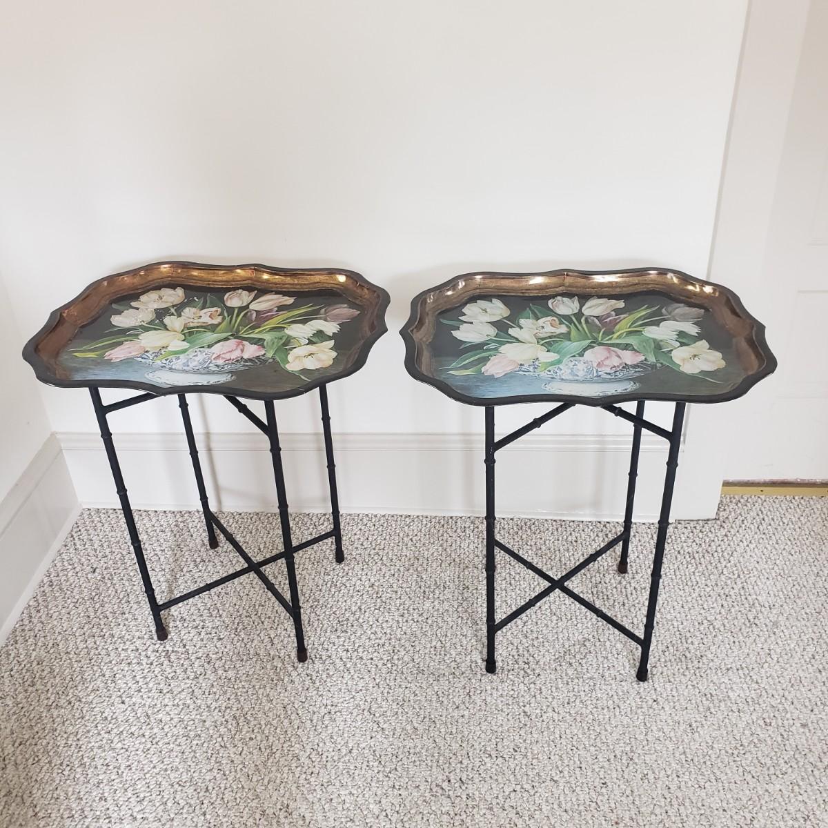 This pair of collapsible metal tray tables. Trays are made by Keller Charles-Painting by Galley. Assembled they measure 22" x 18" x 25"H. The stands are made of metal with rubber at both ends. One tray needs cleaning as seen in picture.