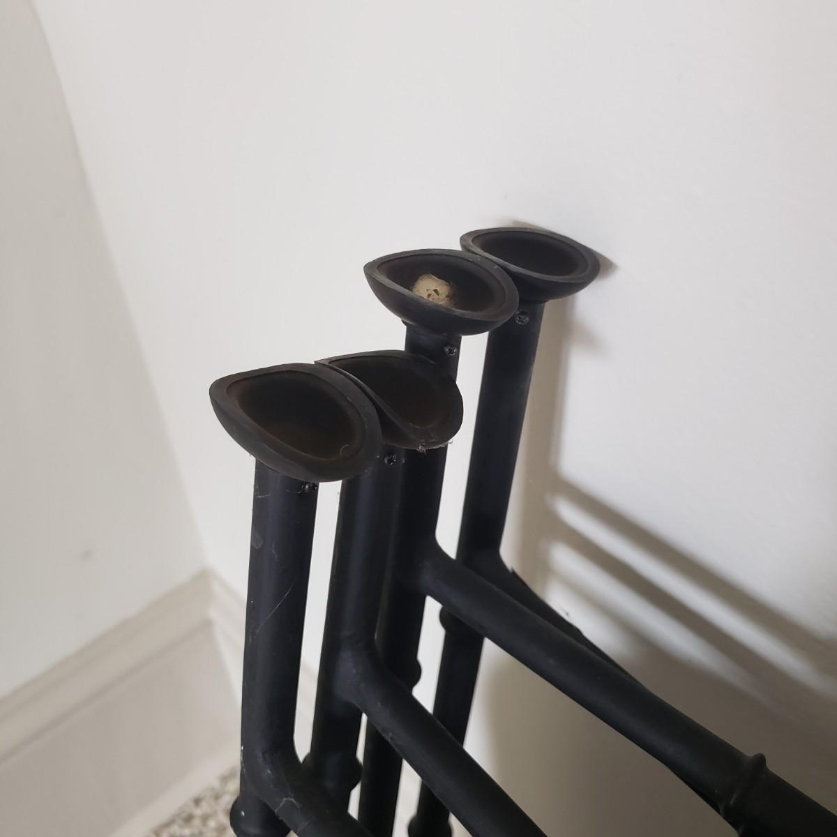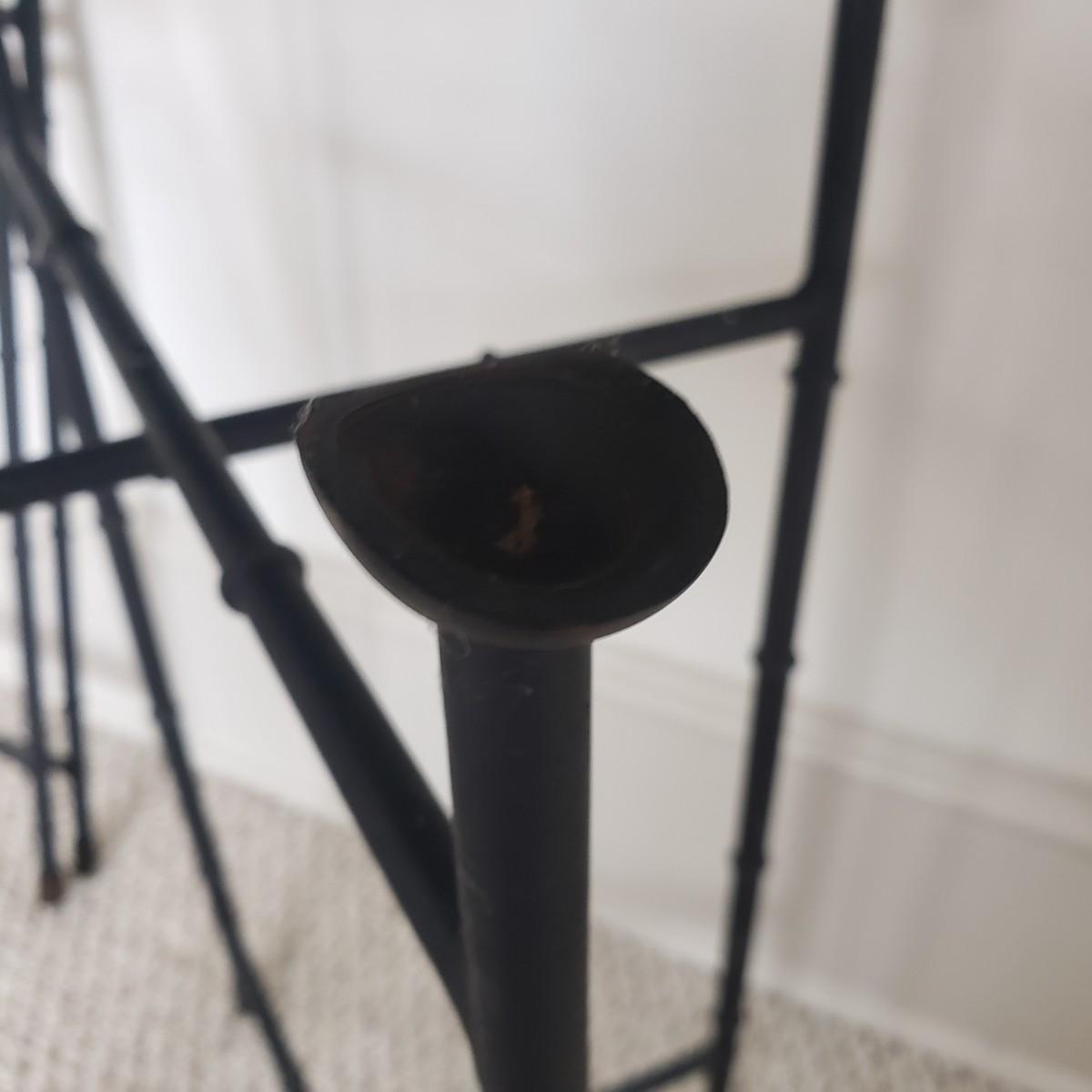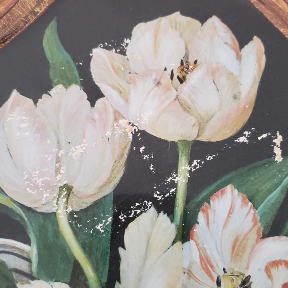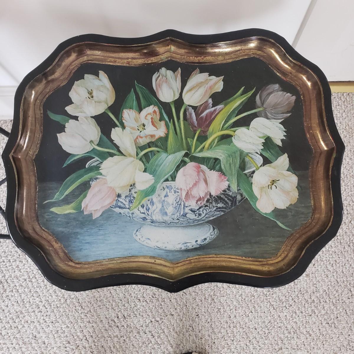 This pair of collapsible metal tray tables. Trays are made by Keller Charles-Painting by Galley. Assembled they measure 22" x 18" x 25"H. The stands are made of metal with rubber at both ends. One tray needs cleaning as seen in picture.