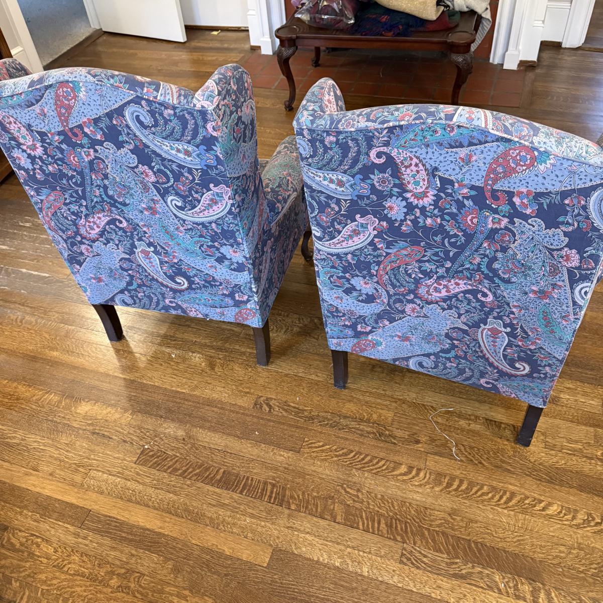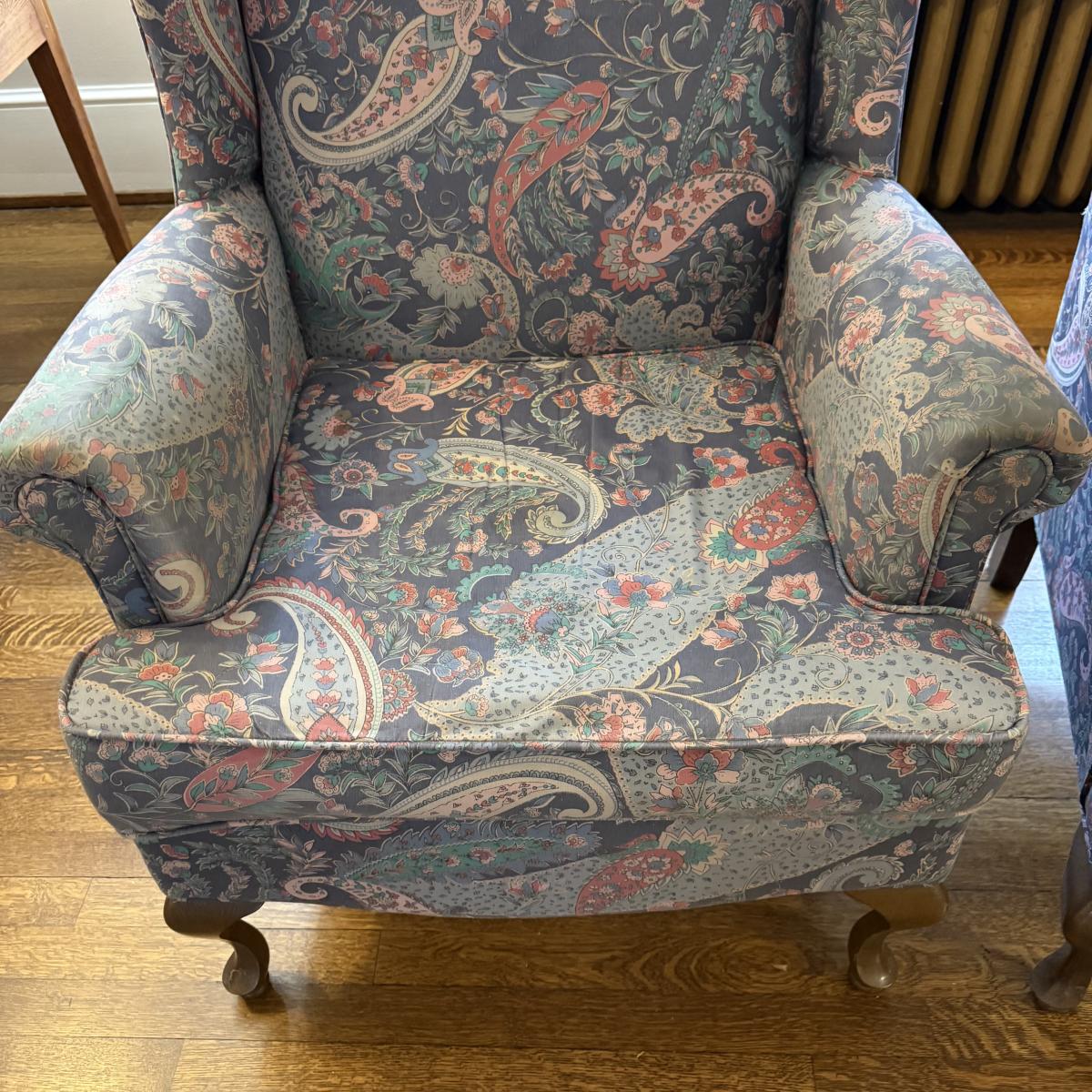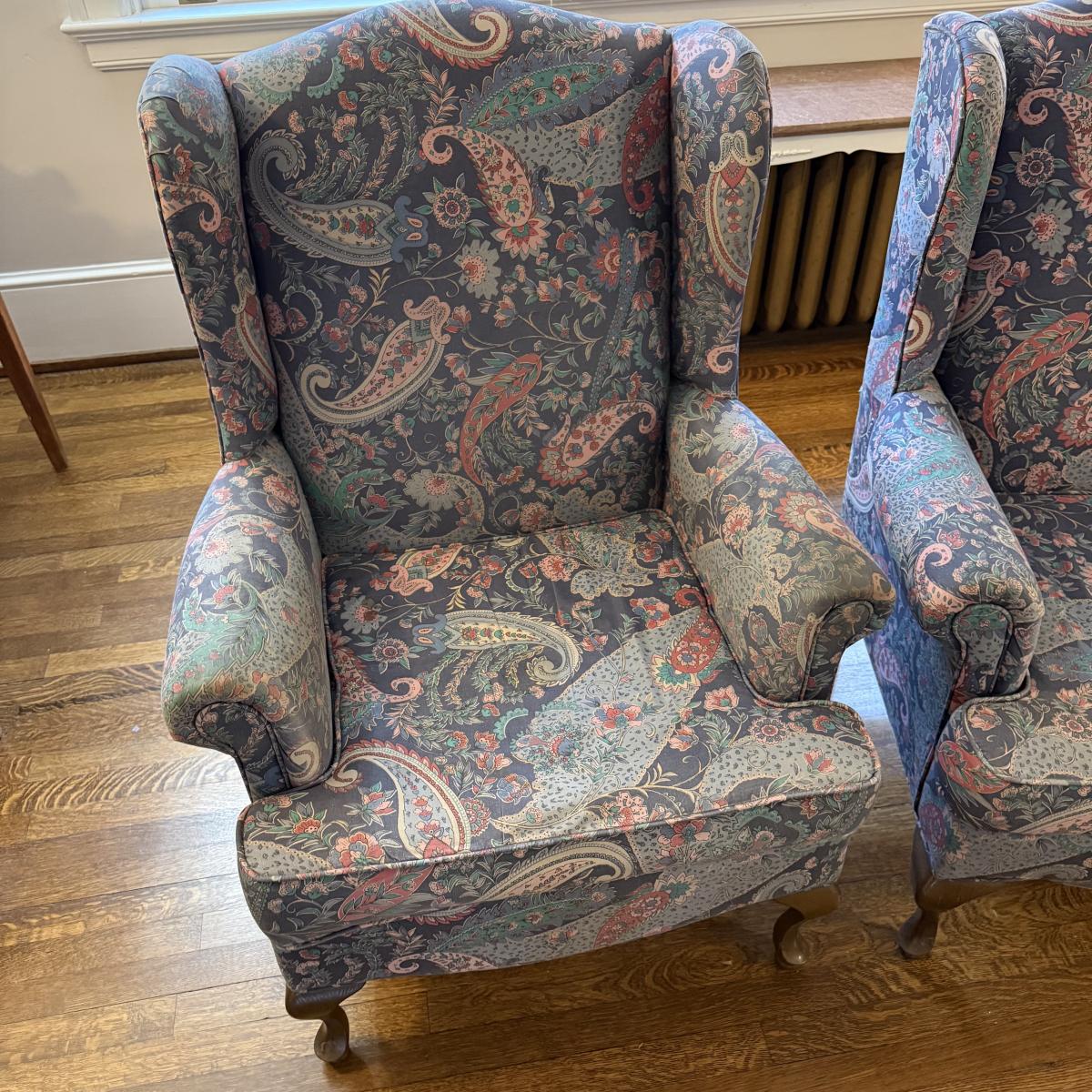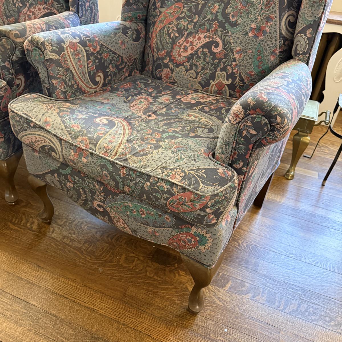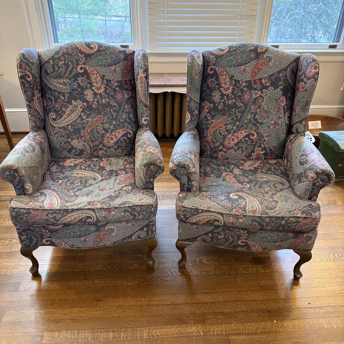 This lot contains an incredible pair of paisley wing back armchairs. These chairs are comfy and timeless! Both of them measure 25” x 26.5” x 41.5”H. These chairs are a little mature and do have a normal amount of wear, see pictures for details. Local pick up only. Winning bidder must bring assistance to help move and load this item due to its weight and/or size. This item is located on the second level of the house, and you will need to travel down one set of stairs and up a second set outside to the park port.