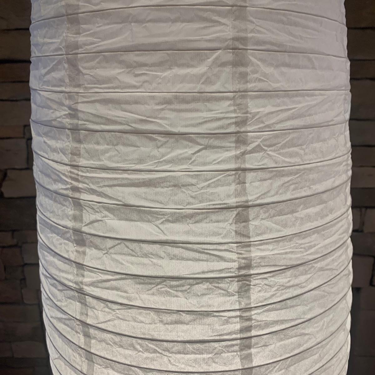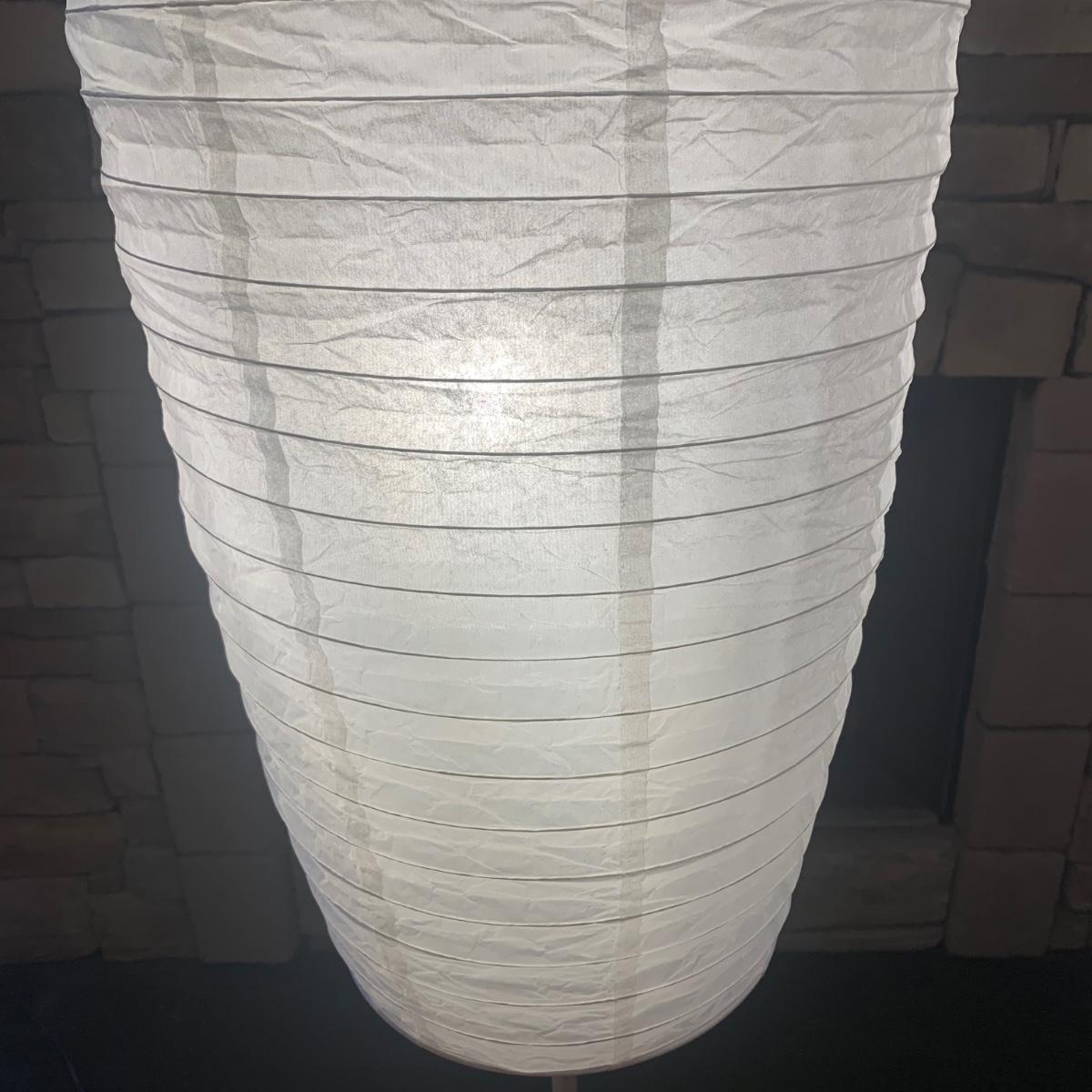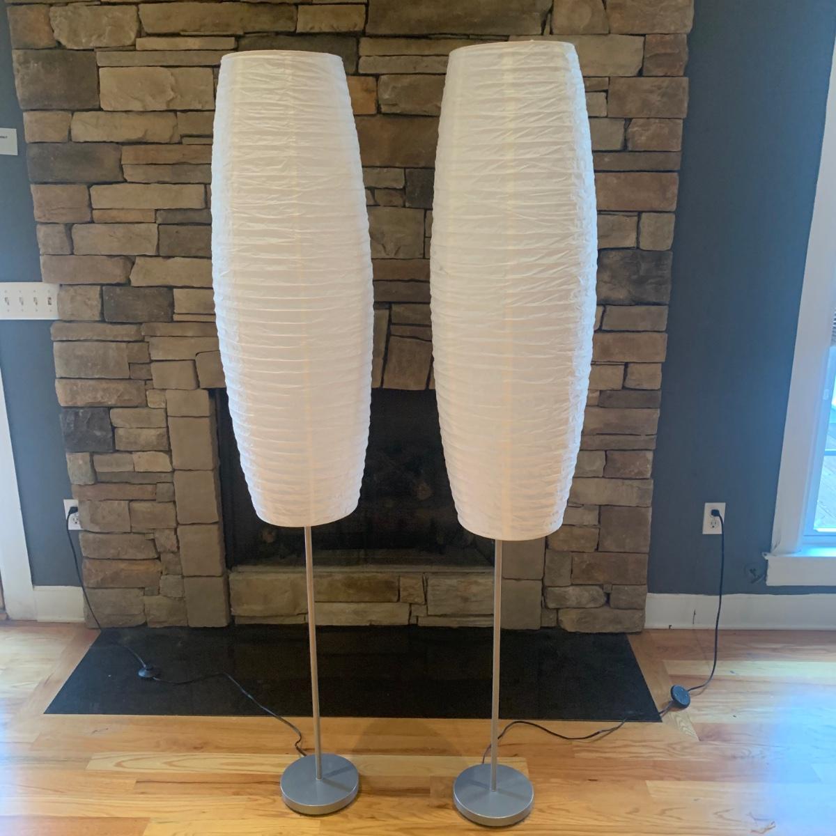 Pair of paper lantern-style floor lamps. Each lamp measuring, 12”D x 69”H. Both lamps have multiple blemishes and tears but still appear to be in good condition. Imperfections could be easily mended with tape or glue. Lamps power on using foot pedal.