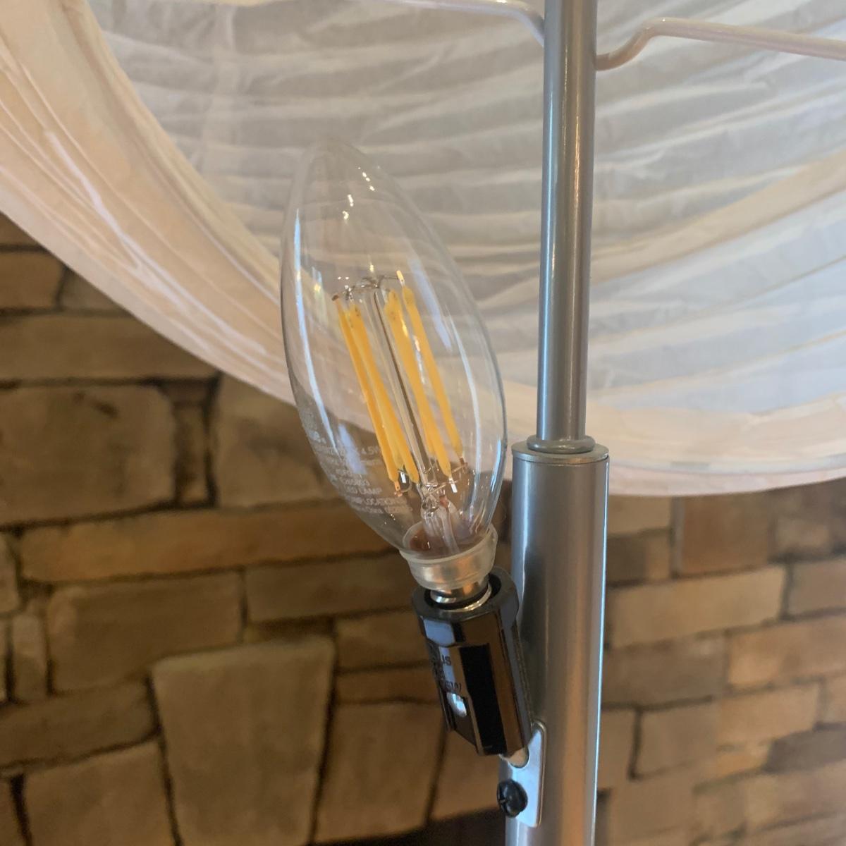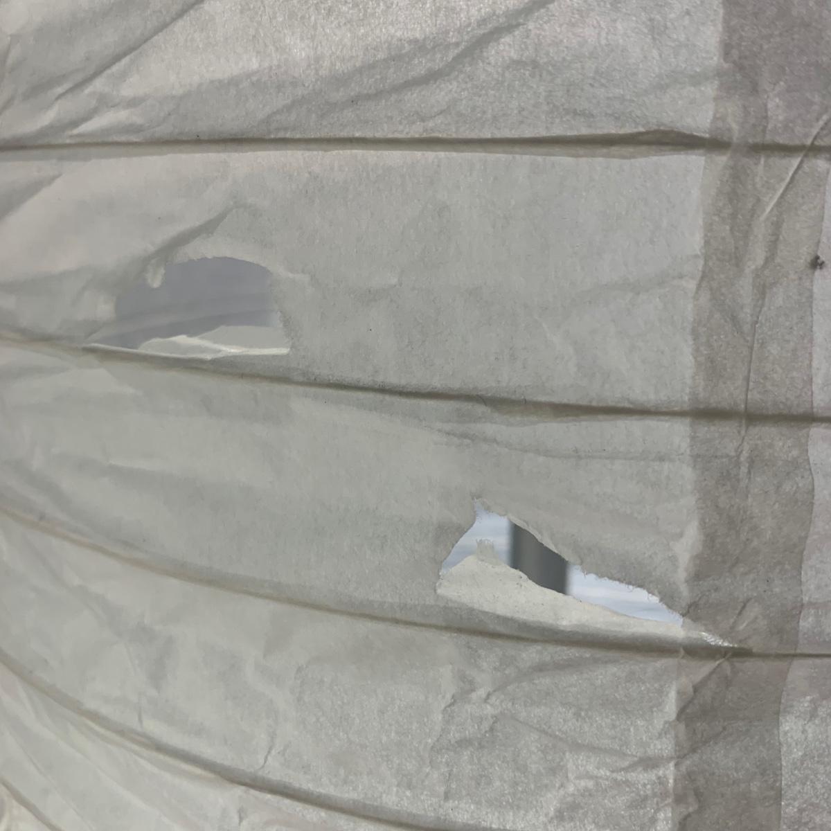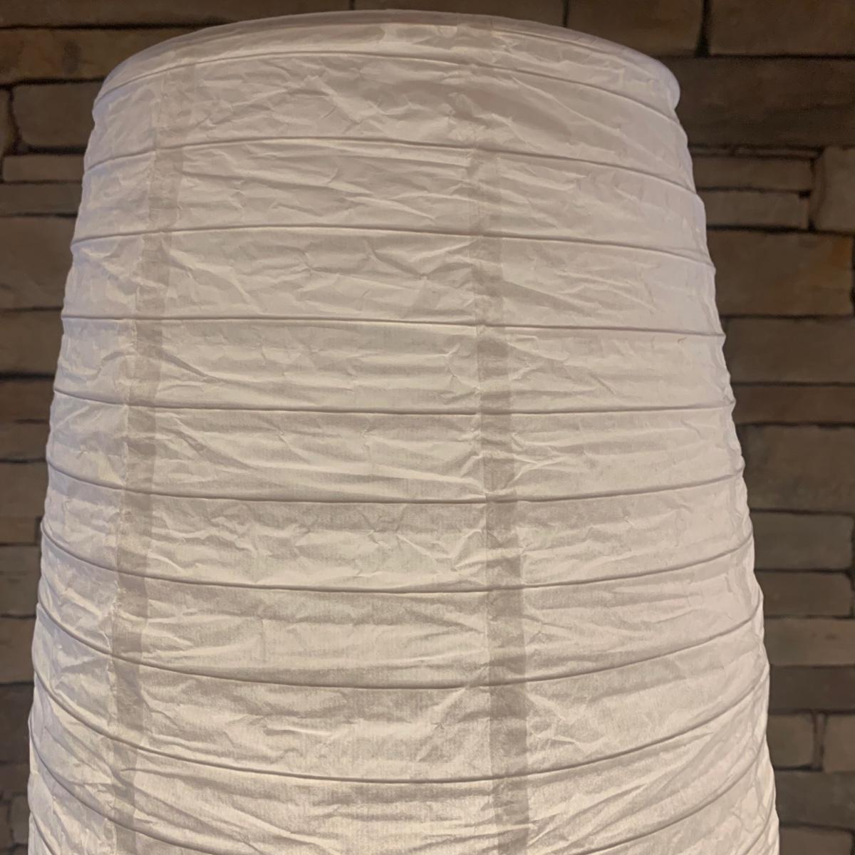 Pair of paper lantern-style floor lamps. Each lamp measuring, 12”D x 69”H. Both lamps have multiple blemishes and tears but still appear to be in good condition. Imperfections could be easily mended with tape or glue. Lamps power on using foot pedal.