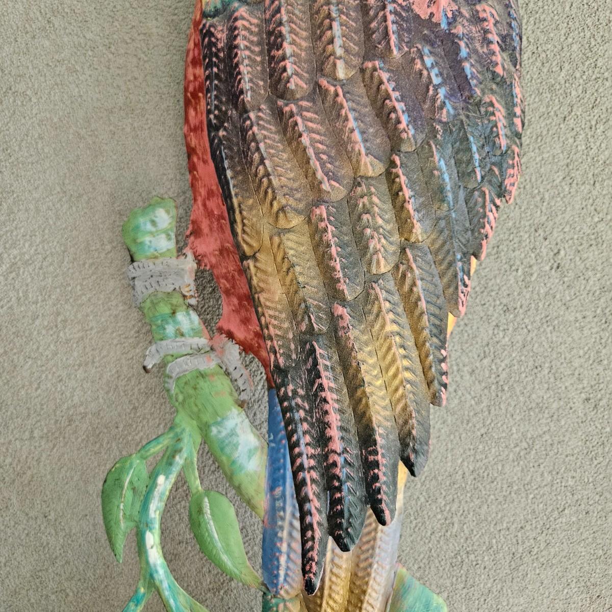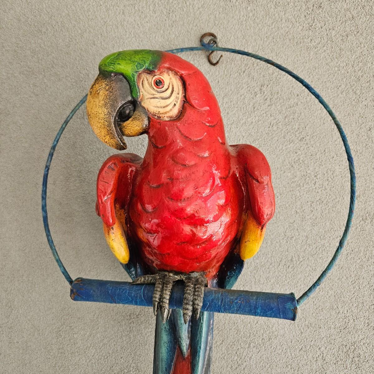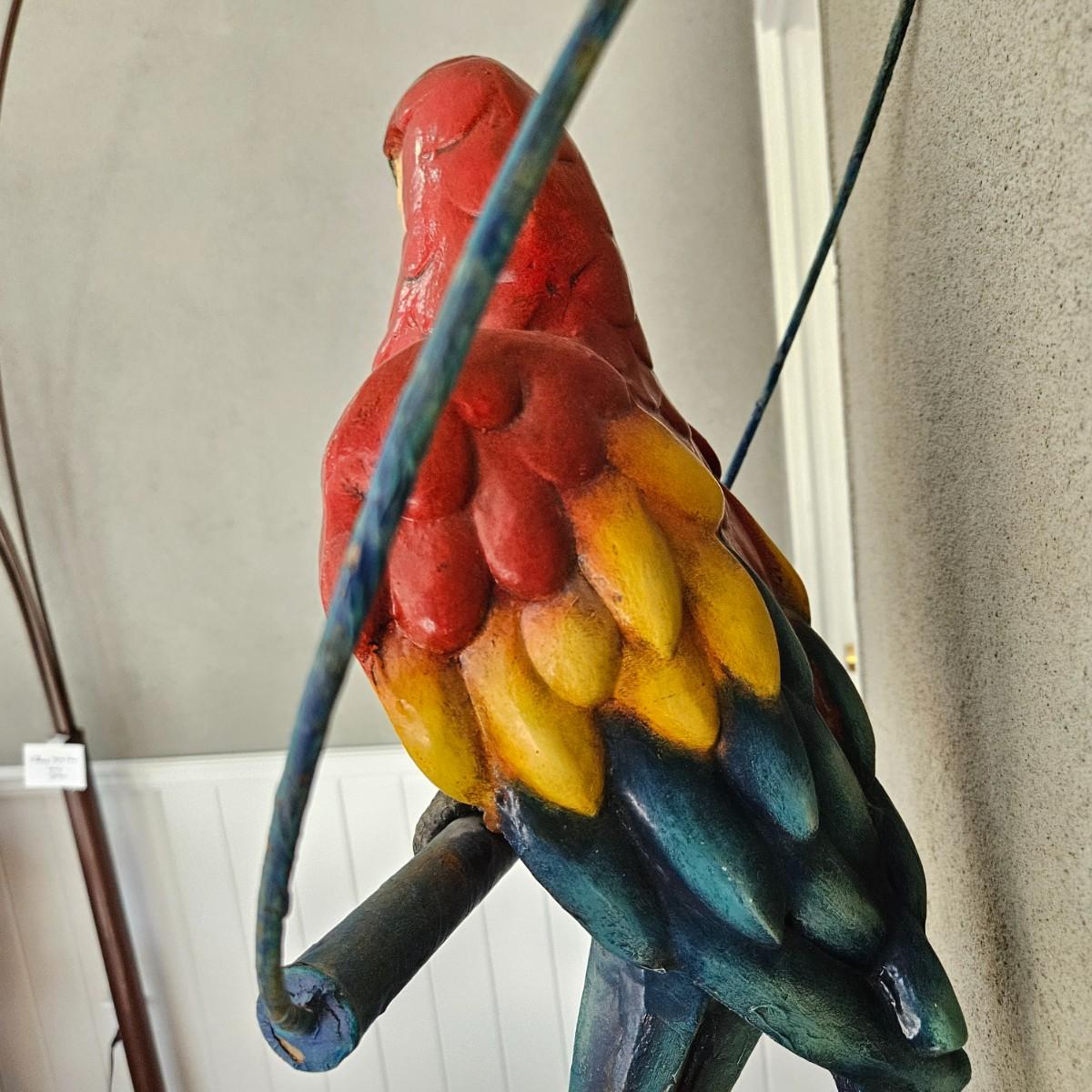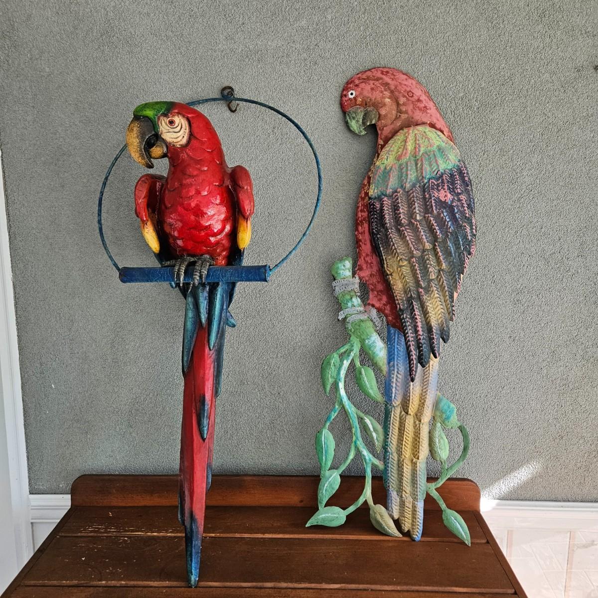 A pair of parrots with vivid coloring. One is made of metal and designed to hang on a wall. The other parrot appears to be blown plastic and hangs from a chain on its perch. It measures approximately 16" x 9" x 35"H. Shipping available