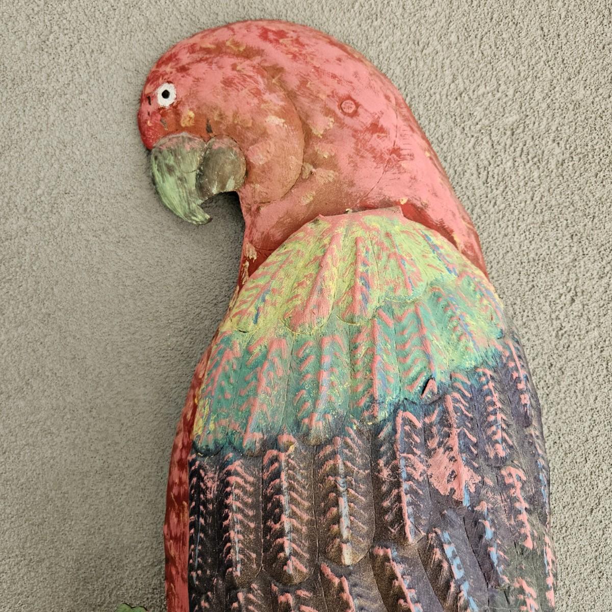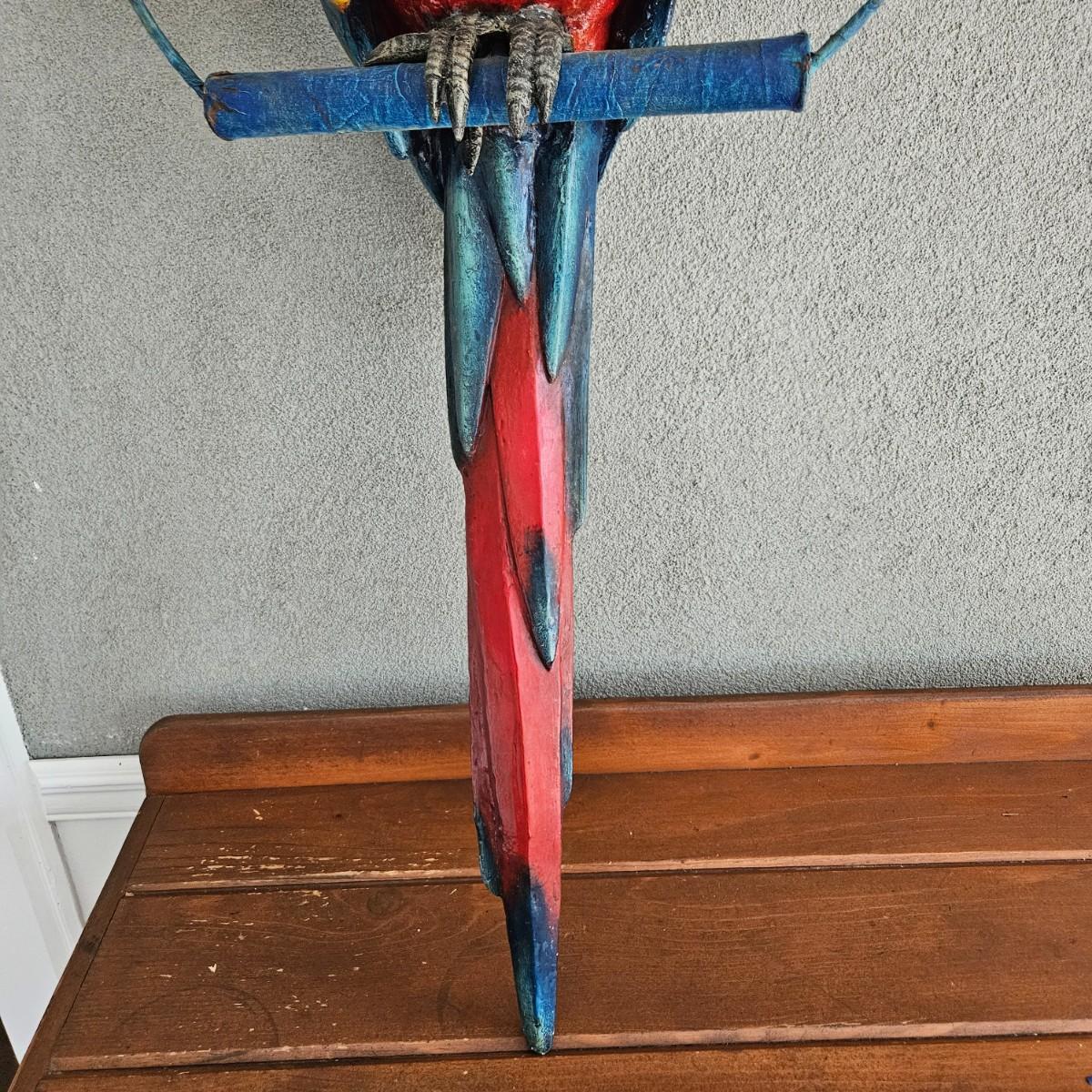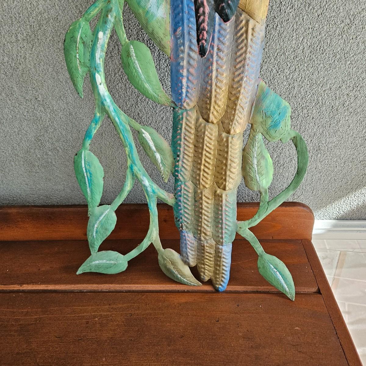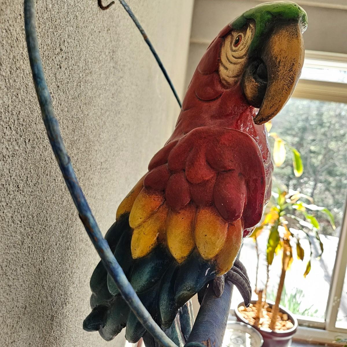 A pair of parrots with vivid coloring. One is made of metal and designed to hang on a wall. The other parrot appears to be blown plastic and hangs from a chain on its perch. It measures approximately 16" x 9" x 35"H. Shipping available