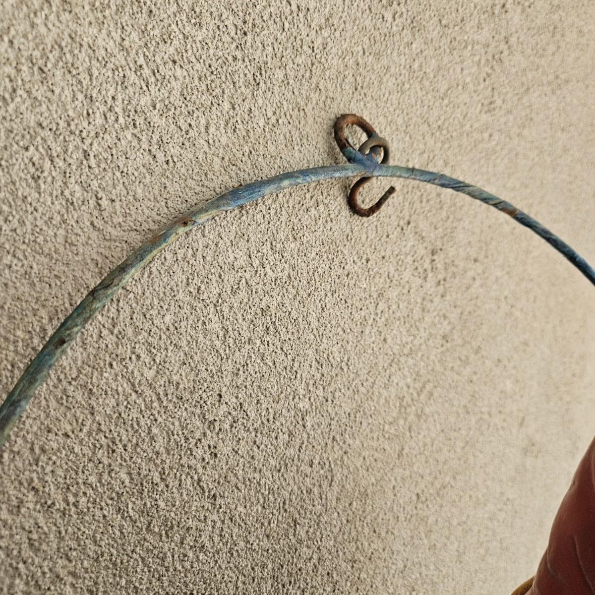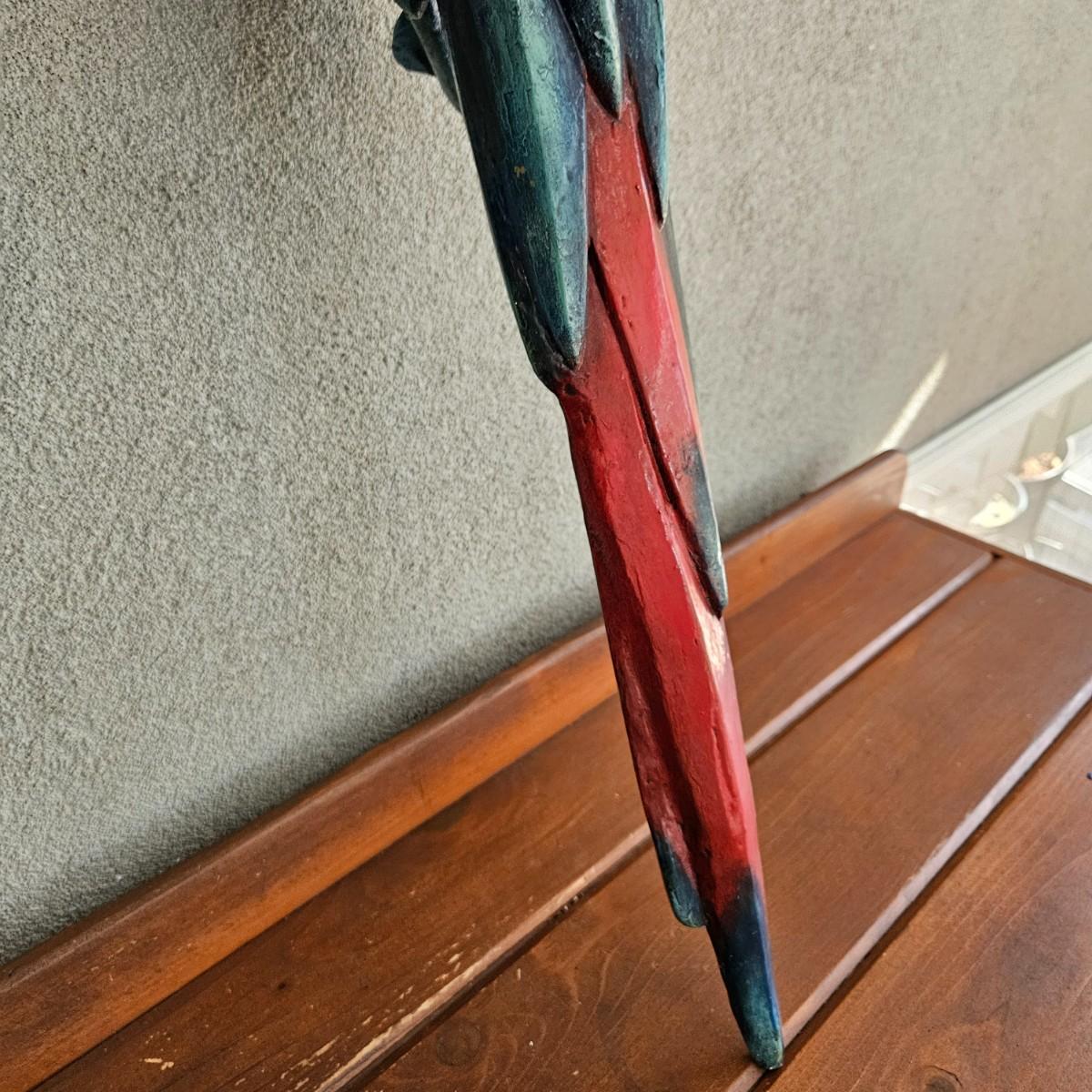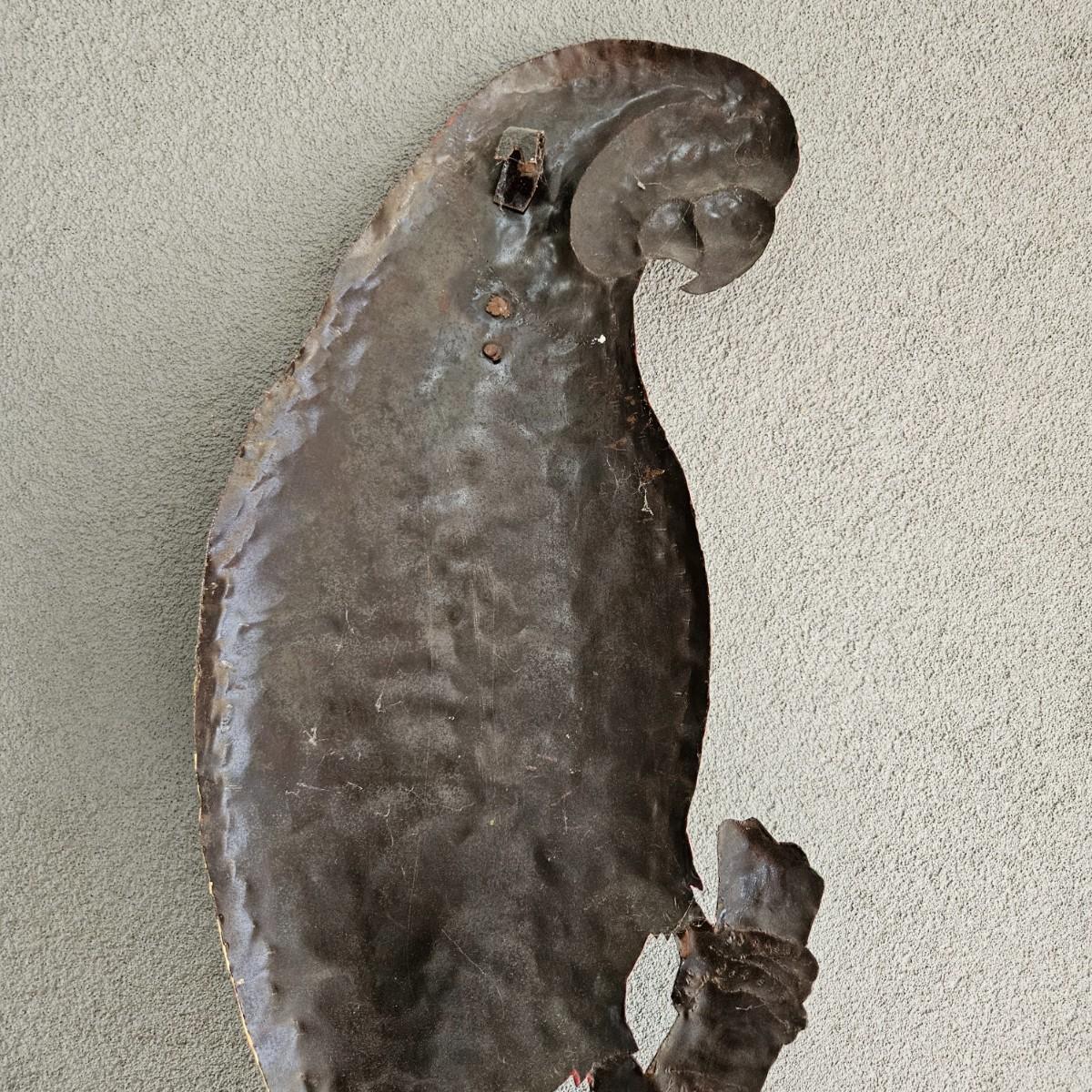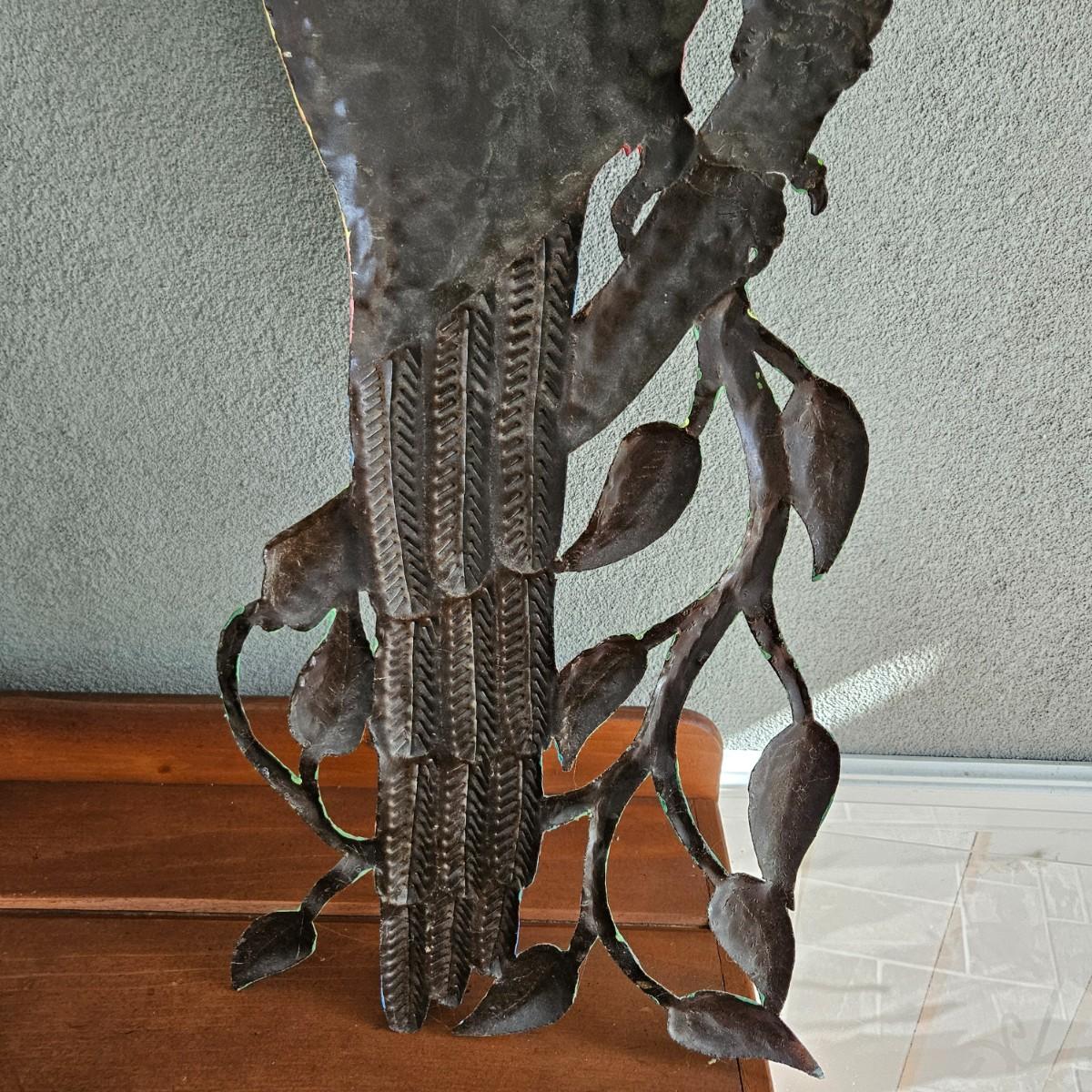 A pair of parrots with vivid coloring. One is made of metal and designed to hang on a wall. The other parrot appears to be blown plastic and hangs from a chain on its perch. It measures approximately 16" x 9" x 35"H. Shipping available