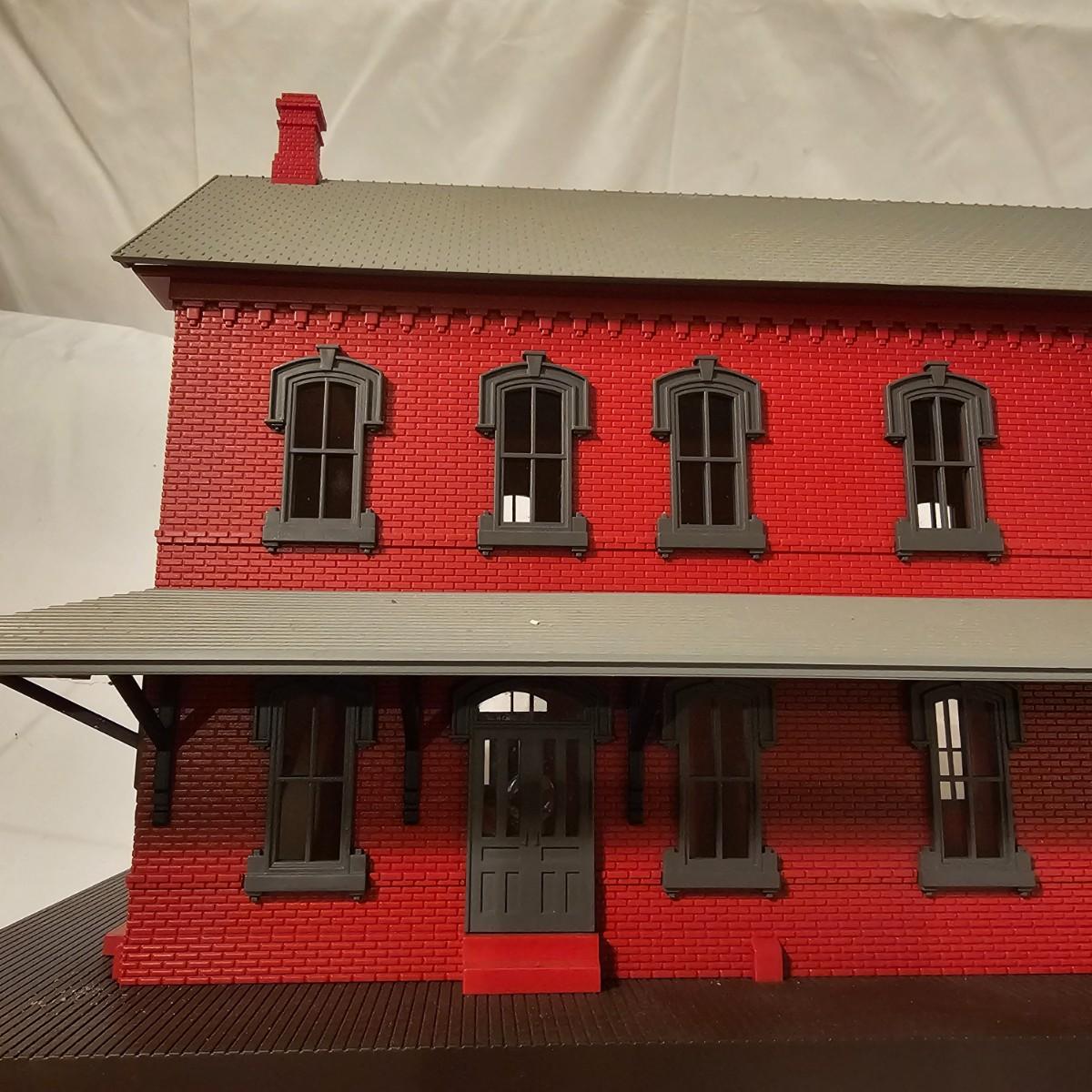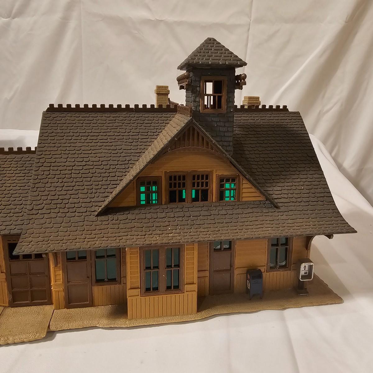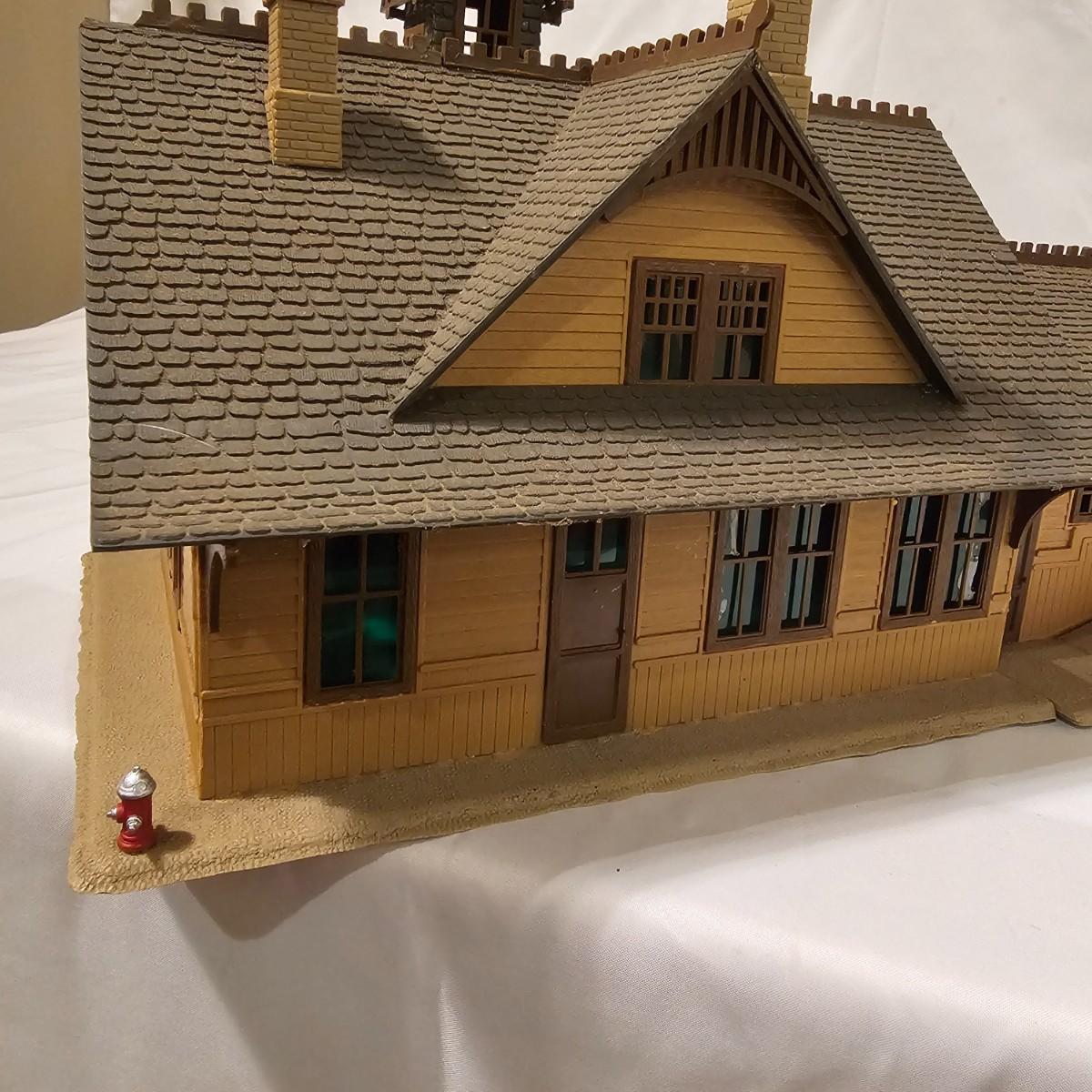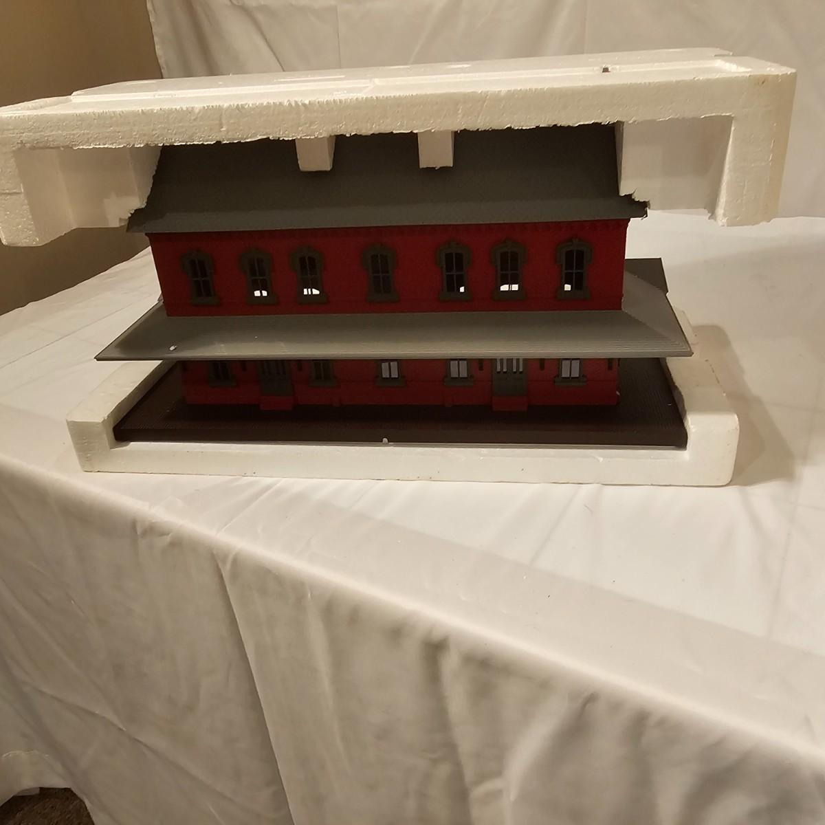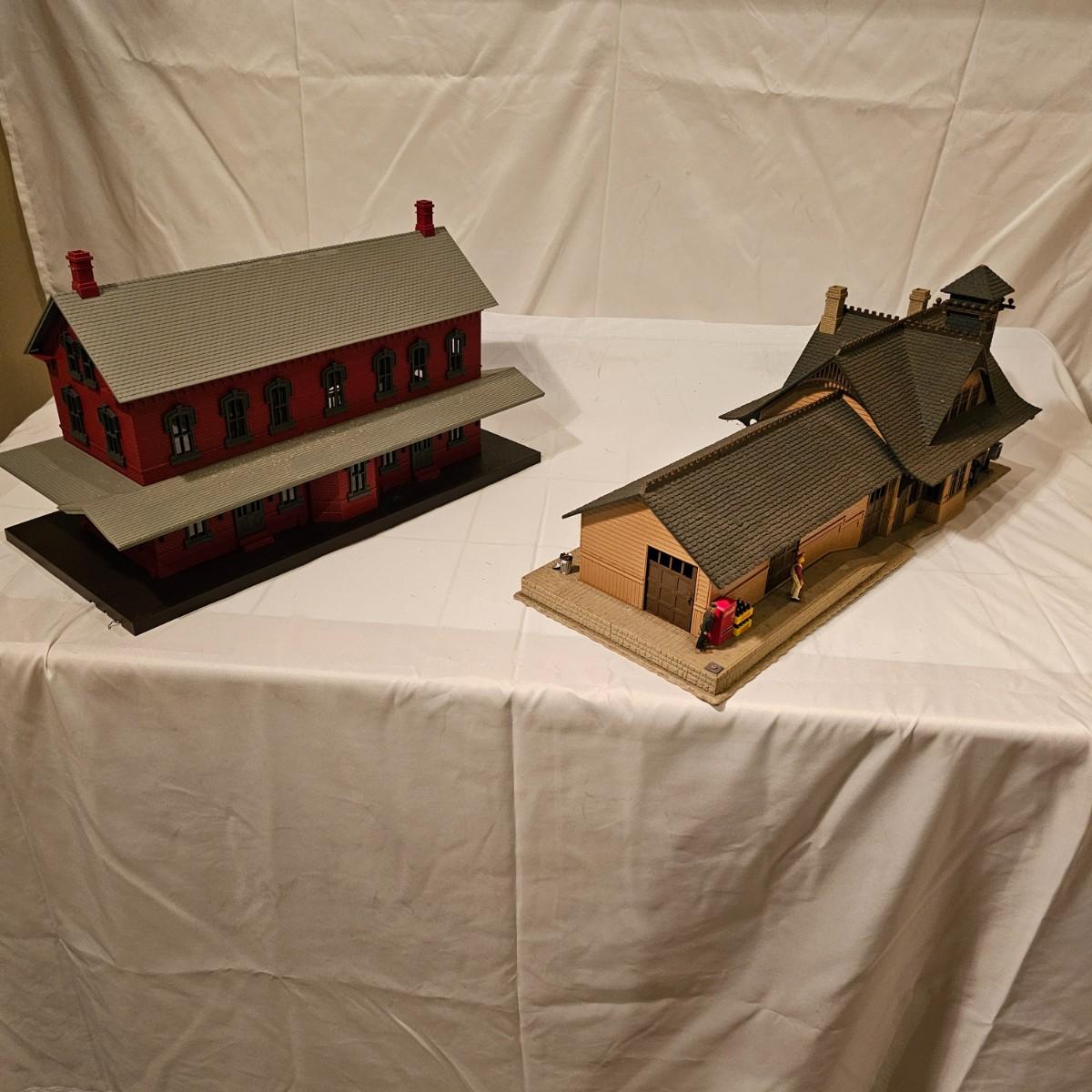 Two different pre-made passenger stations for your O scale layout. Tan and brown item has station on one end and a freight house attached to the other. Many outside details and figures. 22.5" x 9" x 9"H. Red brick station has windows all around, is two story and measures 18.5" x 8.5" x 10.5"H. Made by MTH/ Rail King, with box. See photos for details. Please note that any price tag seen on an item was not put there by Sterling Transitions and does not reflect the current value of the item.