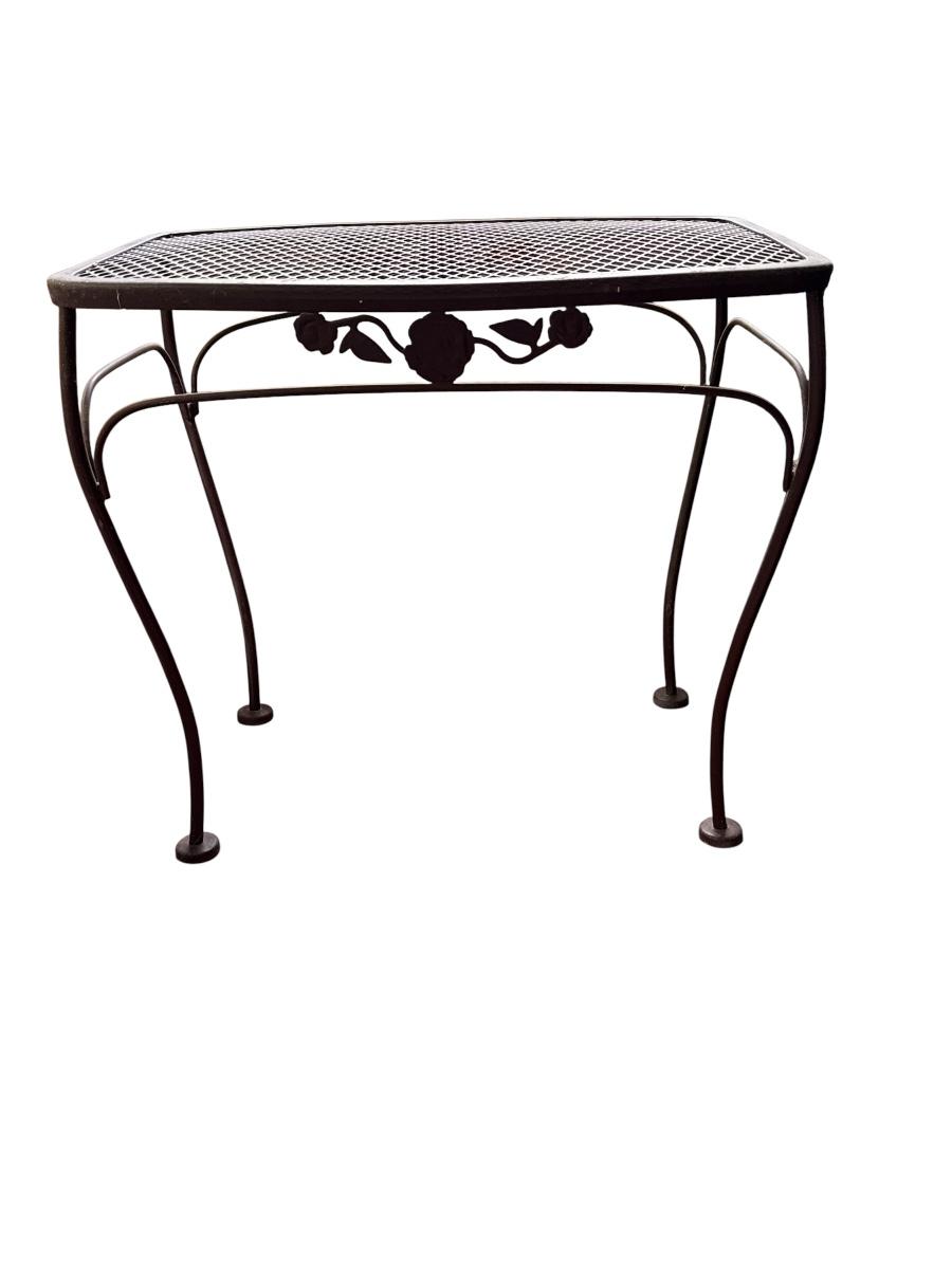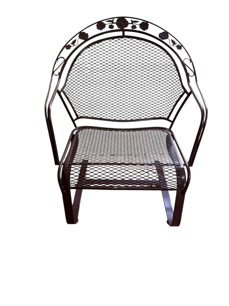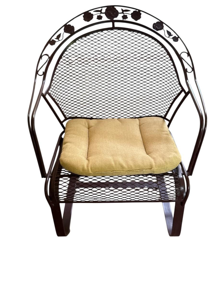 Lovely wrought iron bistro set featuring two garden chairs and a coordinating mesh-top table. Each chair has a rounded back with rose motif detailing and includes a plush, tan, removable seat cushions. The matching table features a floral design on the apron and curved legs for an elegant silhouette.
