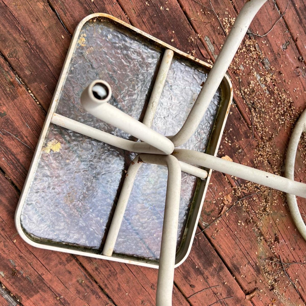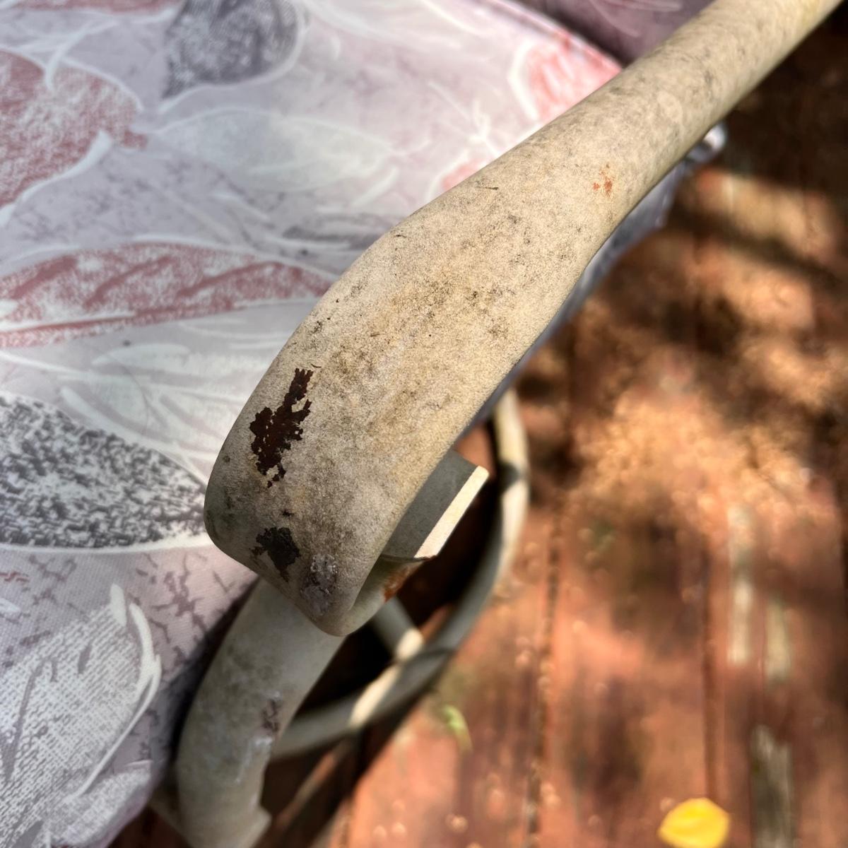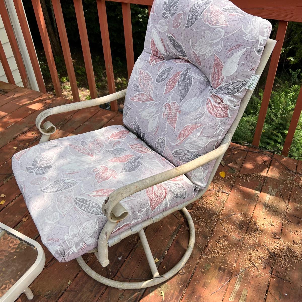 This pair of chairs could do with some TLC but they are structurally sound, just show signs of wear on the finish. A lick of paint and they will look great! They have springs which give a soft bounce, they do not swivel They have matching pale pink cushions with a leaf design that has faded from the sun, they were once upon a time green. The small table also has an issue as the plastic sections that hold the legs have broken; the table will work as expected but has to be moved carefully as the legs move when you pick it up.