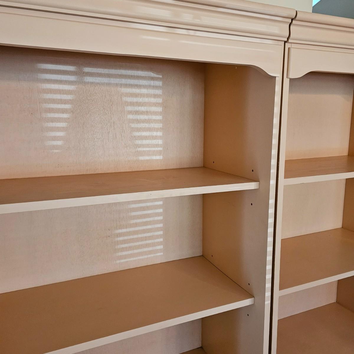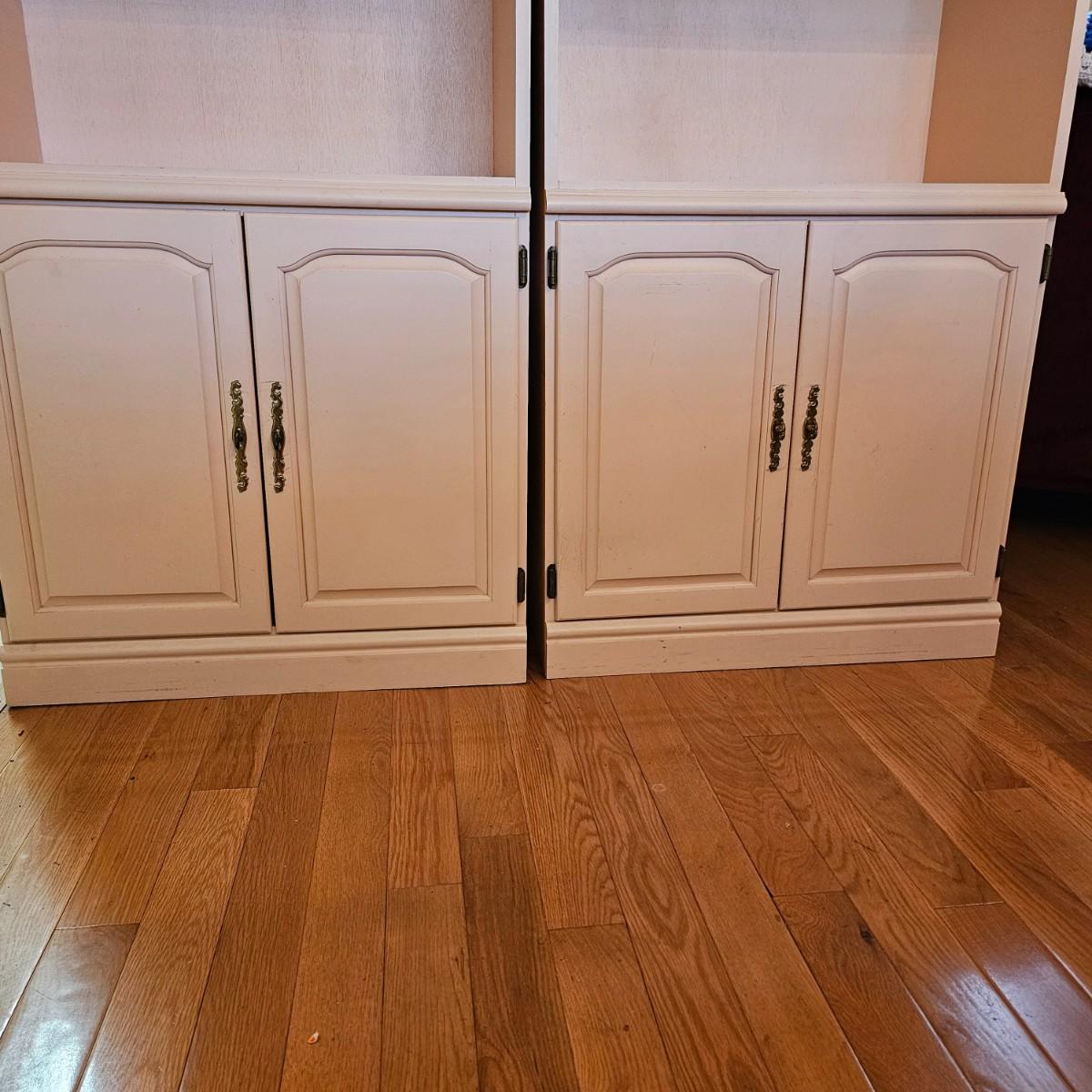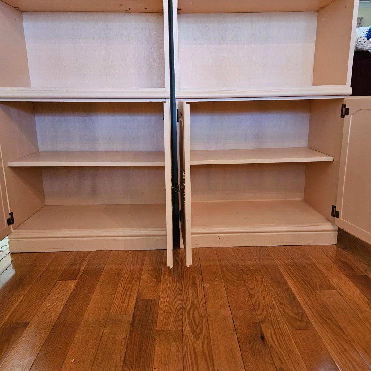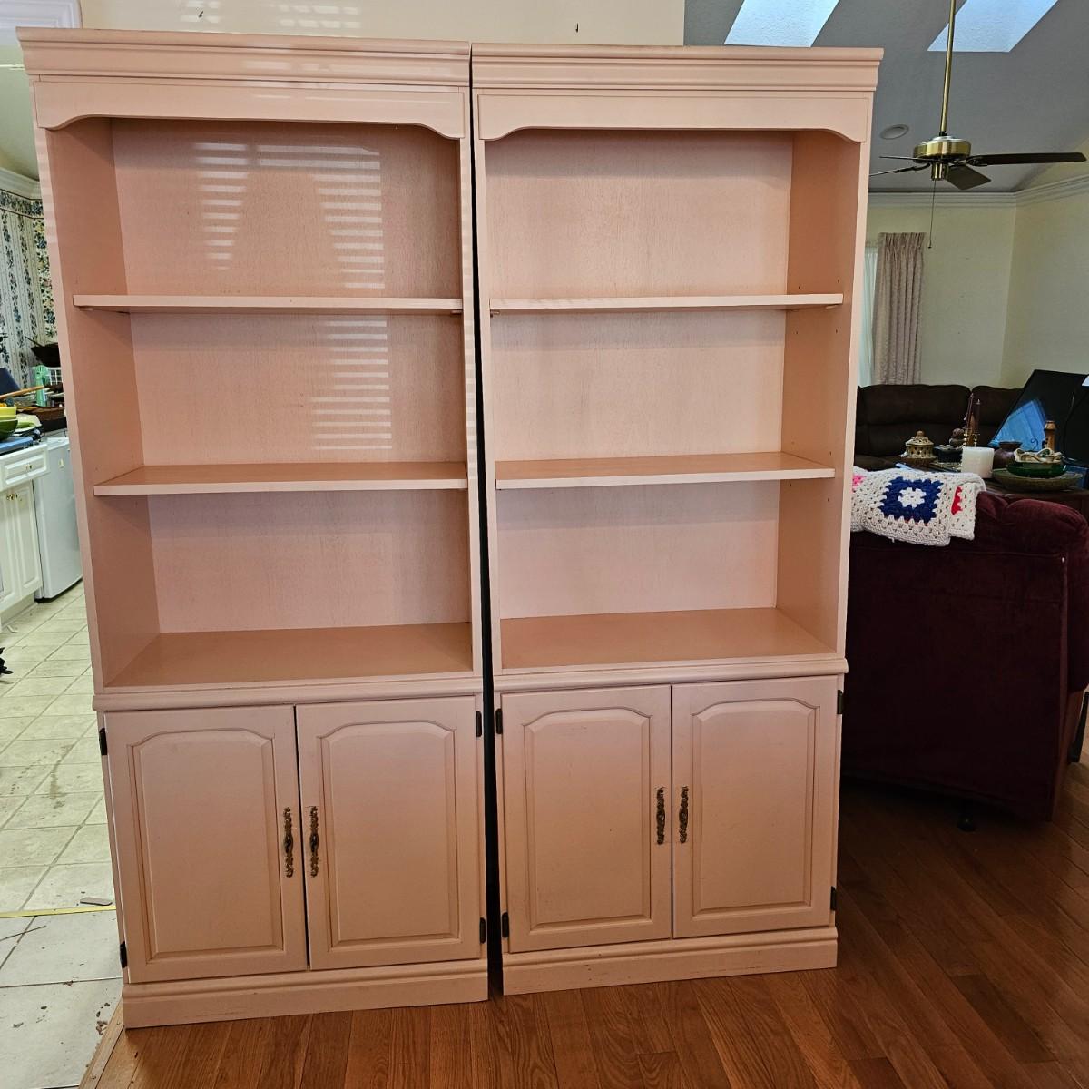 Matching pair of peach colored pine cabinets with shelves and storage cabinets. Each shelf is adjustable. Cabinets measure 30" x 16" x 76"H. Some discoloring on ends of cabinets. See photos for details. Local pickup only.