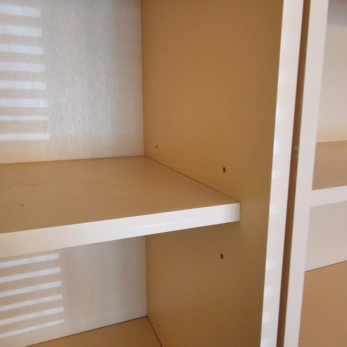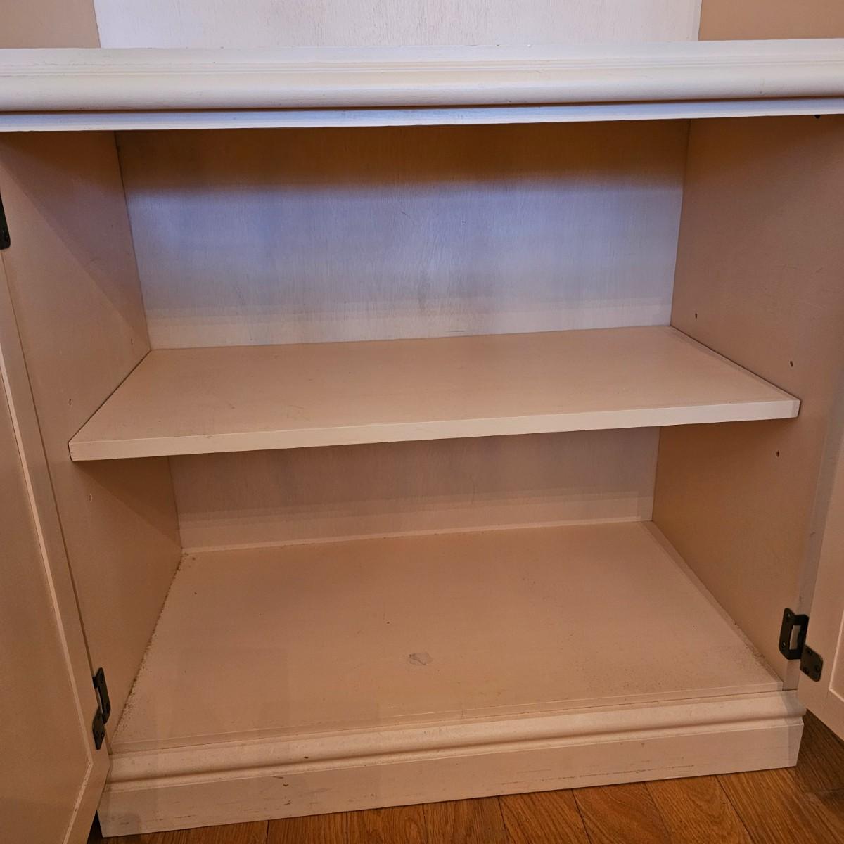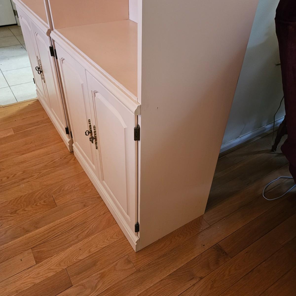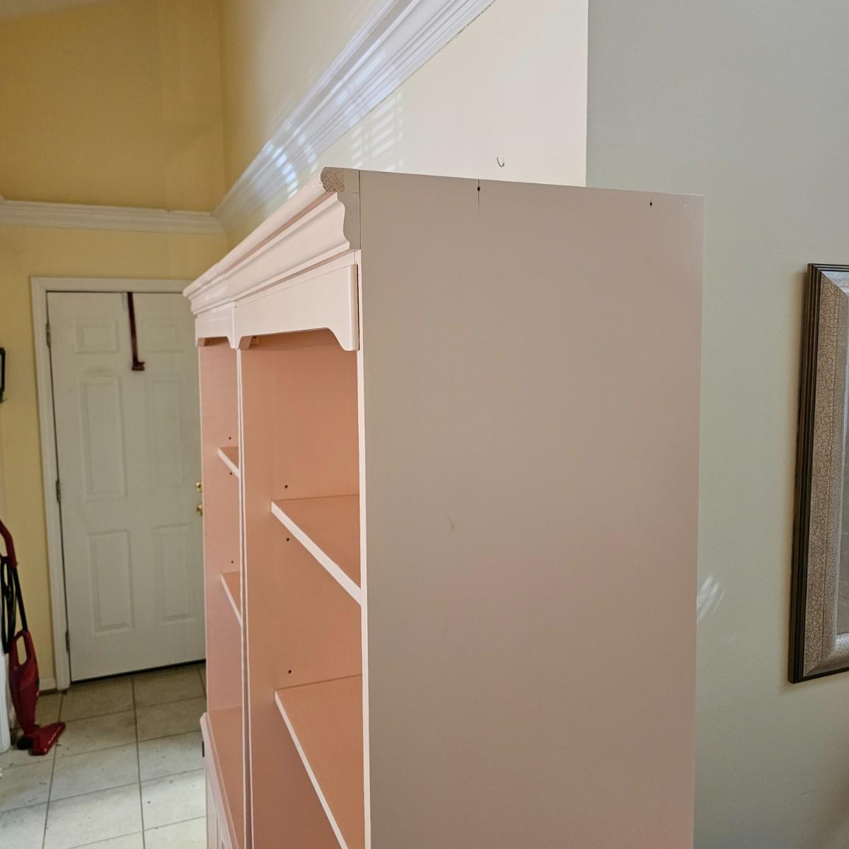Matching pair of peach colored pine cabinets with shelves and storage cabinets. Each shelf is adjustable. Cabinets measure 30" x 16" x 76"H. Some discoloring on ends of cabinets. See photos for details. Local pickup only.