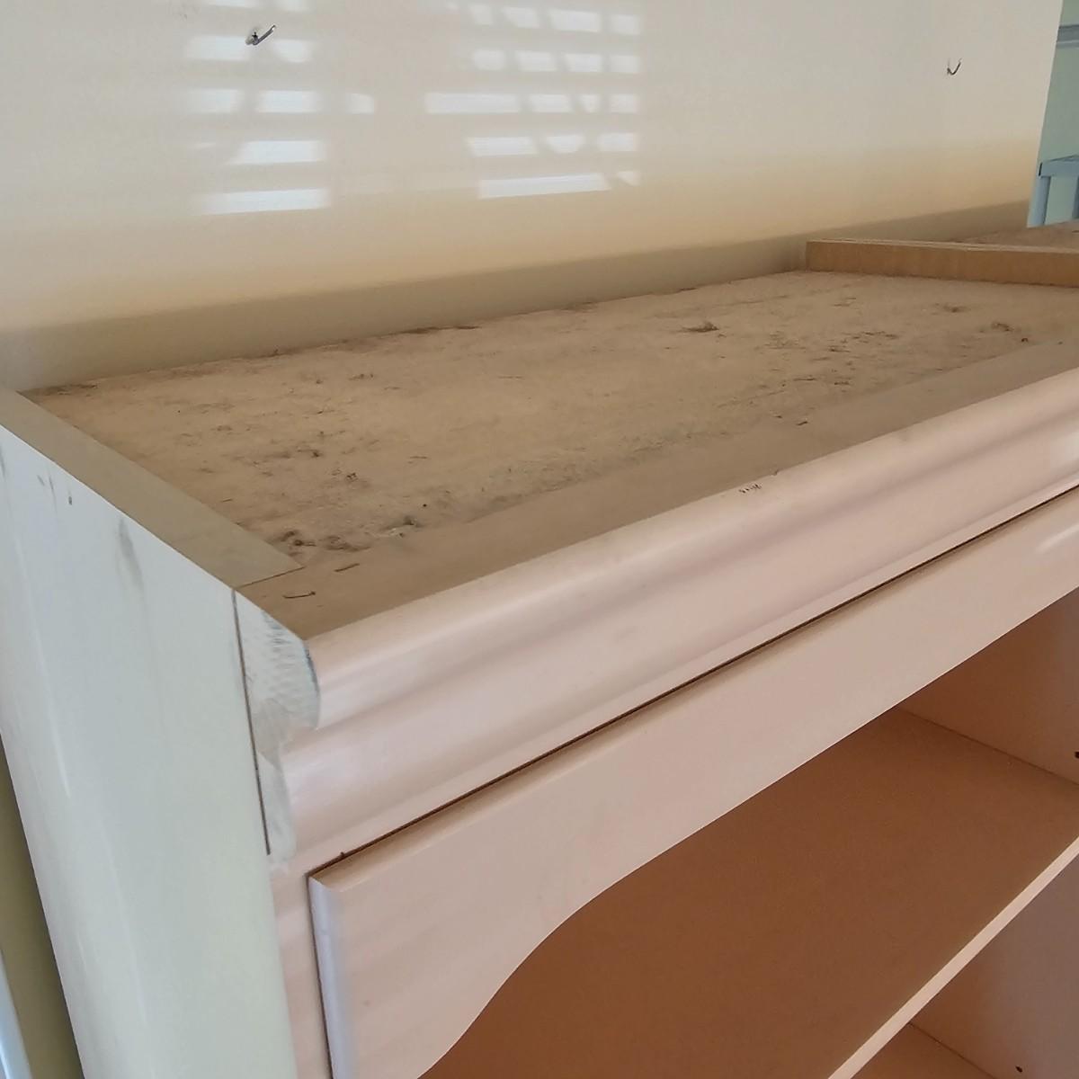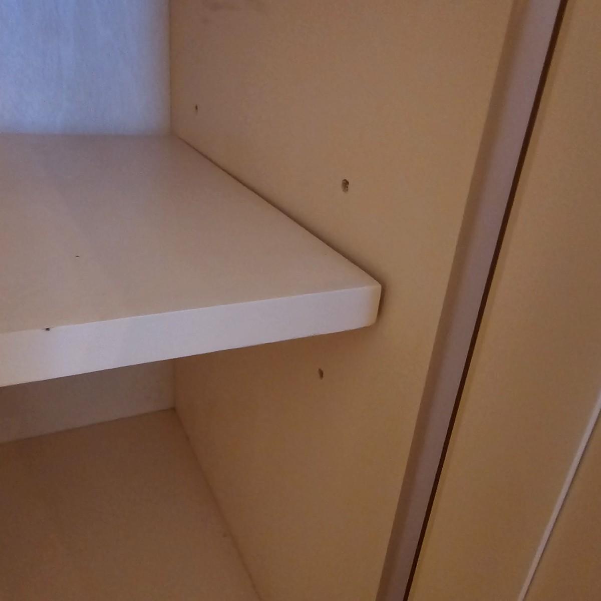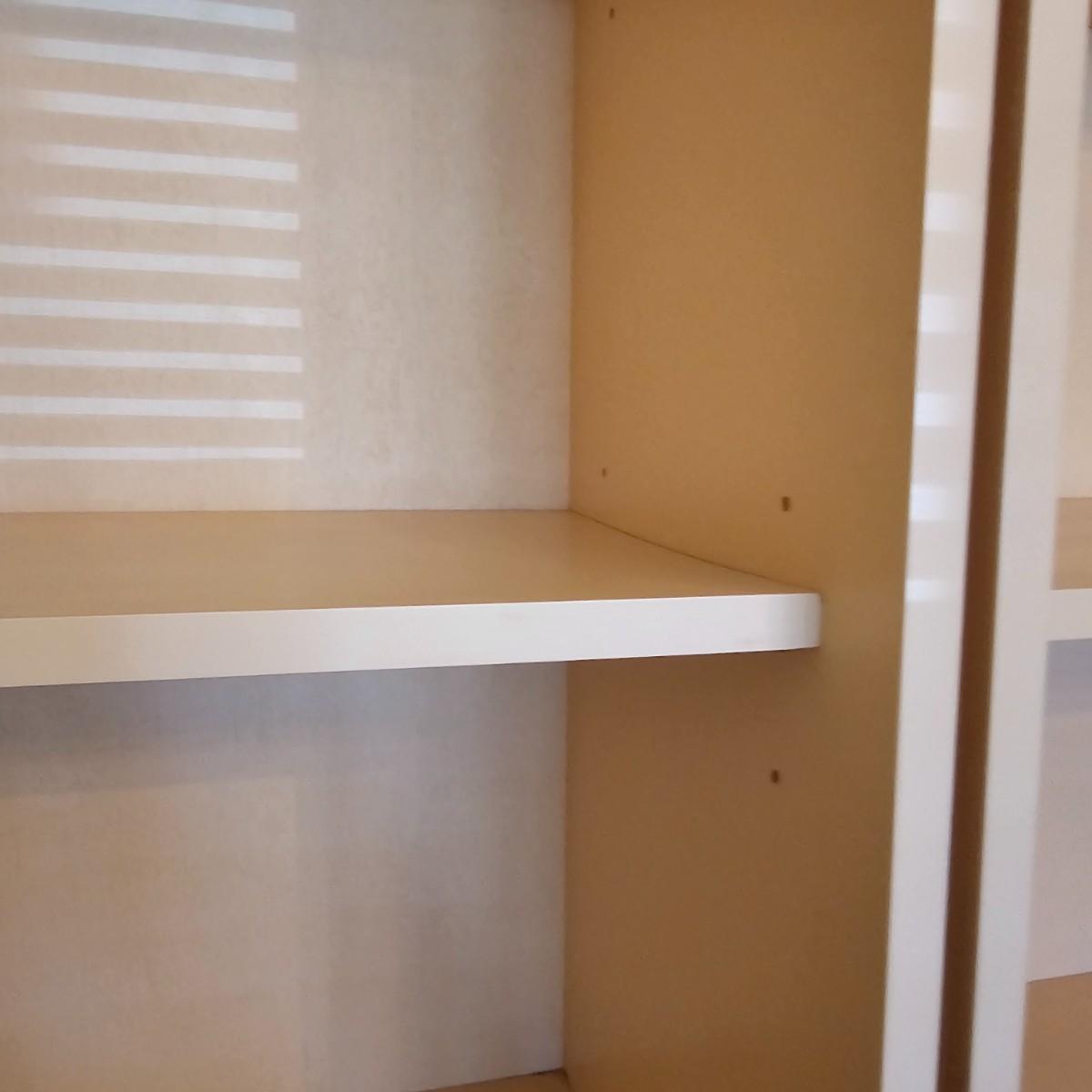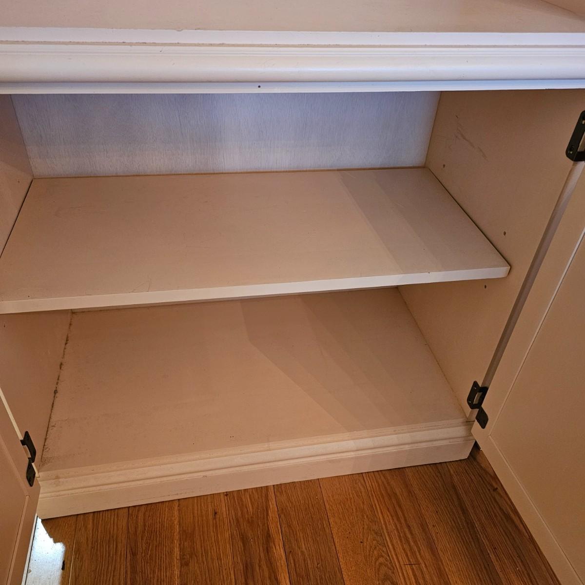 Matching pair of peach colored pine cabinets with shelves and storage cabinets. Each shelf is adjustable. Cabinets measure 30" x 16" x 76"H. Some discoloring on ends of cabinets. See photos for details. Local pickup only.