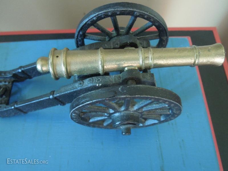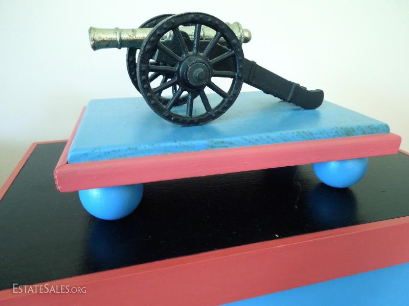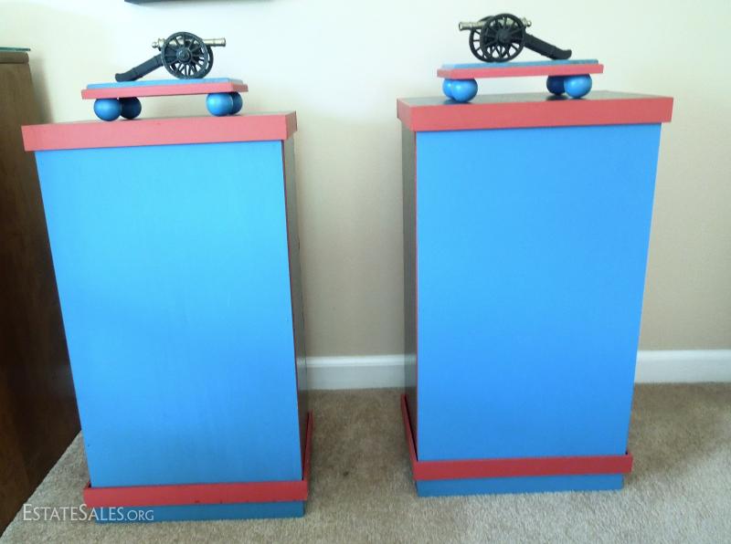 Homemade pedestal stands made from speaker cabinets. Displays metal miniature cannons on wooden base with ball feet. Tops of pedestal are removable. Stands are 25 x14x9. Canon base is 9x6. Very nice homemade condition.