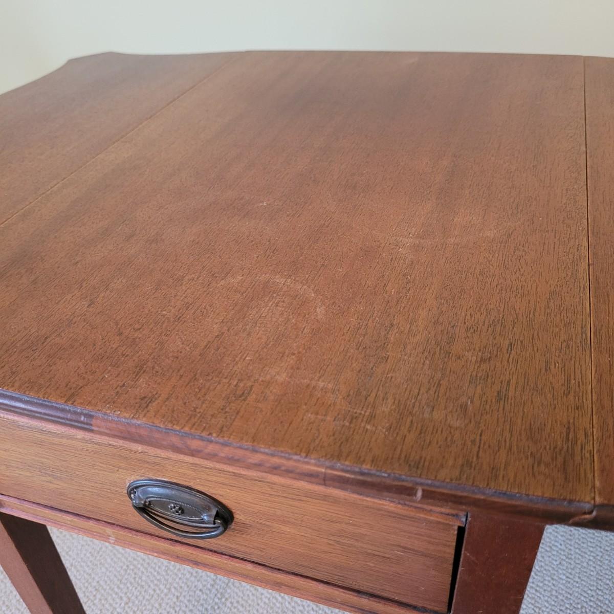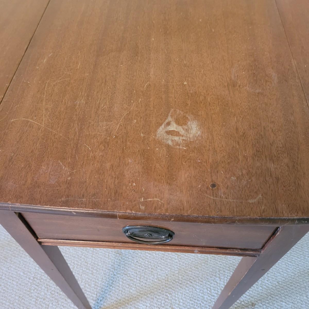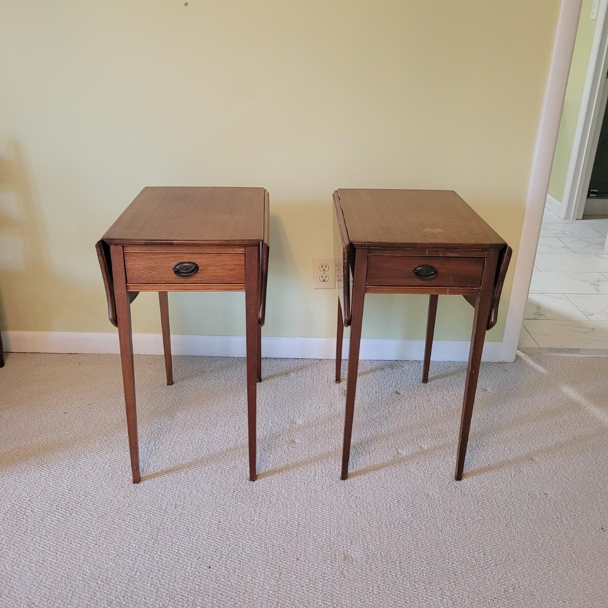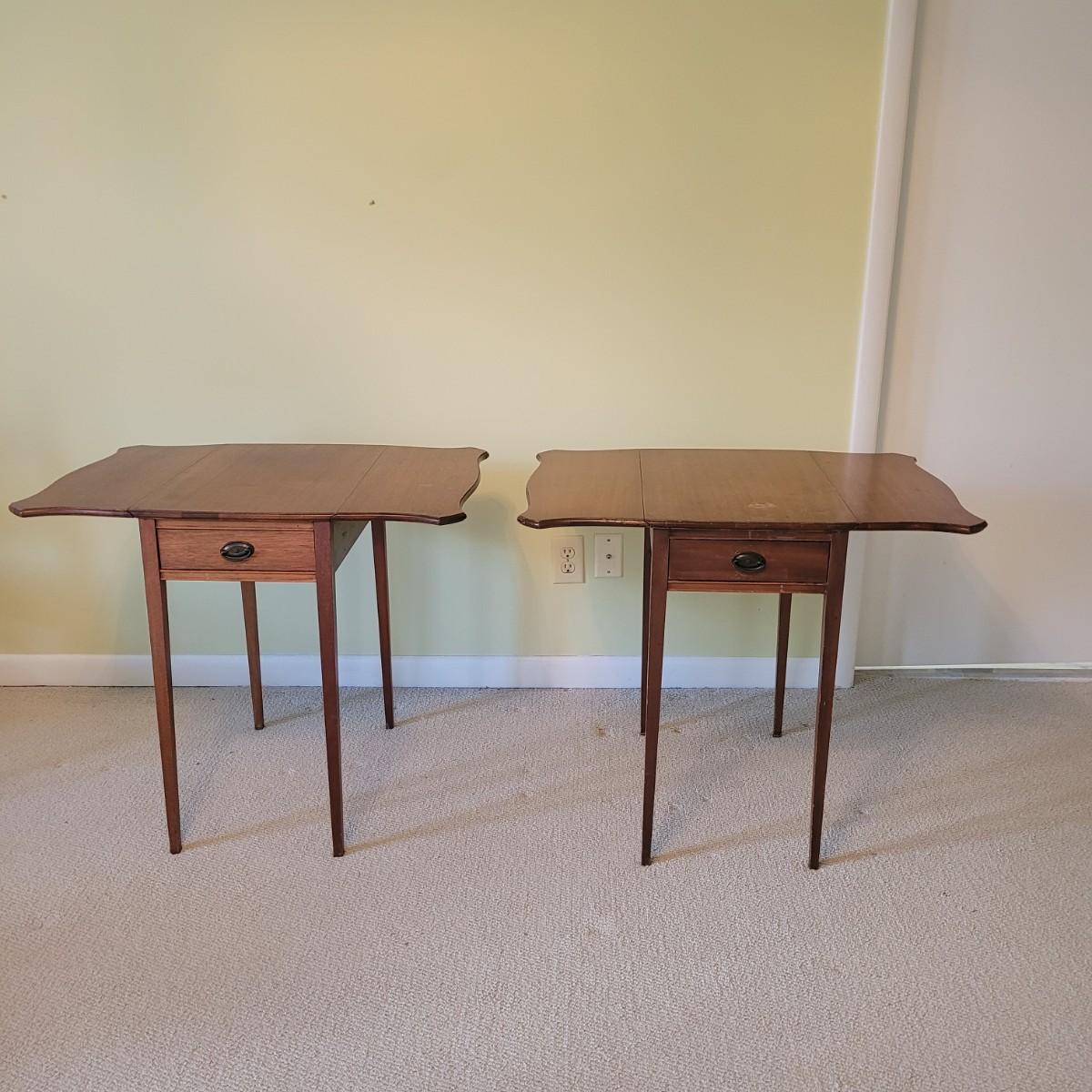This pair of Pembroke style drop leaf side tables has dovetail joints and easy slide levers for the leaves. Some scuffs and water marks throughout (see photos). Measure approximately 15.5" x 22" x 27"H, open leaves 31.5"W. Local pickup only.