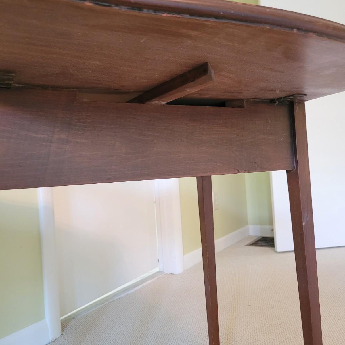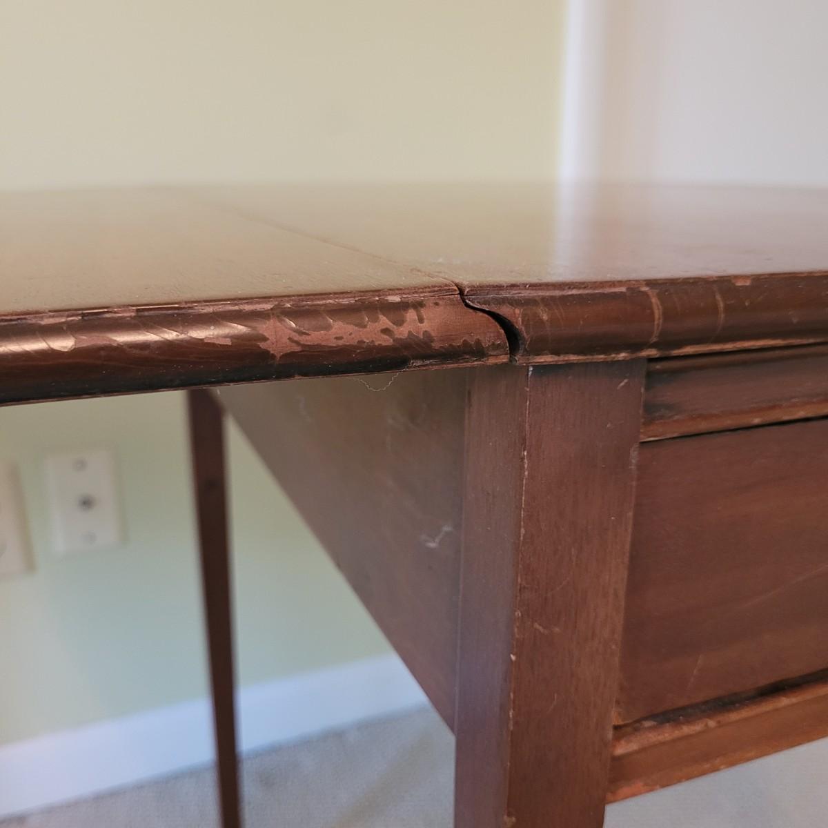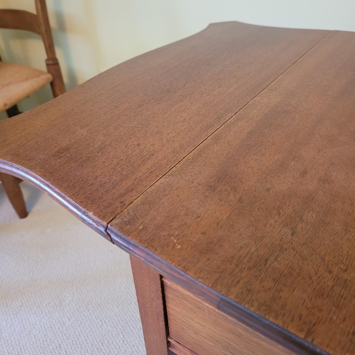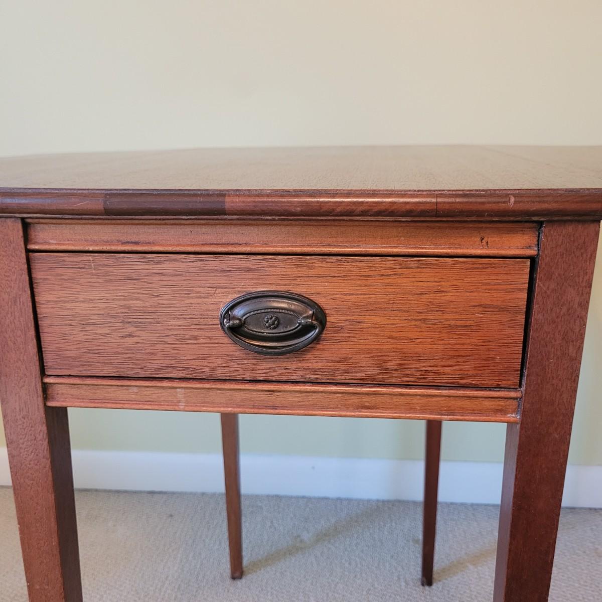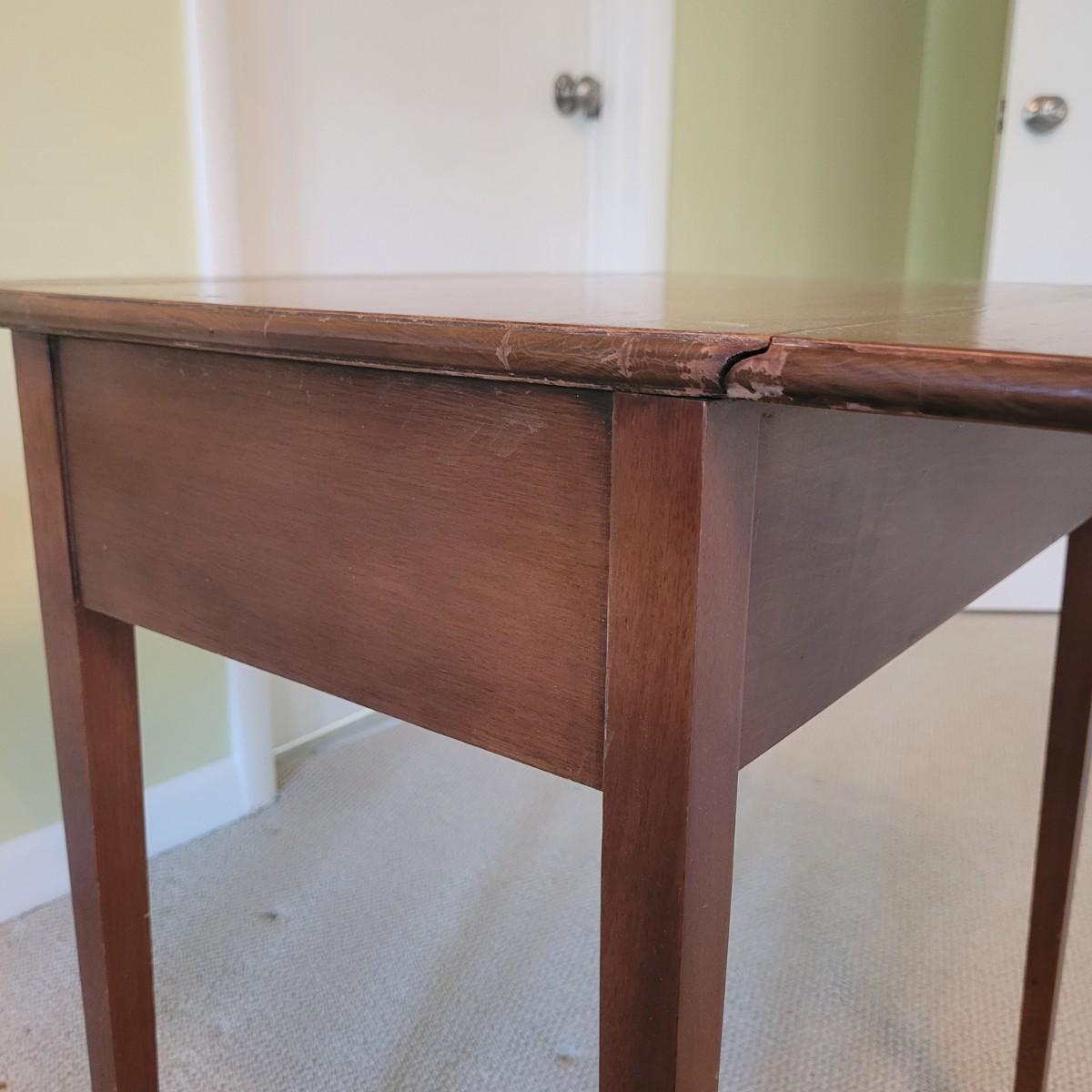 This pair of Pembroke style drop leaf side tables has dovetail joints and easy slide levers for the leaves. Some scuffs and water marks throughout (see photos). Measure approximately 15.5" x 22" x 27"H, open leaves 31.5"W. Local pickup only.