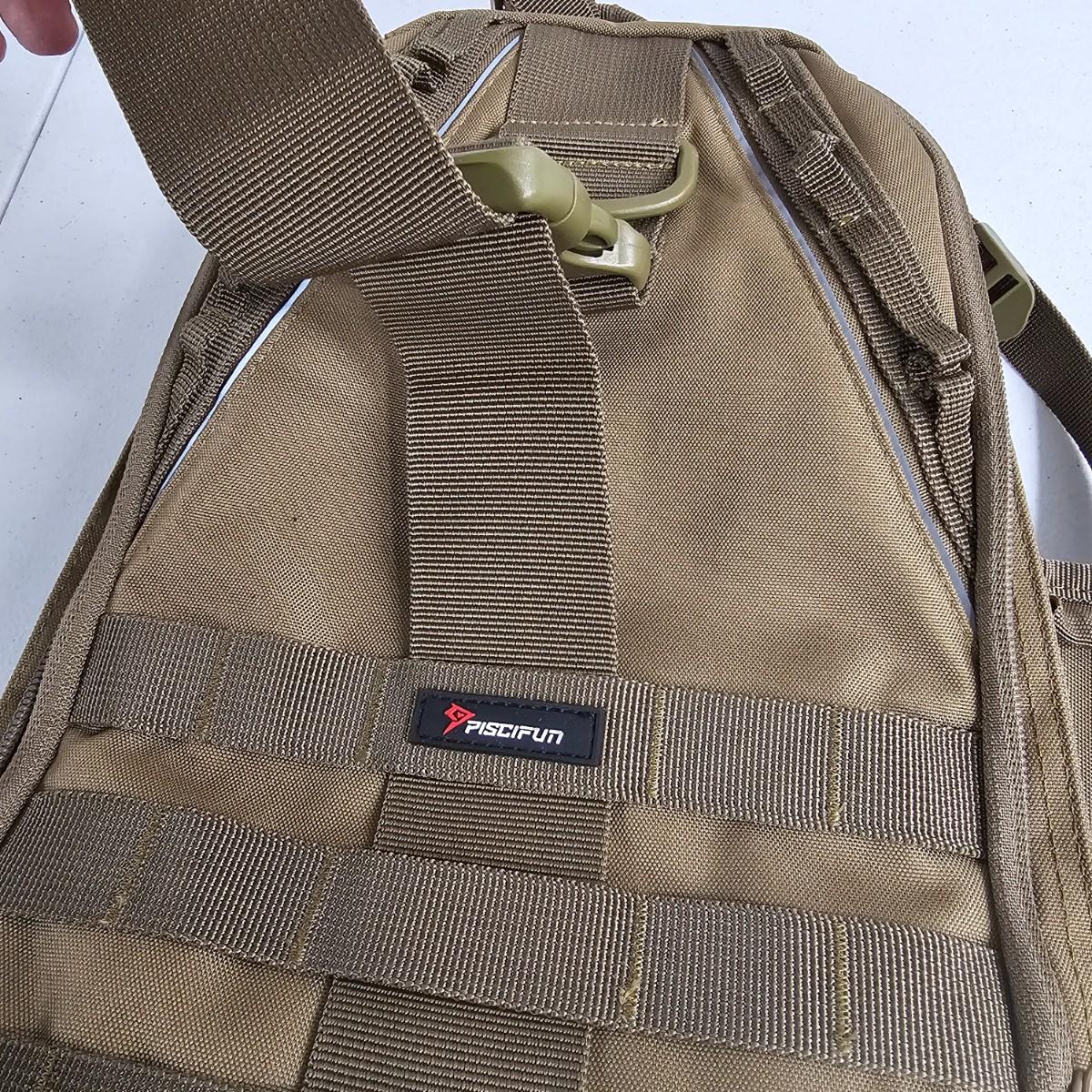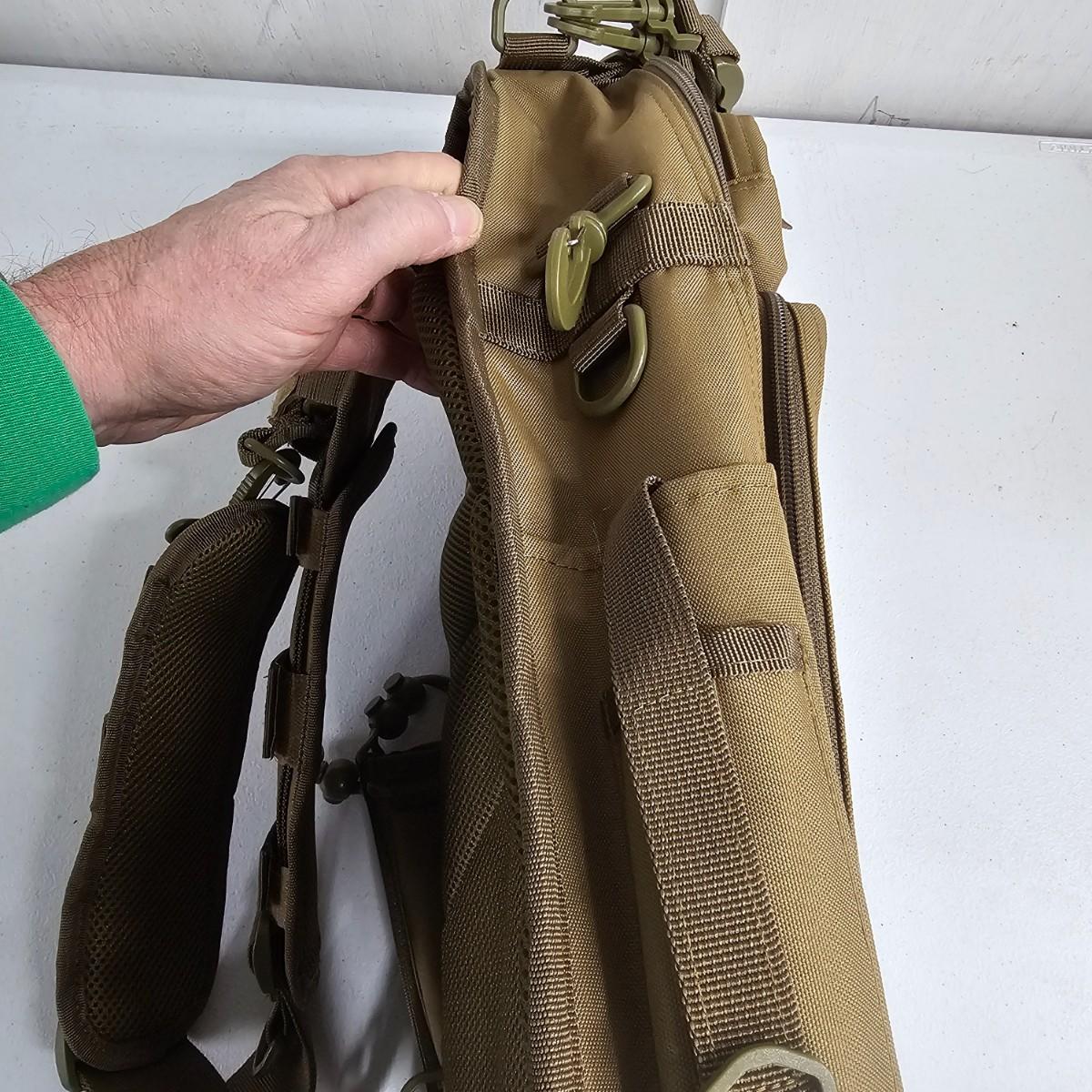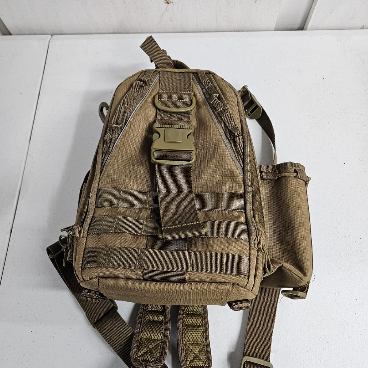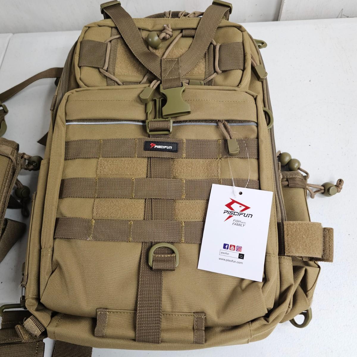 Two practically new backpack style bags by Piscifun. All khaki in color with reflective strips for night time visibility. Lots of pockets, pouches, straps for ease of transport. Carry handles on top, easy pull grips for all pouches. Large bag measures 15" x 8" x 20" H, smaller bag is 12" x 6" x 17"H. See photos for details. Shipping available.